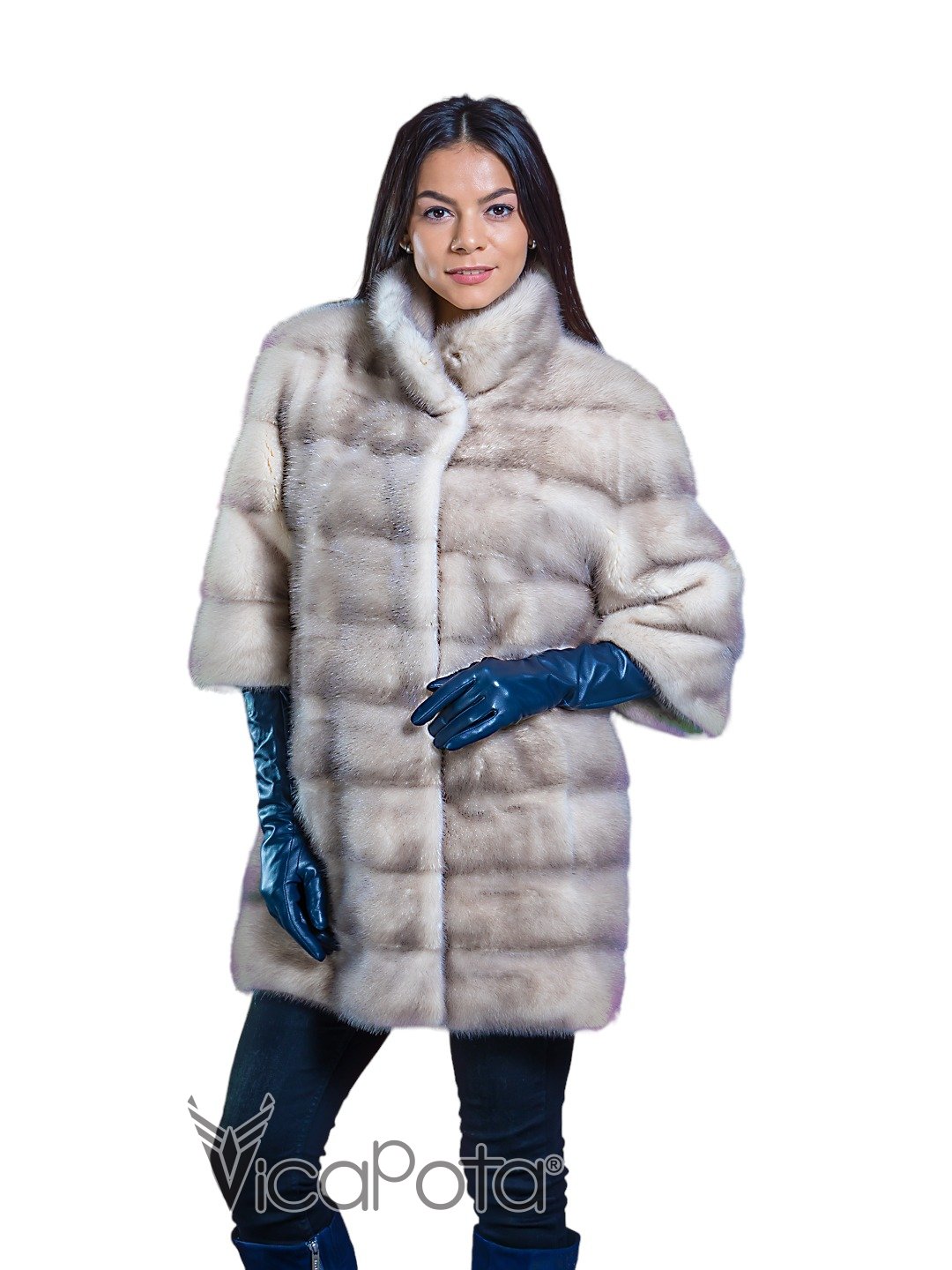 Норкова шубу з високоякісного хутра в кольорі колотий лід Рукав 3/4 Модель шуби викроєна із цільних шкурок норки поперечними смугами. Воріт приспущена стійка на гачку .Фурнітура шубні гачки бежевого кольору. Є дві робочі кишені. Шикарно підійде під вечірній образ леді, також повсякденний діловий стиль. Розмір :46-48. Довжина:76 см