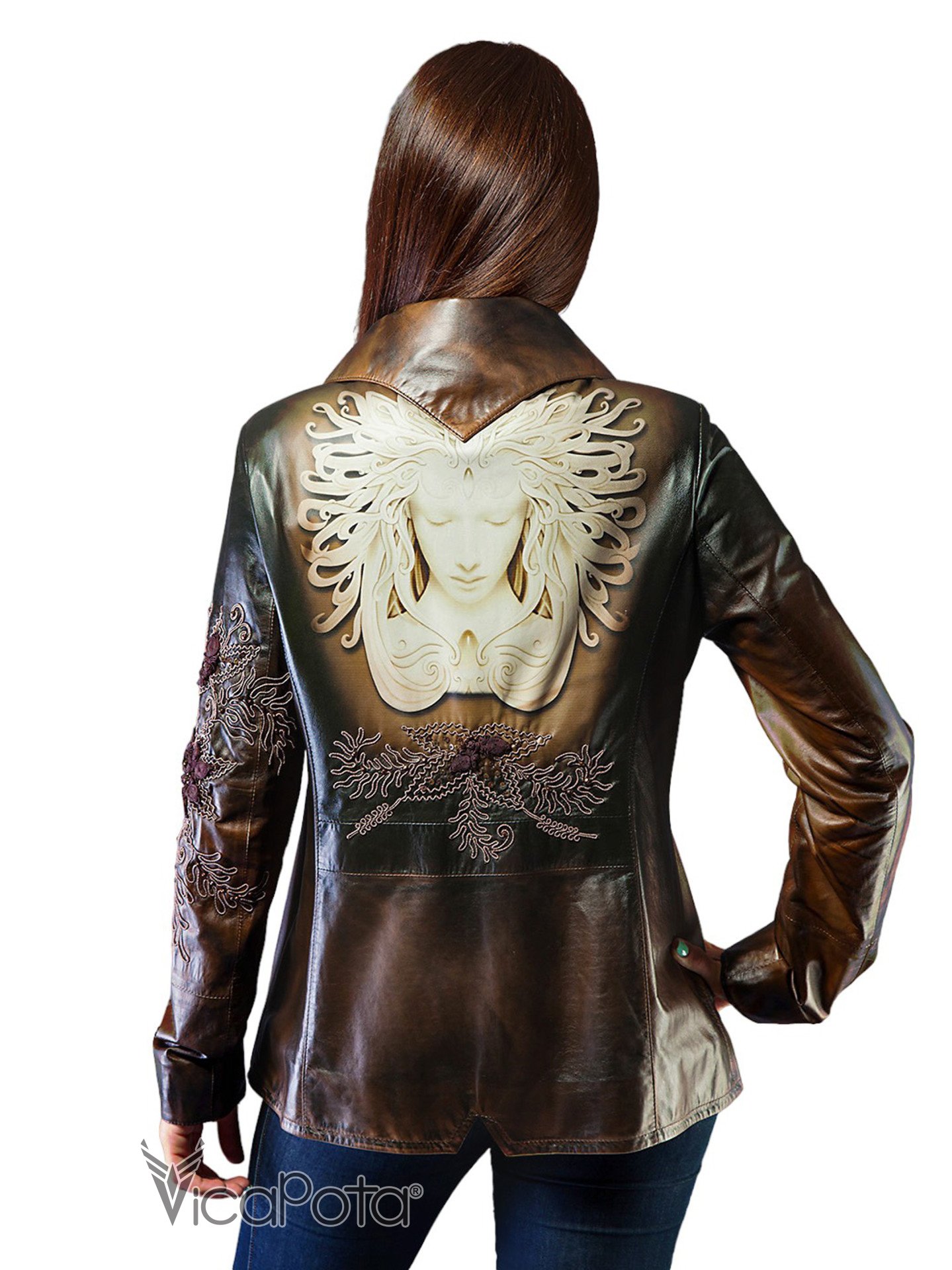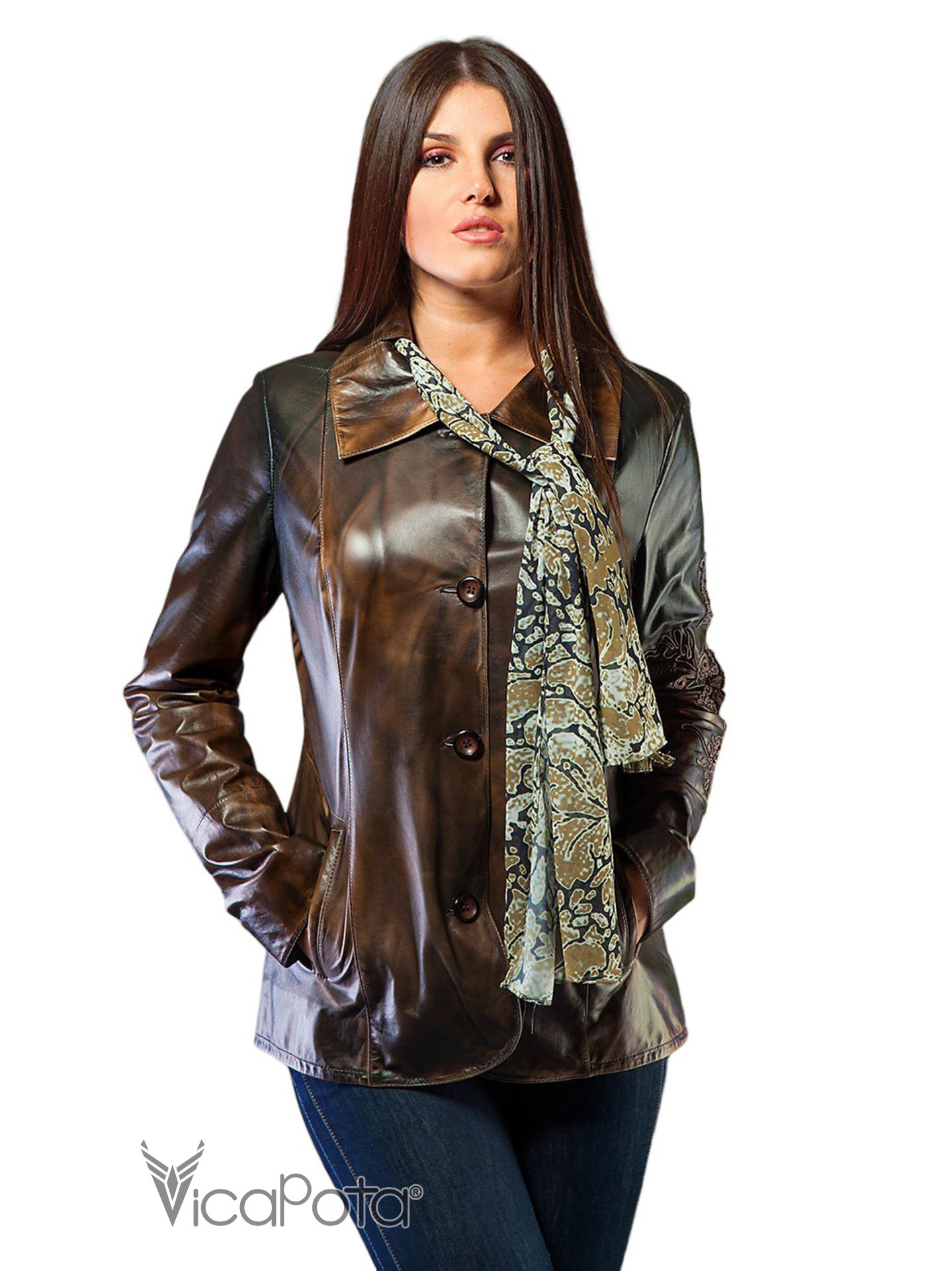 Жіноча ексклюзивна шкіряна куртка із сорочковим коміром. Натуральна шкіра й натуральні органічні фарби були використані при виготовленні для Вас цього унікального виробу. Художня складова розроблена й виконана вручну професійним художником. Комір доповнений не що зобов'язує, елегантним шовковим шарфиком. Кишені бічні. Елементи ручної вишивки надають виробу неповторну елегантність. Куртка на ґудзиках підібраних до кольору шкіри. Виміри по куртці Довжина виробу 62 см. Груди 49 см, Талія 46 см, Плечі 39 см, Рукав 69 см, По низу 52 см.