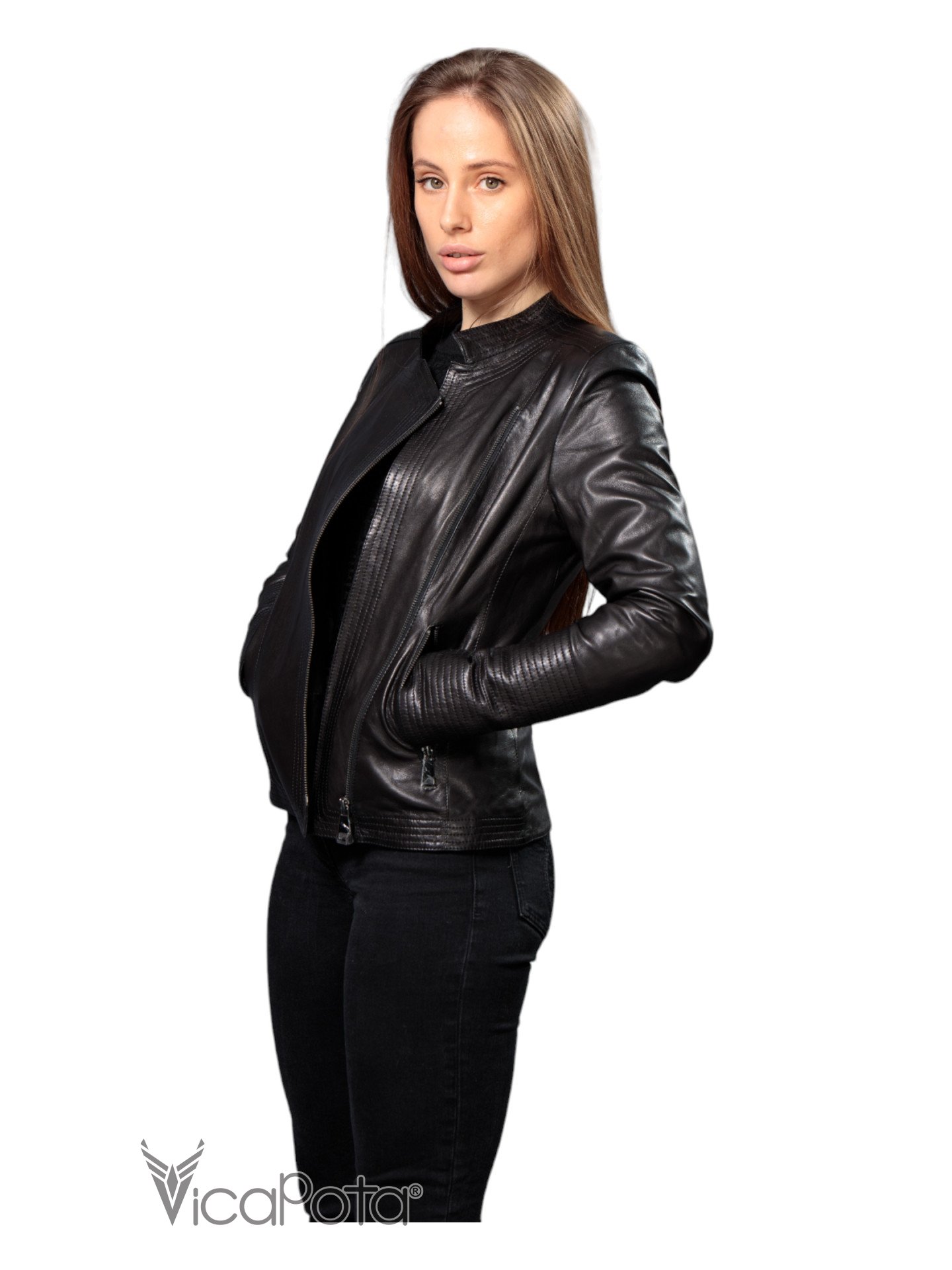 Стильна шкіряна жіноча куртка зі стійкою, чорного кольору виготовлена з високоякісної натуральної італійської овечої шкіри vetvay, м'якої й приємної, що робить куртку комфортної в носку. Куртка з діагональною блискавкою, кольору блек нікель японського бренда YKK, дві бічні кишені на змійках. Багато складних елементів і декоративних рядків, що підкреслюють стиль куртки. Силует приталений.