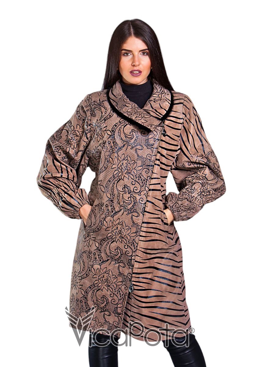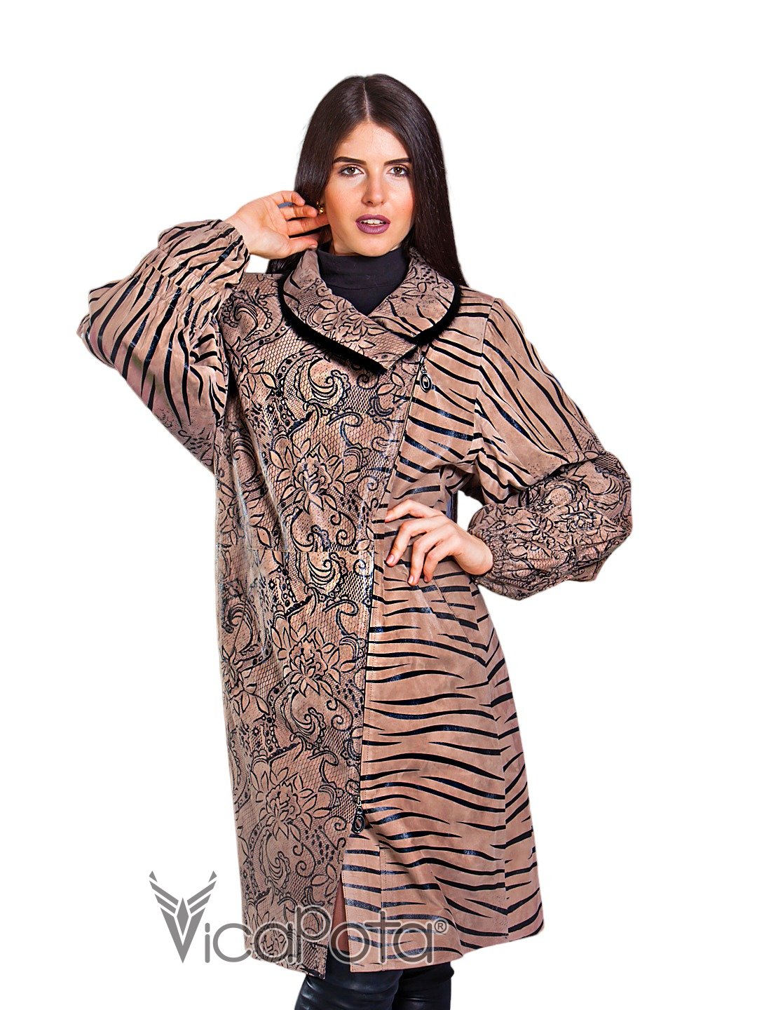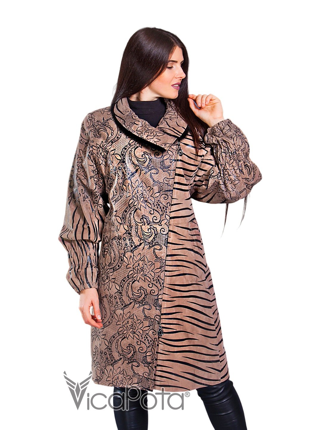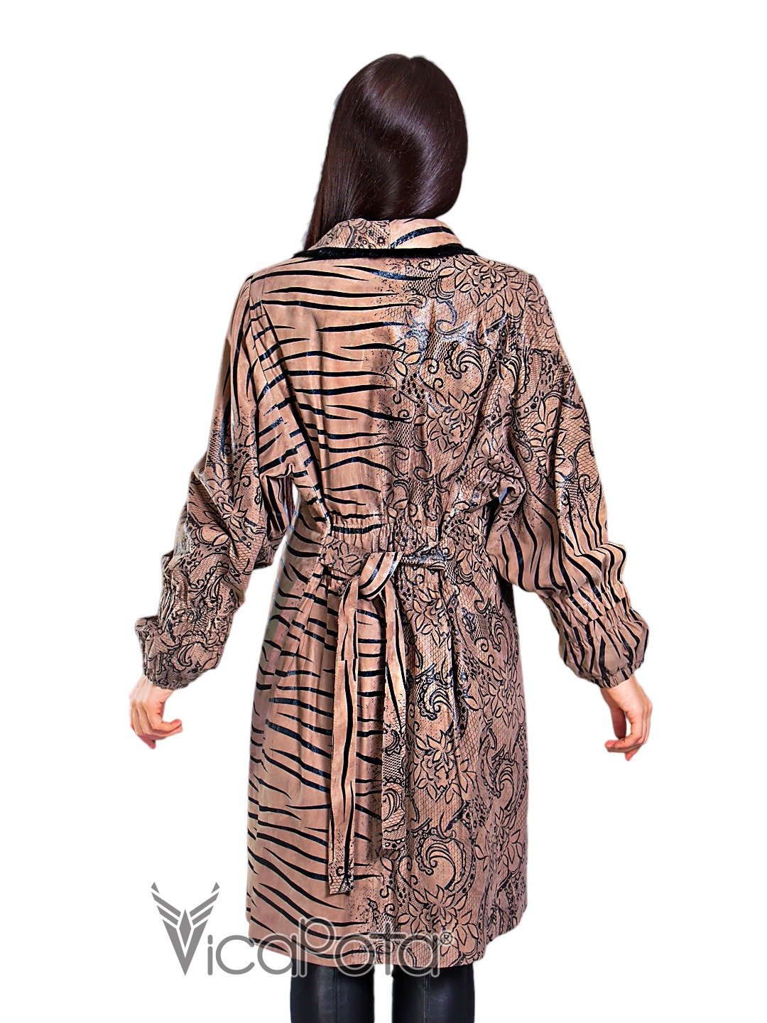 Жіночий шкіряний кардиган з високоякісної турецької натуральної шкіри(овчина) бежево-чорного кольору. Імітація шкіри зебри й квітів . Орнамент на шкіру наноситися шляхом лазерного принта. Довжина виробу 103 см. Фурнітура фірмова – блискавка в темному кольорі. Стійка коміра й планка декорована смужкою натуральної чорної норки. Утеплення тонкий синтепон. Гумка на спині перехідна в пояс підкреслює талію. Є дві бічні кишені на магнітах. Сезон весна-глибока осінь. Модель цього кардигану завжди буде актуальна й підкреслить Ваш смак і почуття стилю. Виміри по куртці Довжина виробу 104 см. Груди 56 см, Талія 51 см, Плечі 42 см, Рукав 67 см, По низу 58 см.
