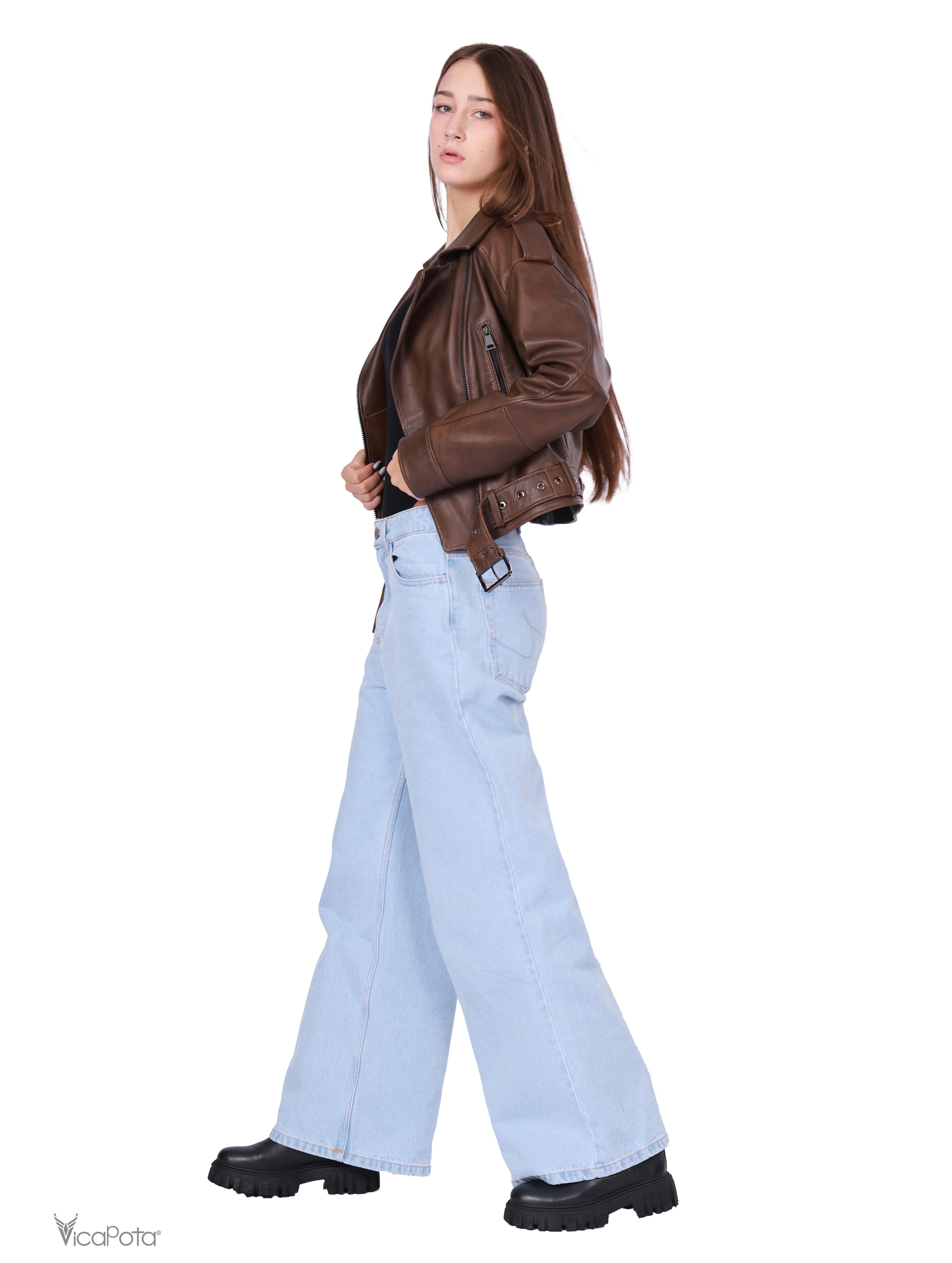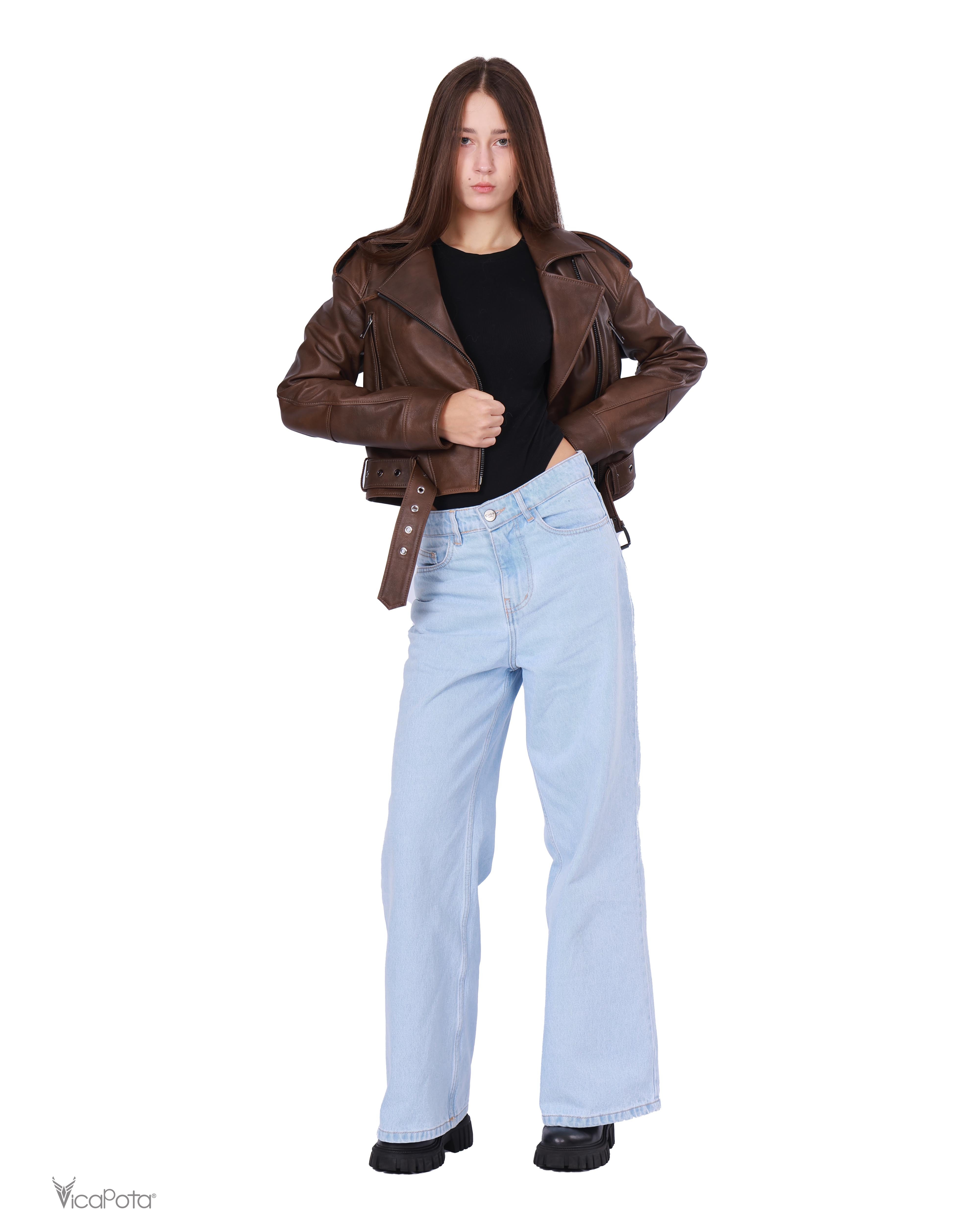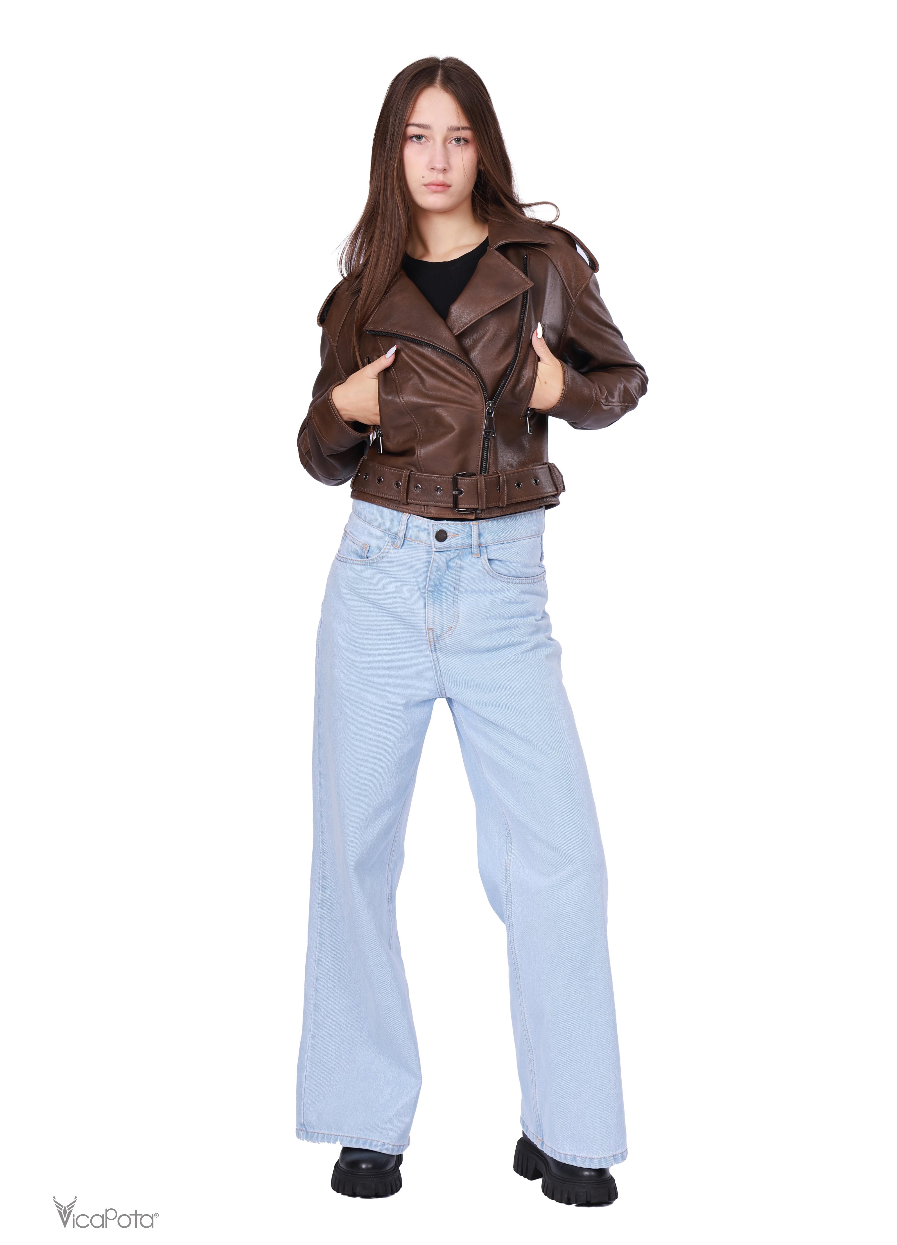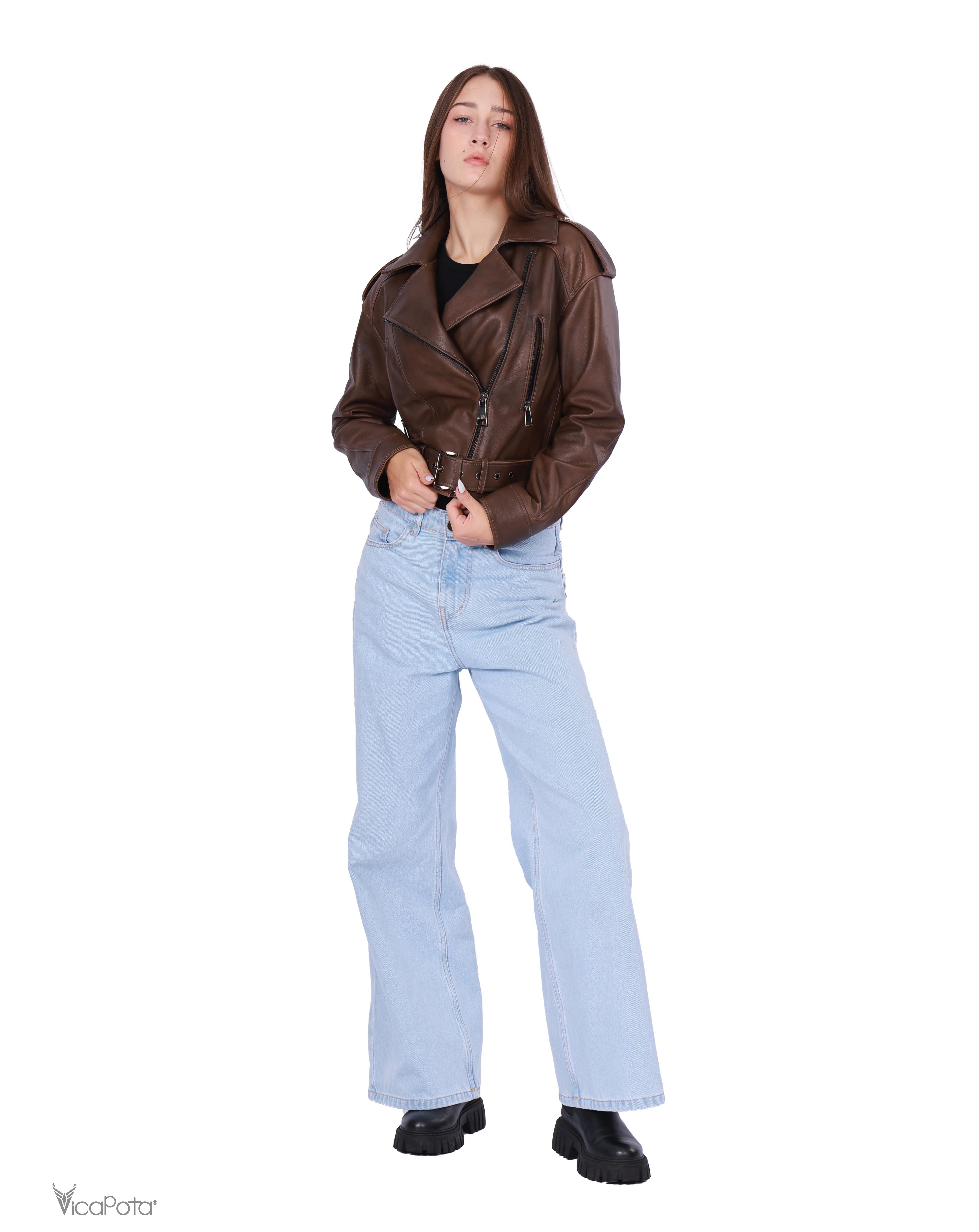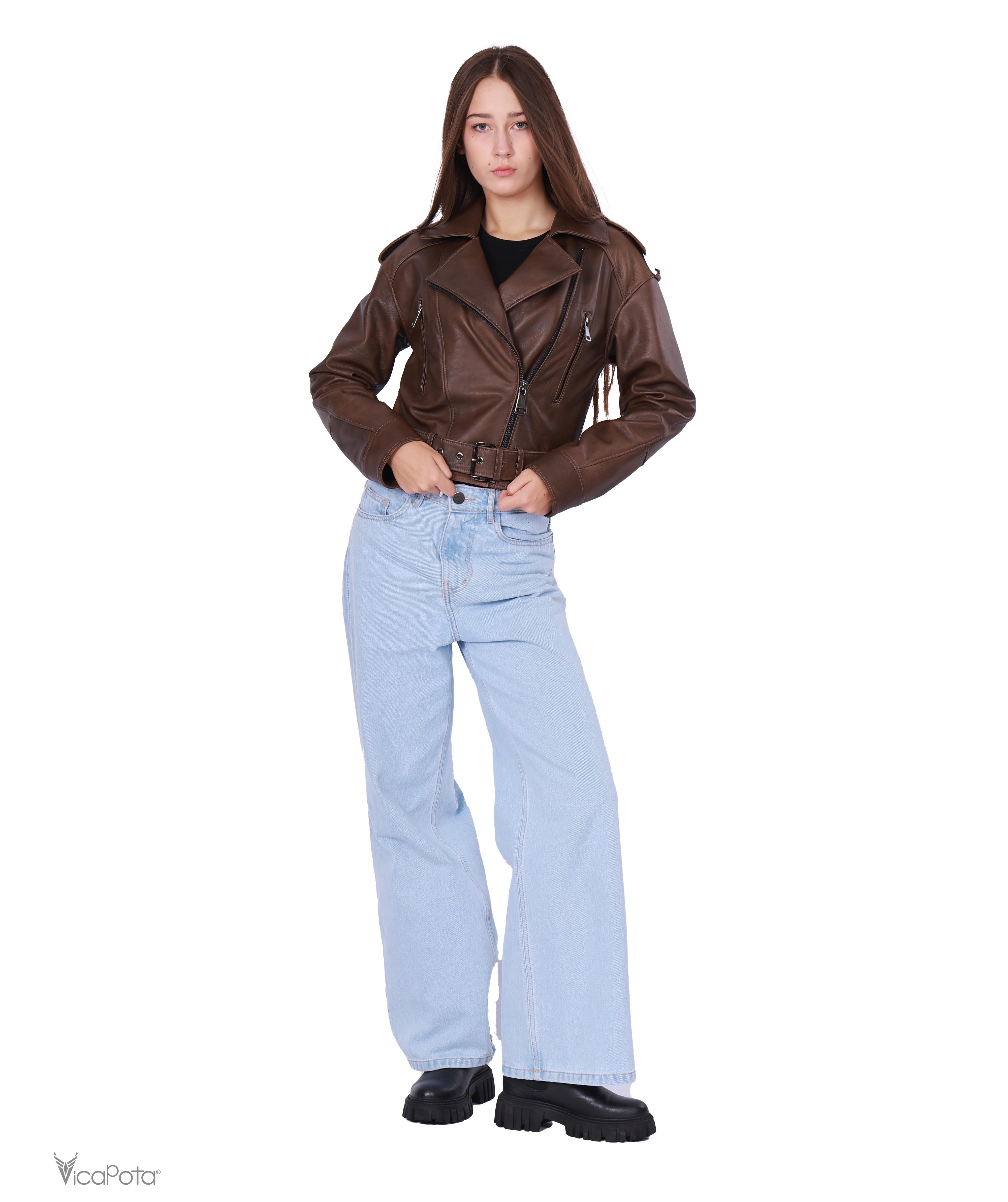 Ця жіноча коротка куртка-косуха з натуральної телячої шкіри преміум-класу стане стильним акцентом вашого образу. Довжина куртки 48 см, що робить її ідеальним вибором для тих, хто шукає зручність та елегантність. Куртка оснащена поясом на пряжці, що підкреслює талію і додає додатковий акцент на стиль байкерської косухи.