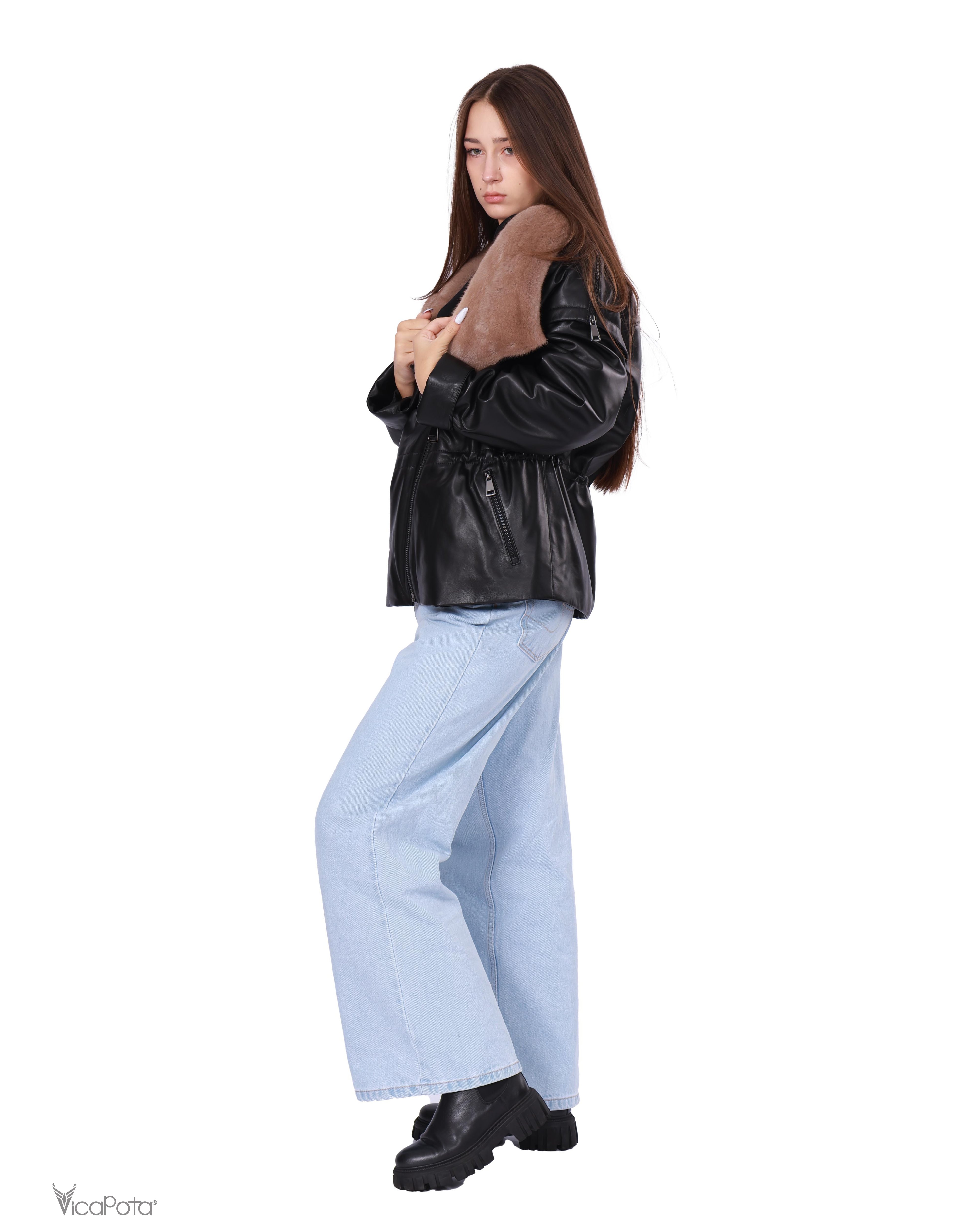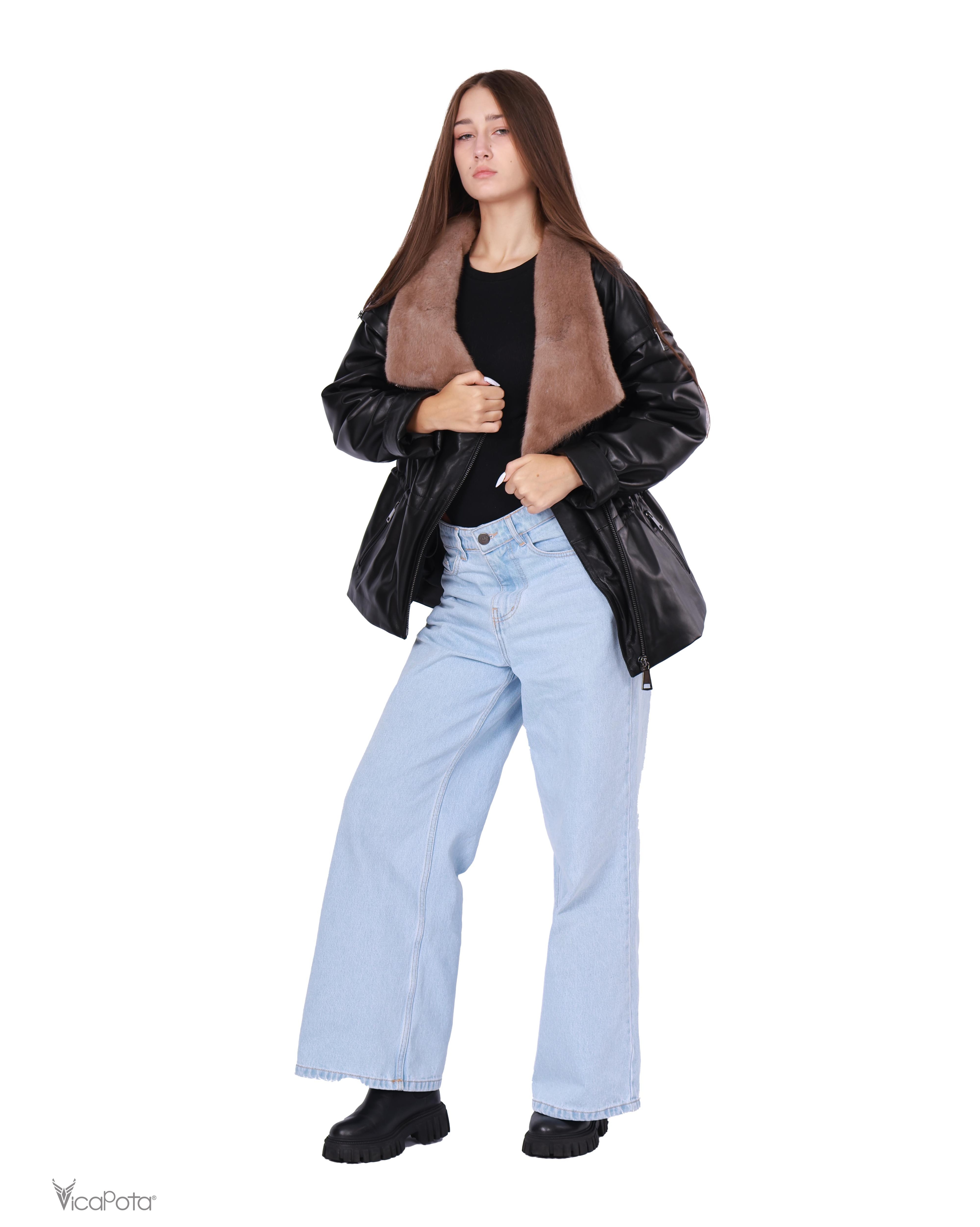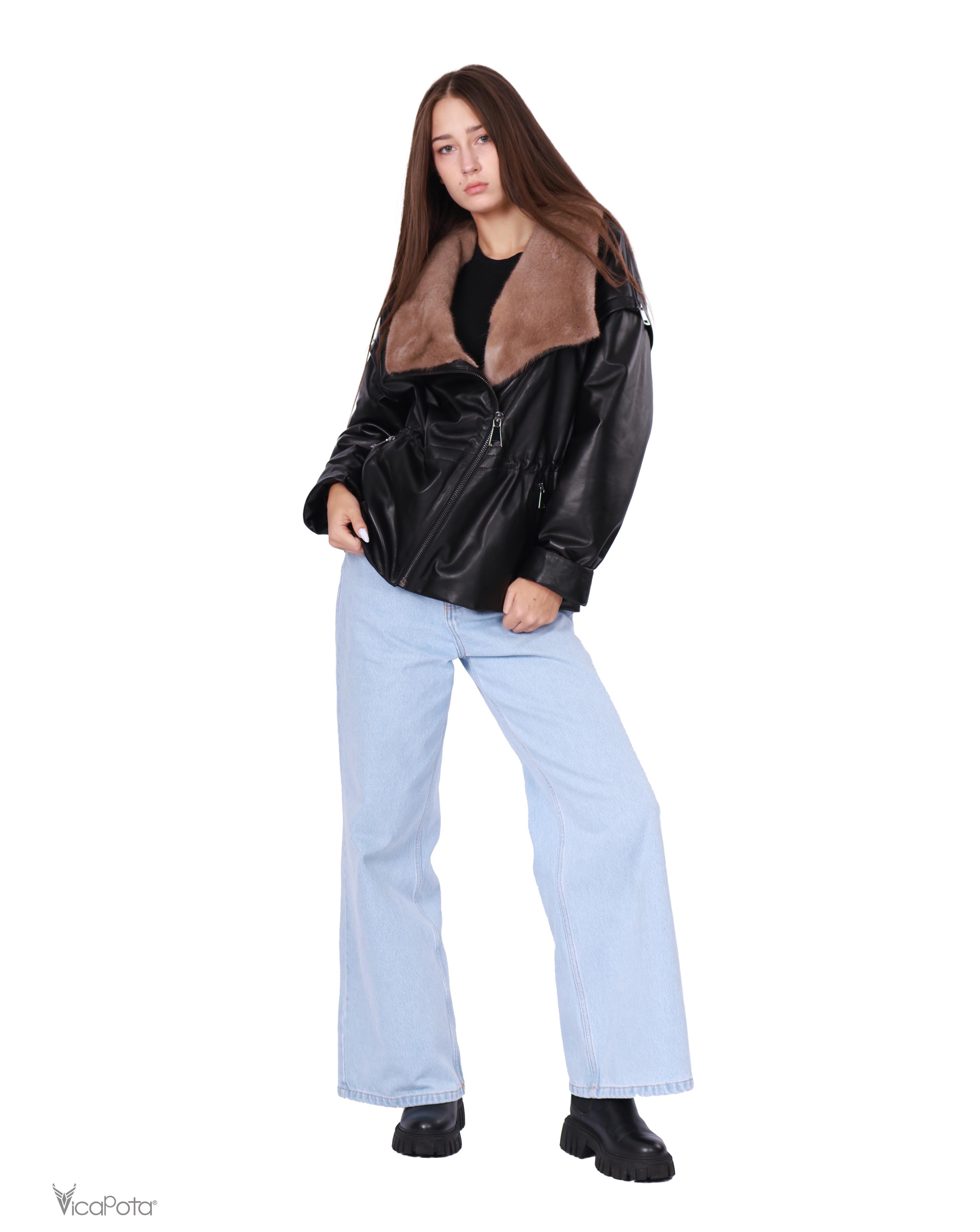 Жіноча шкіряна куртка з натуральної шкіри з коміром з норки, утеплена, 70 см, чорна, Туреччина