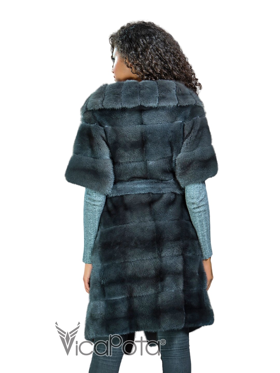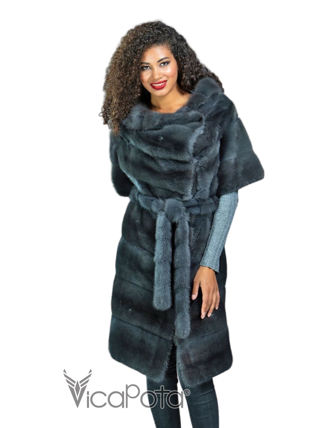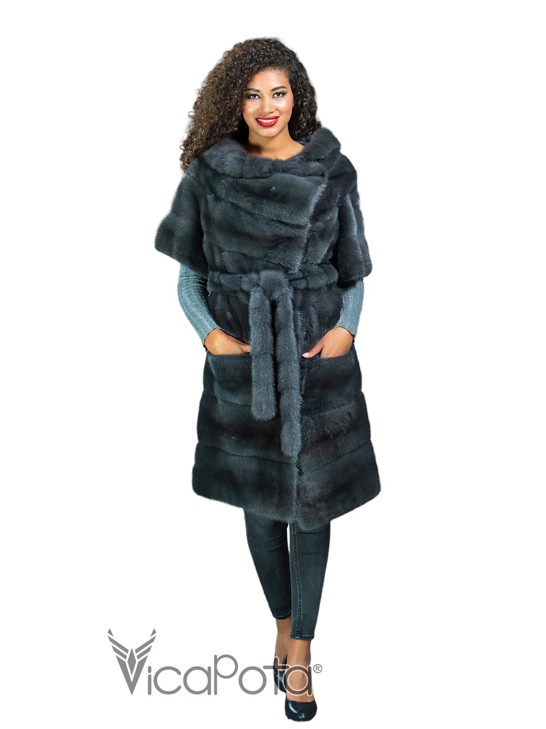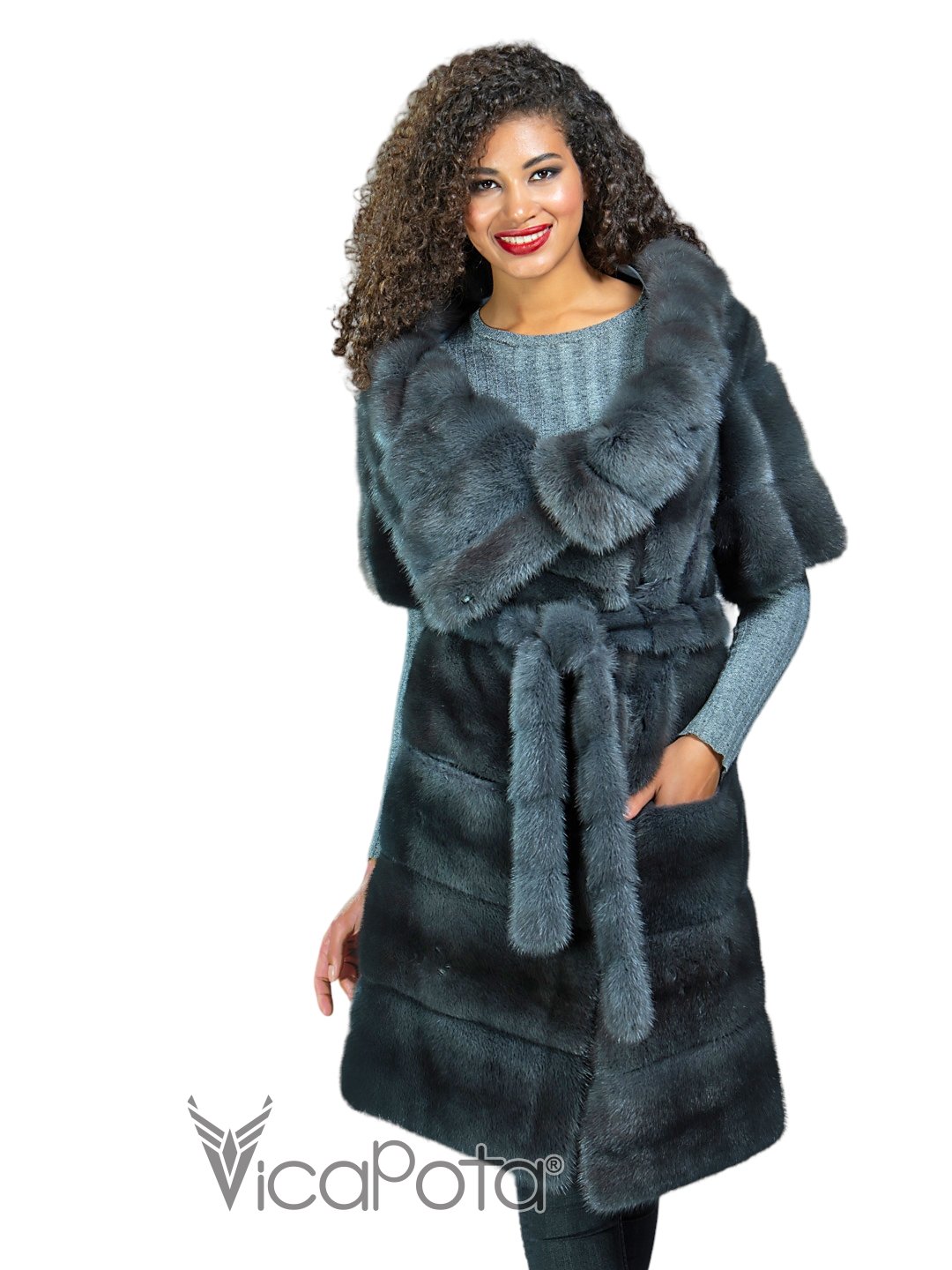Норкова шуба в кольорі графить. Виріб пошитий з високоякісного хутра норки. Колекція лімітована й ексклюзивна. Шуба легкого трапецієподібного крою із шикарним коміром на захід, який при бажанні можна носити розкритим, вигідно підкреслюючи декольте. Фурнітура шубні класичні гачки темного кольору. Довжина шуби 90 см. Є дві функціональні кишені на кнопках. Хутро норки викладений широкими поперечними горизонтальними смугами. Рукав у довжині 3/4 прекрасно сполучається з високими шкіряними рукавичками, а пояс вигідно підкреслить талію й зробить дану модель універсальної по стилю.