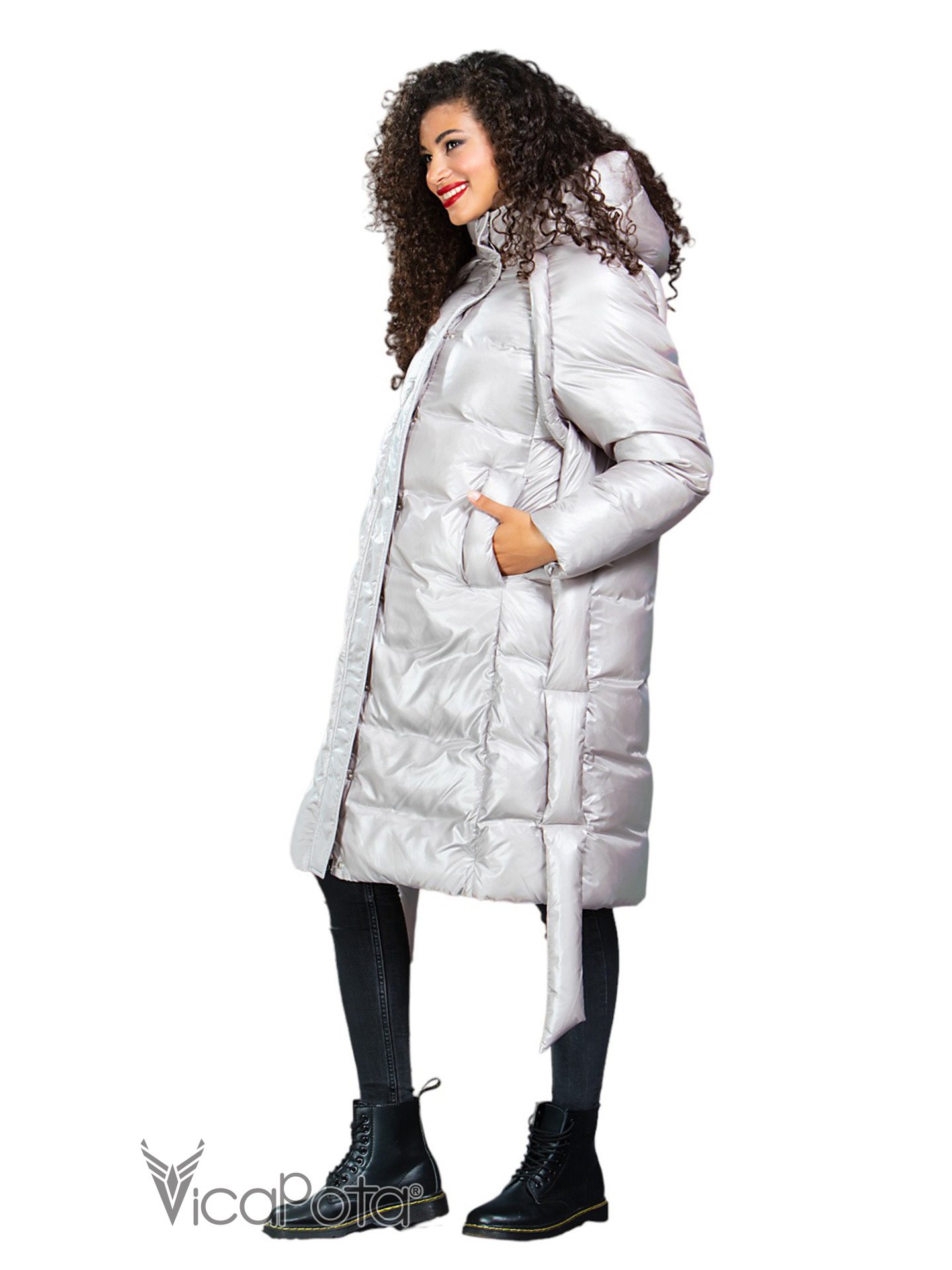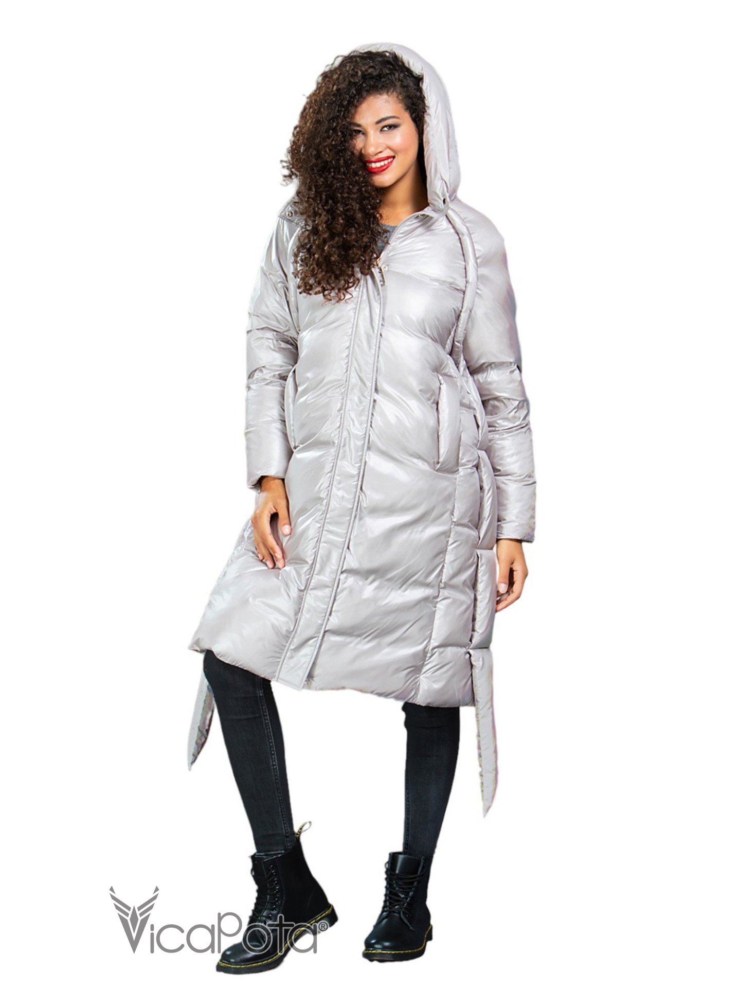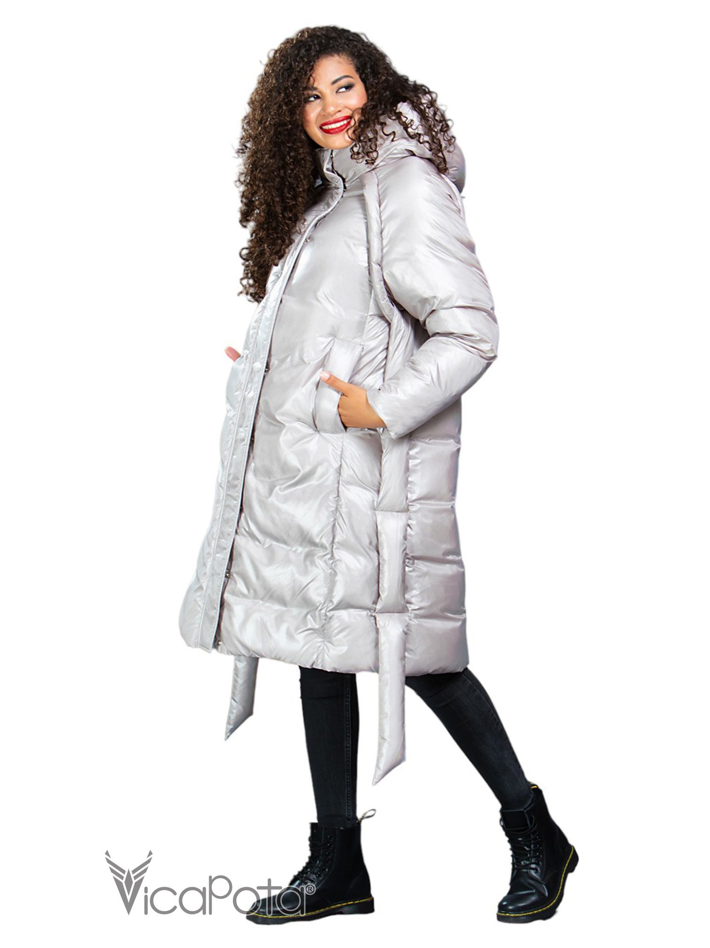 Жіночий пуховик бежевого кольору з каптуром, середньої довжини, у розмірі - 46. Наповнювач - біопух. Утеплювач не втрачає форми, товщини й обсягу, не проходить крізь шви й верхній матеріал, не деформується. Біопух стирають, як руками, так і в машинці, він сохне протягом декількох годин, не скачується. Дана модель оригінальна, з боків приспущені вставки, є можливість підняти до верху, також стильно виглядає в розпуск із боків пуховика. Є дві функціональні кишені для комфорту рук. Манжети на рукавах що чимало важливо для холодної пори року. Дуже стильна модель пуховика для жінок будь-якого віку.