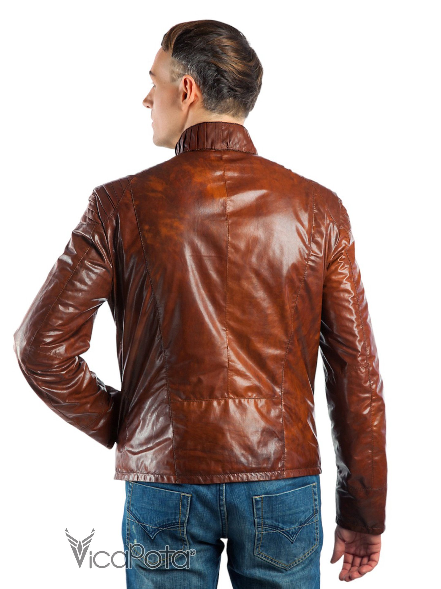 Чоловіча шкіряна куртка в кольорі коньяк зі шкіри теляти. Утеплювач тонкий шар синтепону. Довжина 80 см. Фурнітура чорна матова блискавка. Воріт можна застебнути у вигляді стійки або носити як відкладний . Сезон осінь^-осінь-весна-осінь. На куртці є дві бічні кишені й дві внутрішні кишені . Сучасна куртка приталеного силуету, підійде для спортивного, так і для повсякденного стилю, вигідно підкреслить Вашу фігуру.