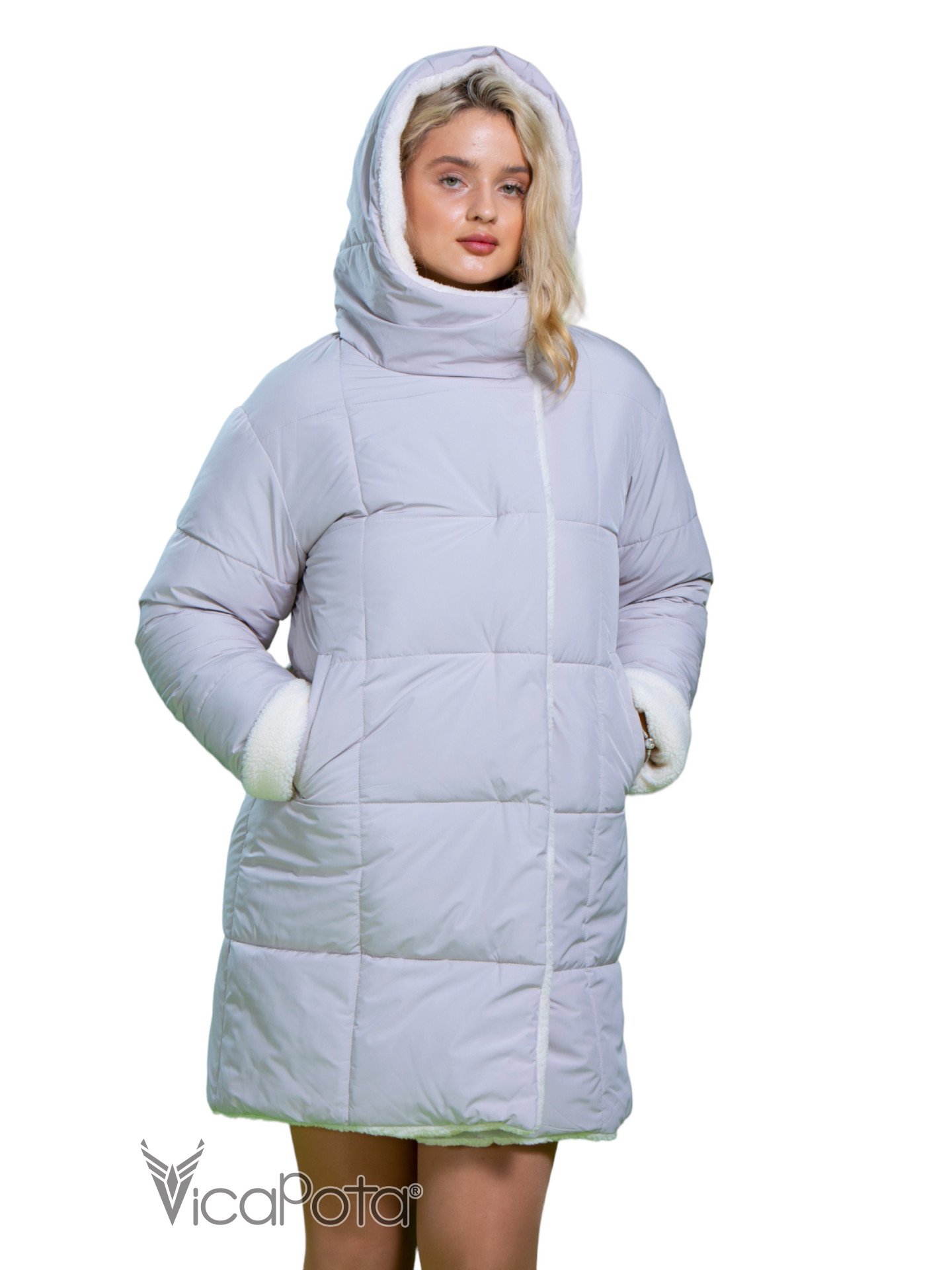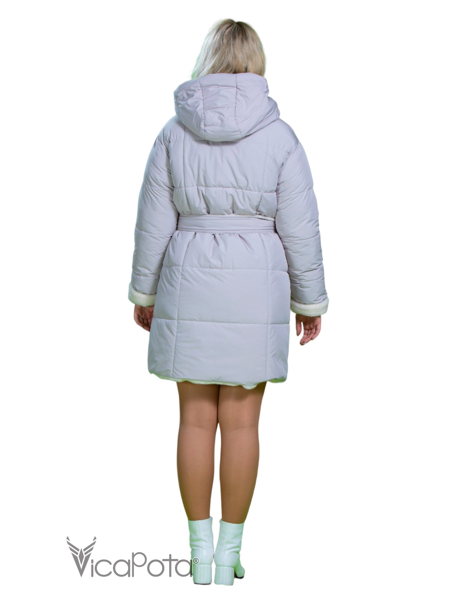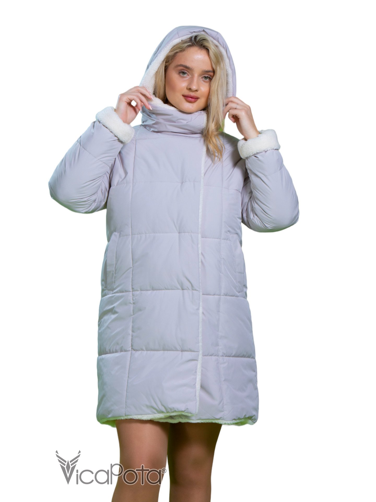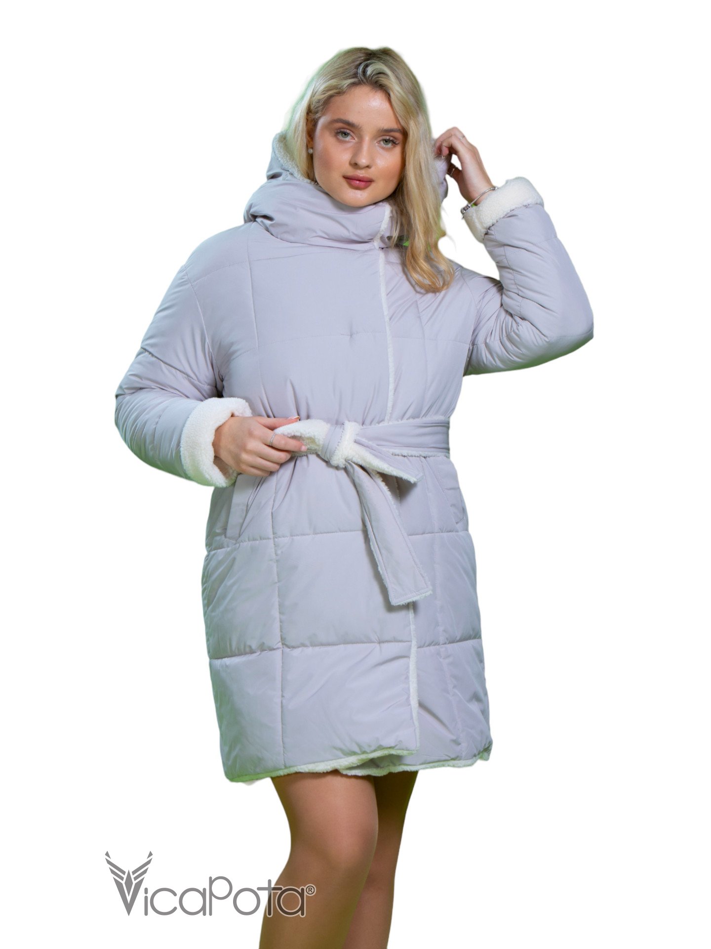 Жіночий двосторонній пуховик, носитися на дві сторони. Одна сторона матова плащівка бежевого кольору, інша біла шерпа. Модель прямого покрою на блискавці й кнопках, спущене плече. Комір стійка перехідний у суцільнокроєний каптур. Кишені урізні на кожній стороні виробу. Пояс у комплекті. Додатково утеплений біопухом, підходить для сирої й морозної погоди. Довжина 90 см, рукав з підворотом. Склад: polyester/sherpa Наповнення: біопух