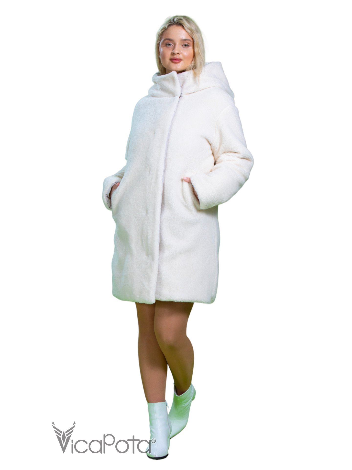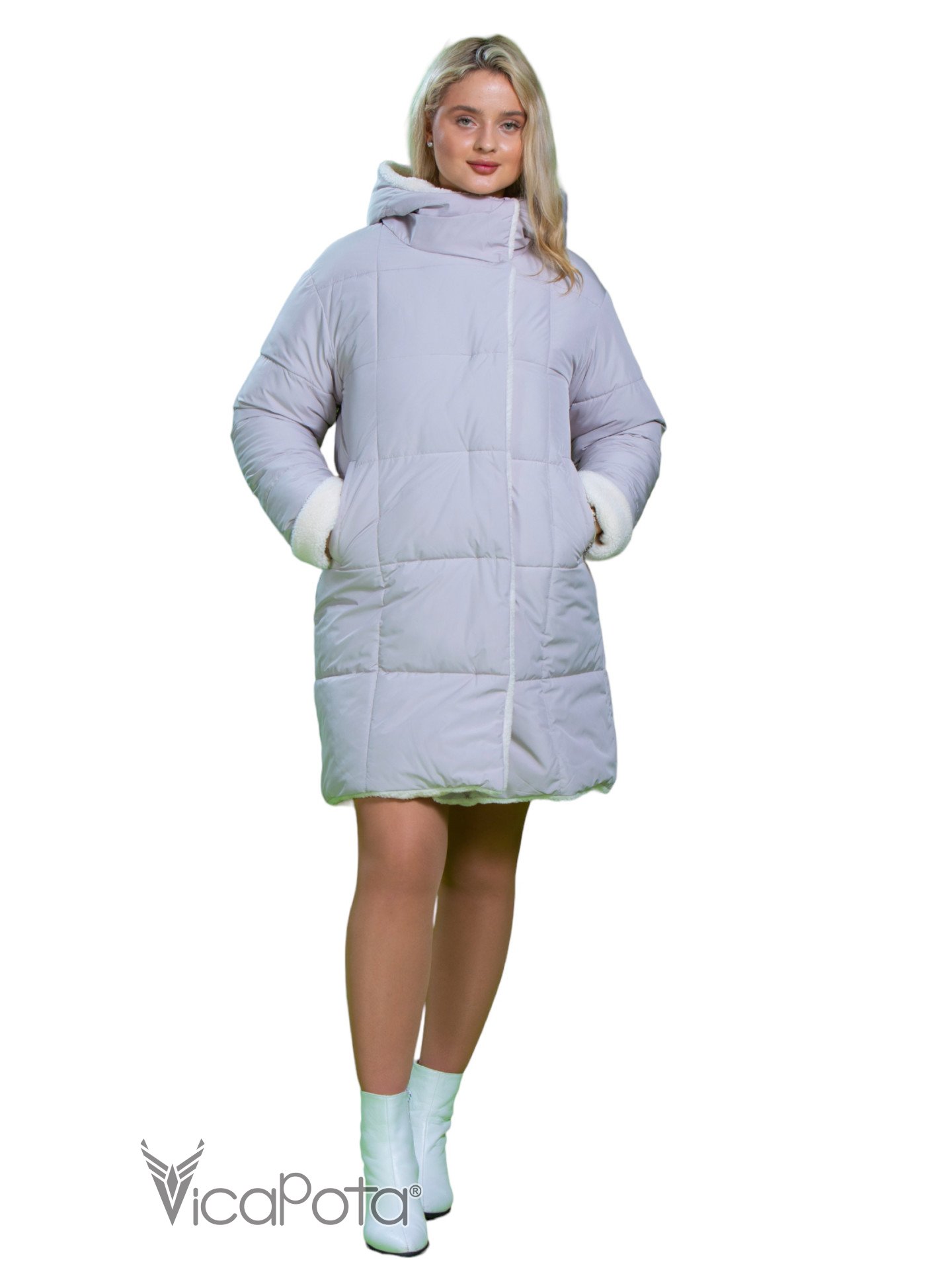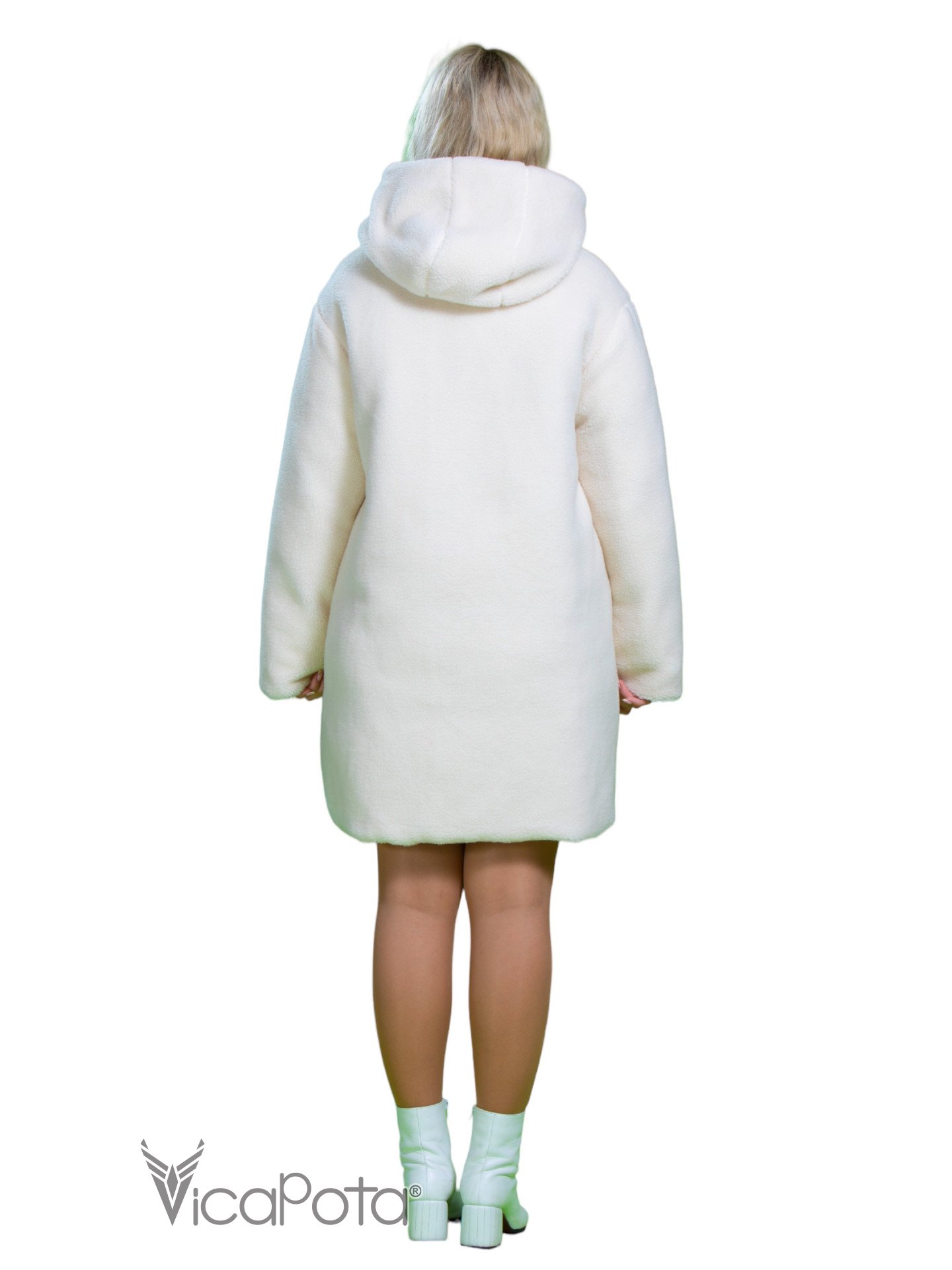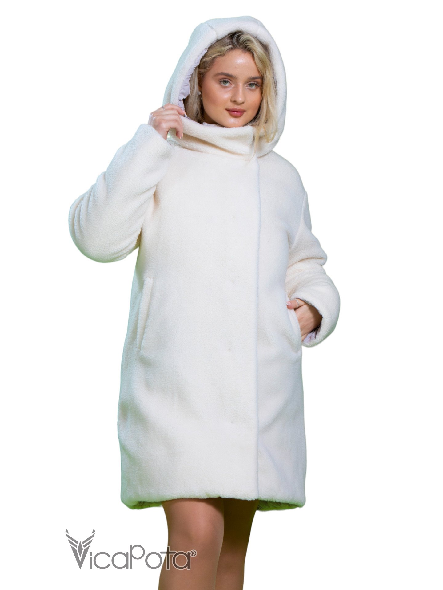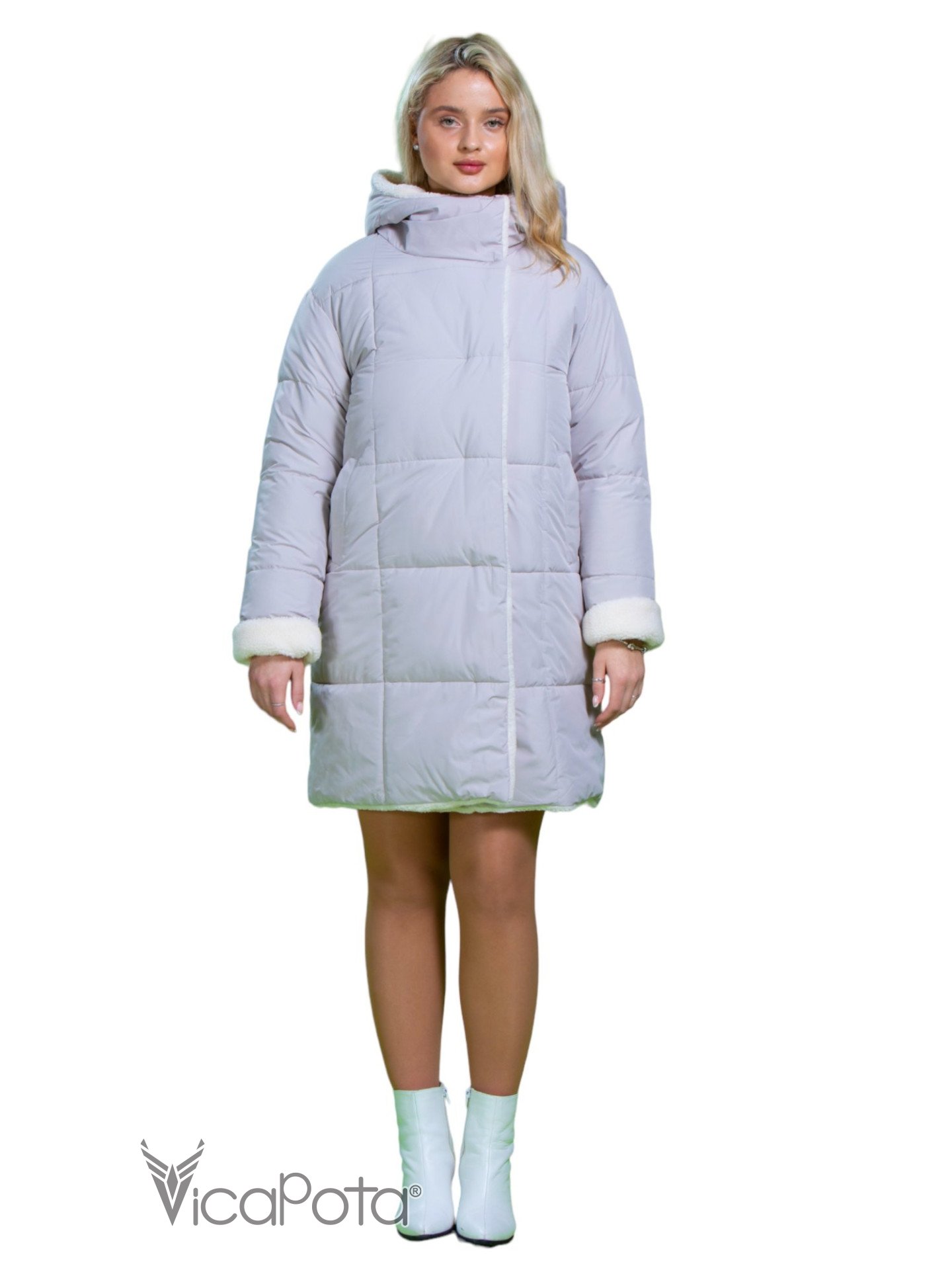 Жіночий двосторонній пуховик, носитися на дві сторони. Одна сторона матова плащівка бежевого кольору, інша біла шерпа. Модель прямого покрою на блискавці й кнопках, спущене плече. Комір стійка перехідний у суцільнокроєний каптур. Кишені урізні на кожній стороні виробу. Пояс у комплекті. Додатково утеплений біопухом, підходить для сирої й морозної погоди. Довжина 90 см, рукав з підворотом. Склад: polyester/sherpa Наповнення: біопух