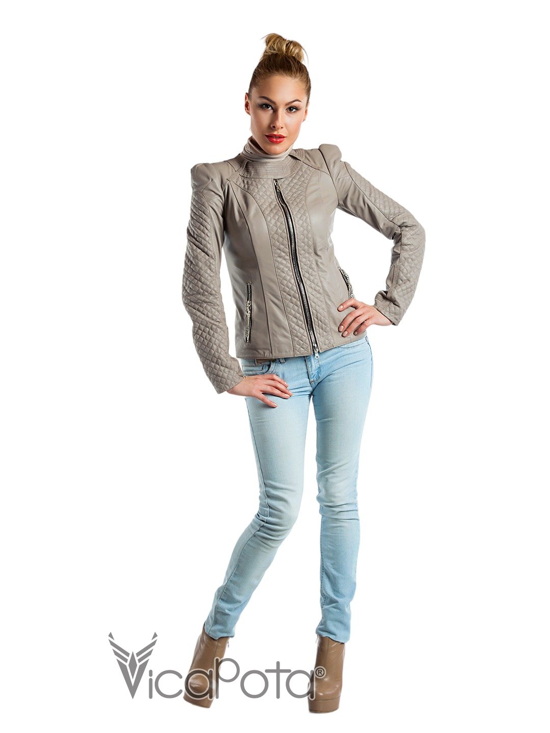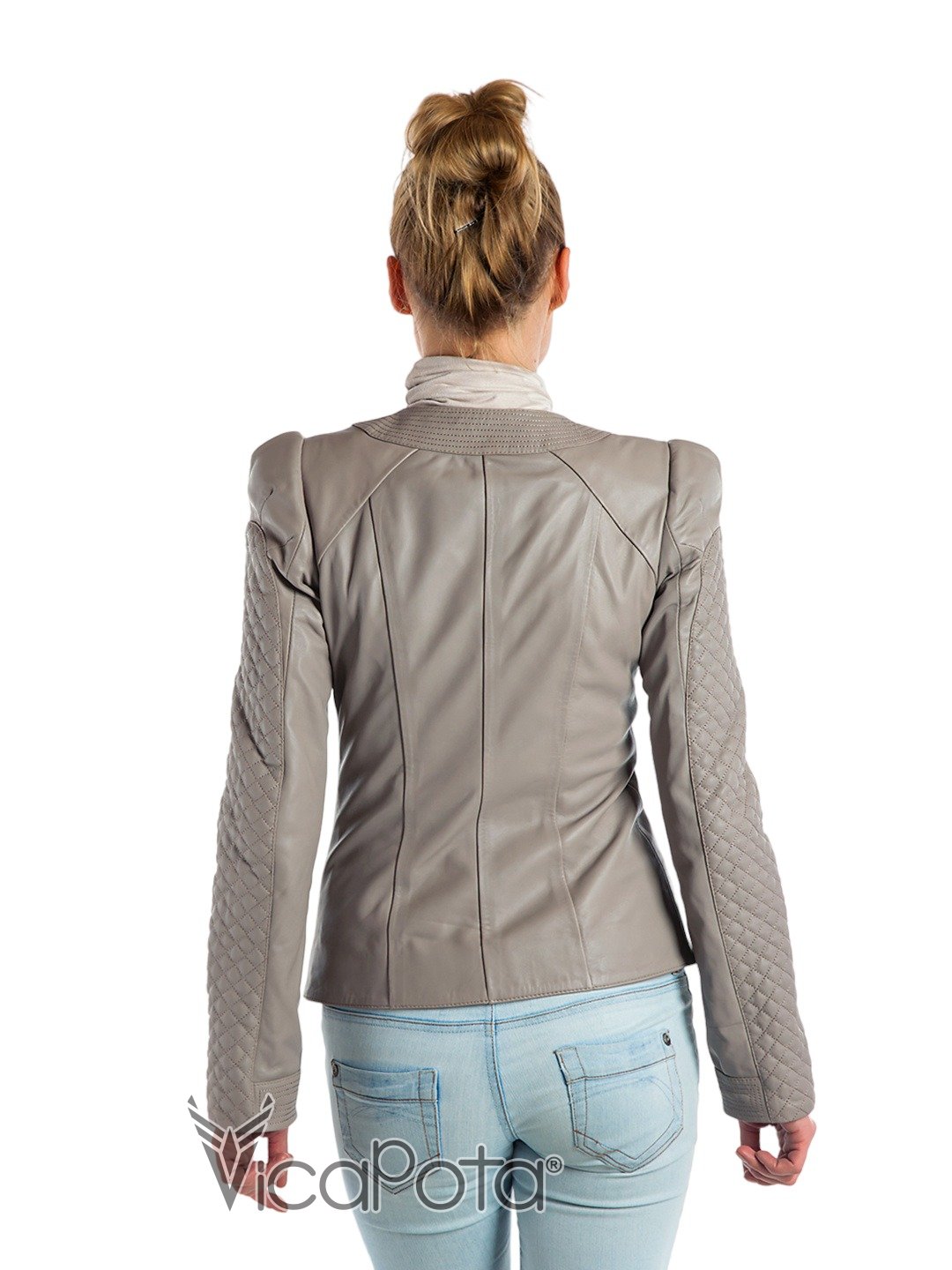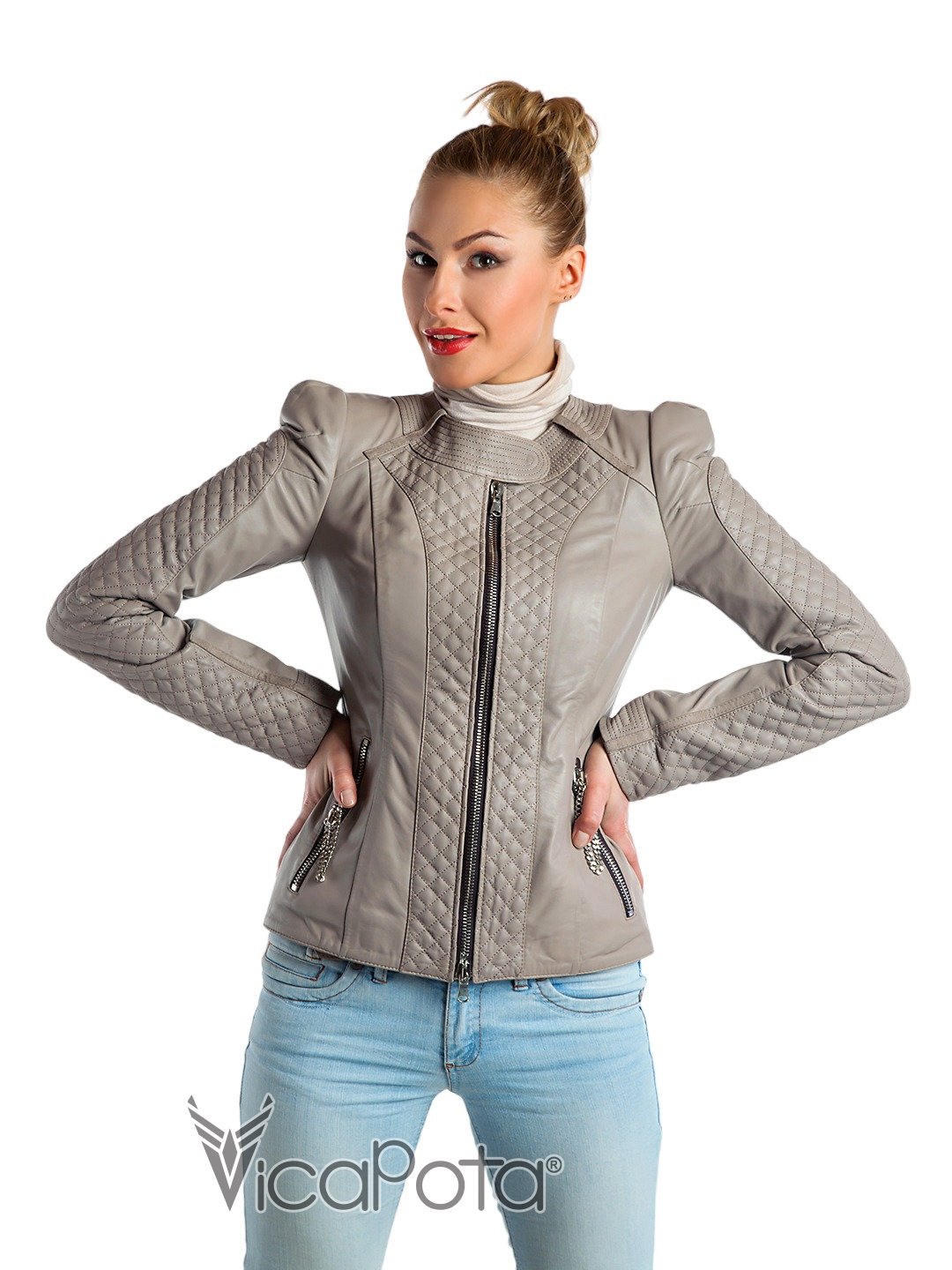Жіноча шкіряна куртка з м'якої італійської шкіри. Колір бежевий. Виріб простьобано вставками попереду й на рукавах. Без утеплювача. Довжина 56 см. Куртка декорована замшевими бежевими вставками й масивною фурнітурою кольору срібний металік. Застібка блискавка. Завдяки жіночності й стильного коміра шанель, куртку можна носити з різними стилями одягу, що додасть Вашому образу яскравості й індивідуальності.