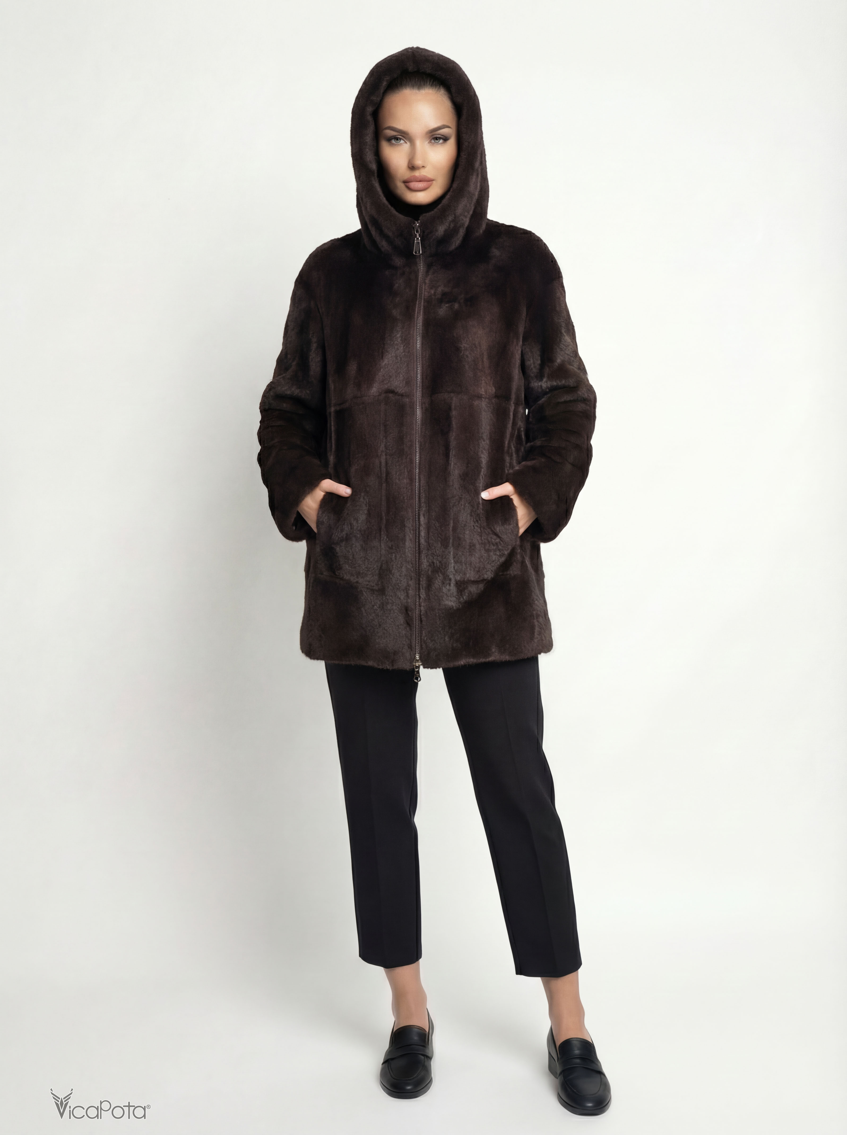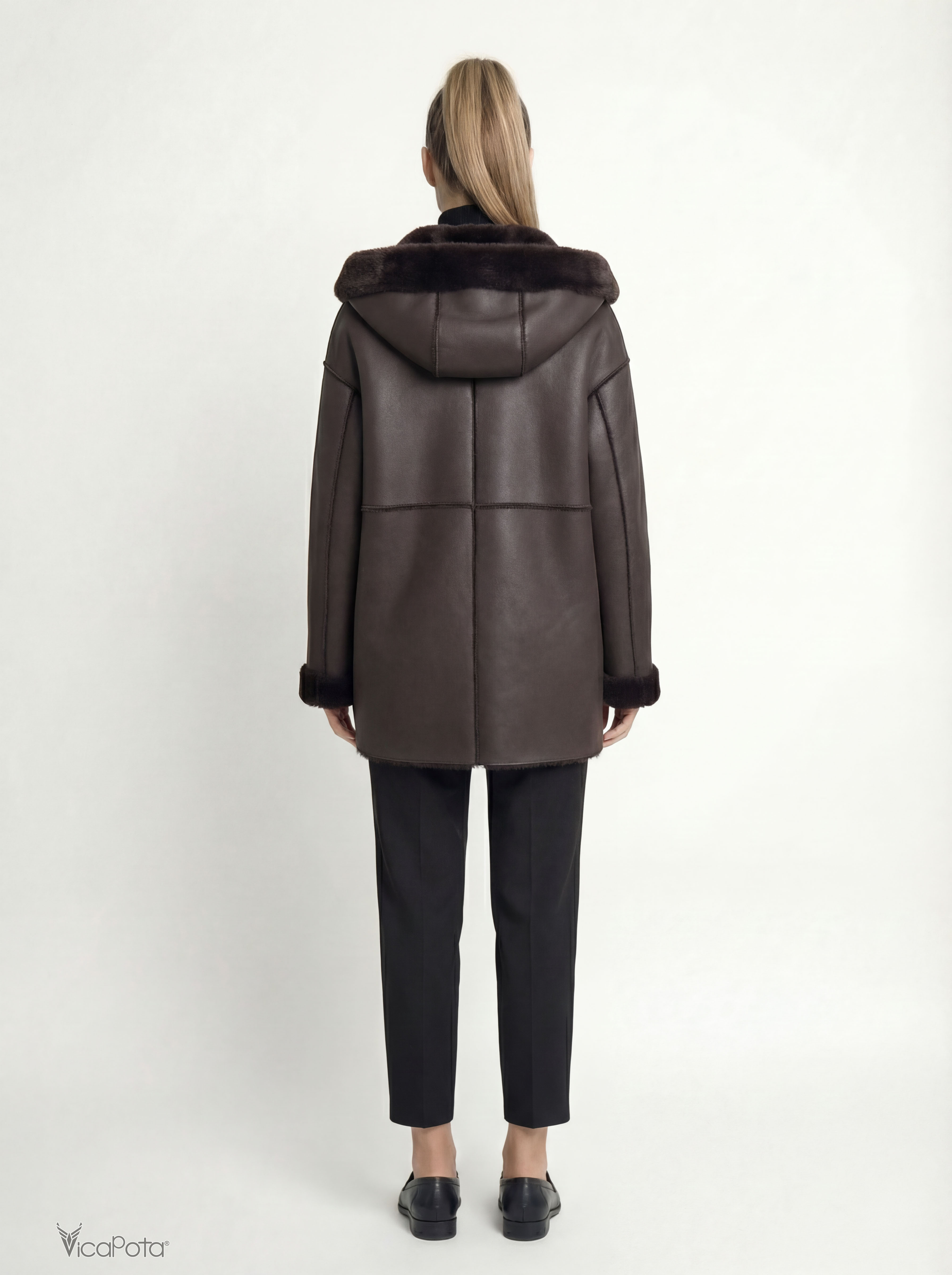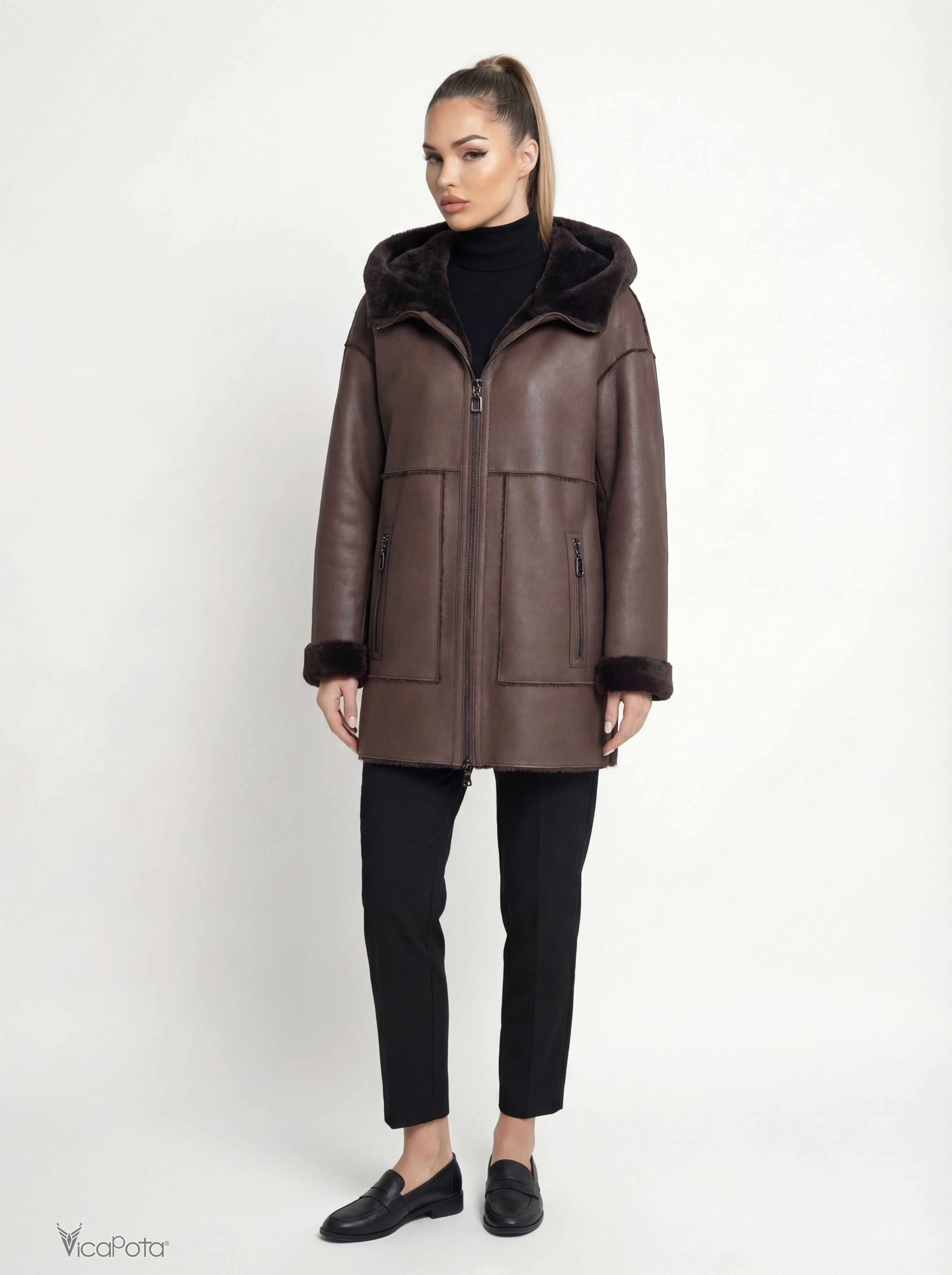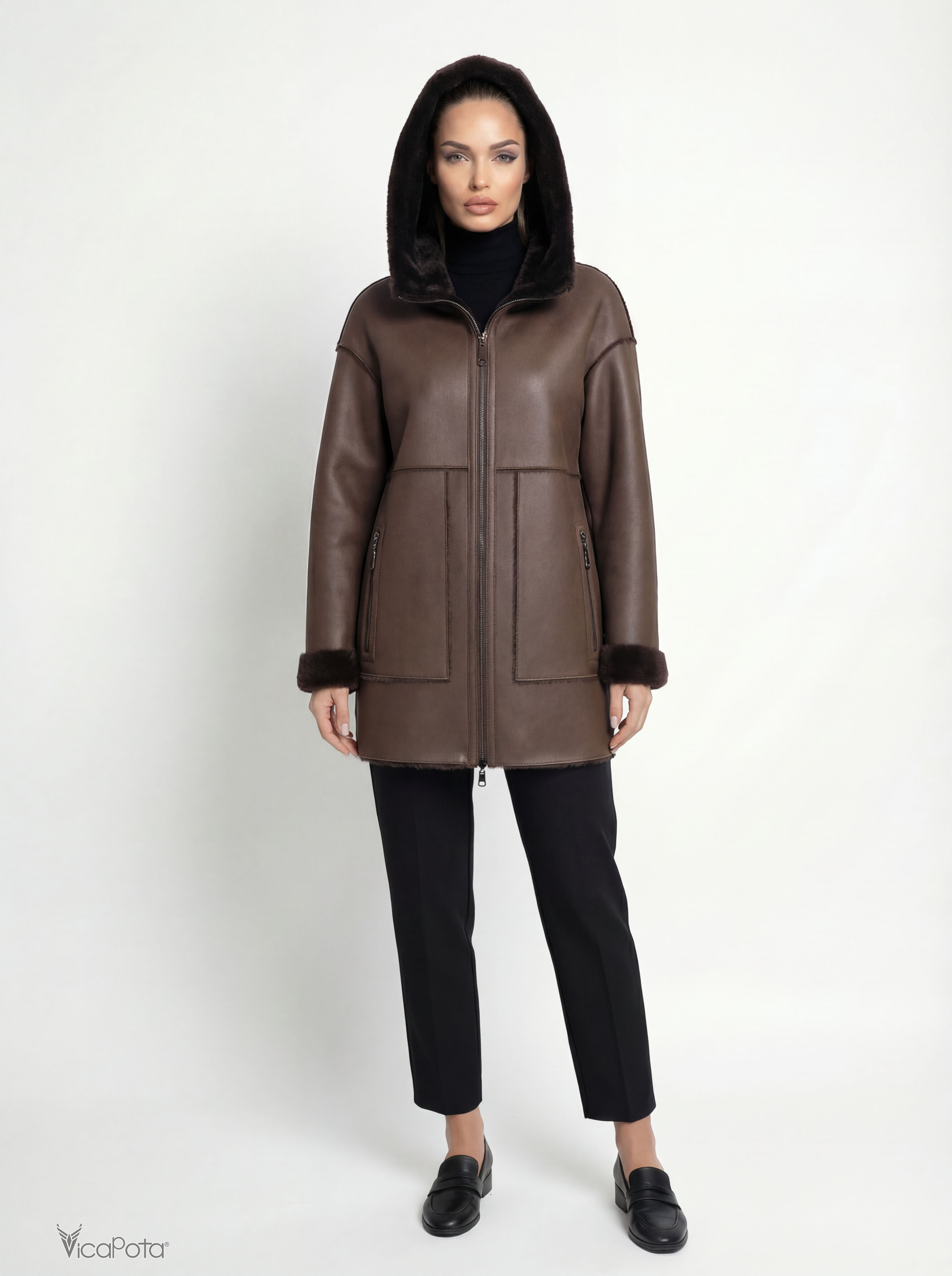 Одна сторона — гладка під шкіру, інша — м’яка під хутро. Фактично це два образи в одній дублянці. Модель чудово підходить для міського гардероба.