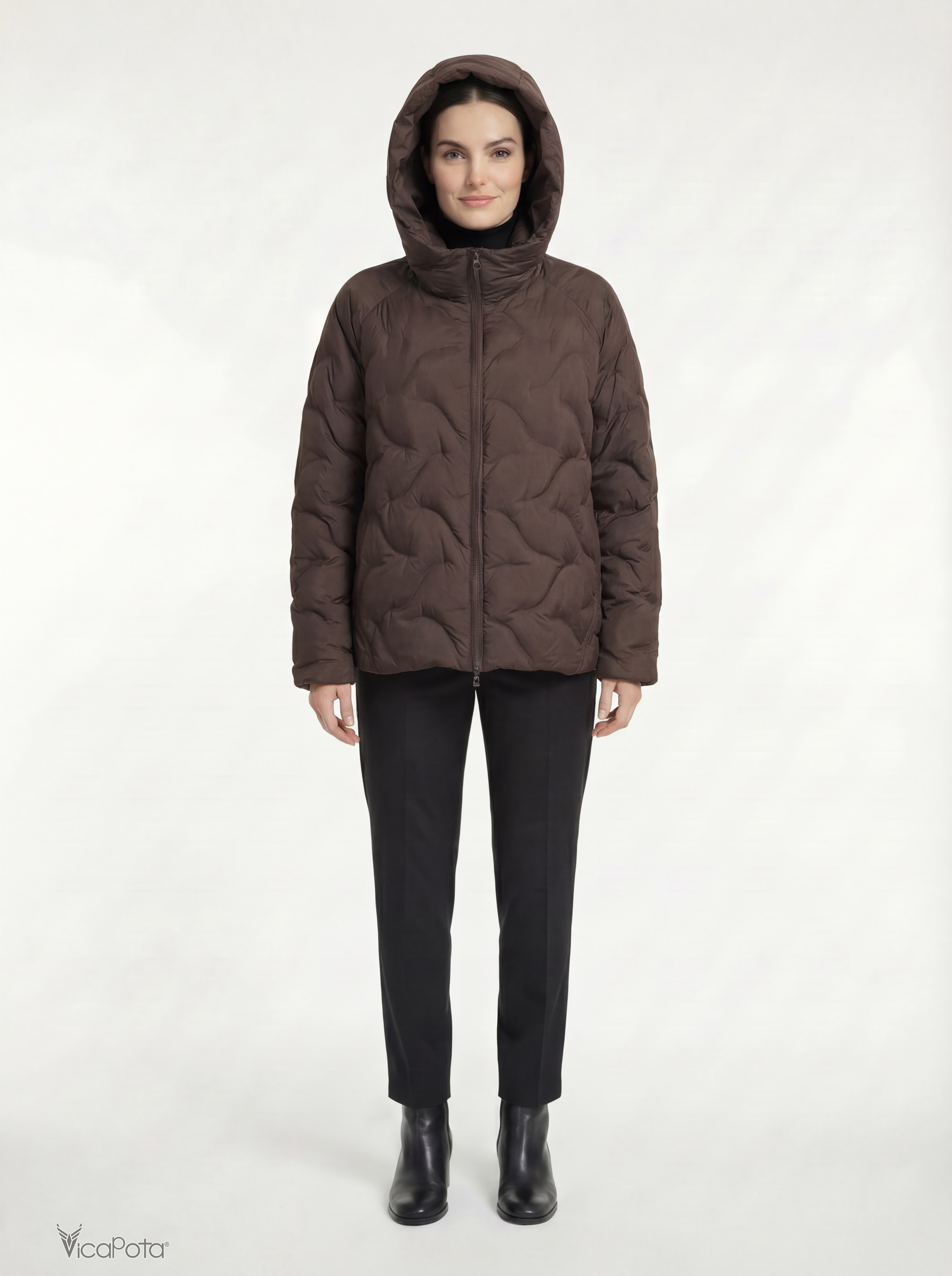 Наповнювач із натурального пуха забезпечує тепло без зайвої ваги. Куртка застібається на блискавку, що робить її практичною та зручною. Знімний капюшон дозволяє змінювати стиль — більш спортивний або стриманий.