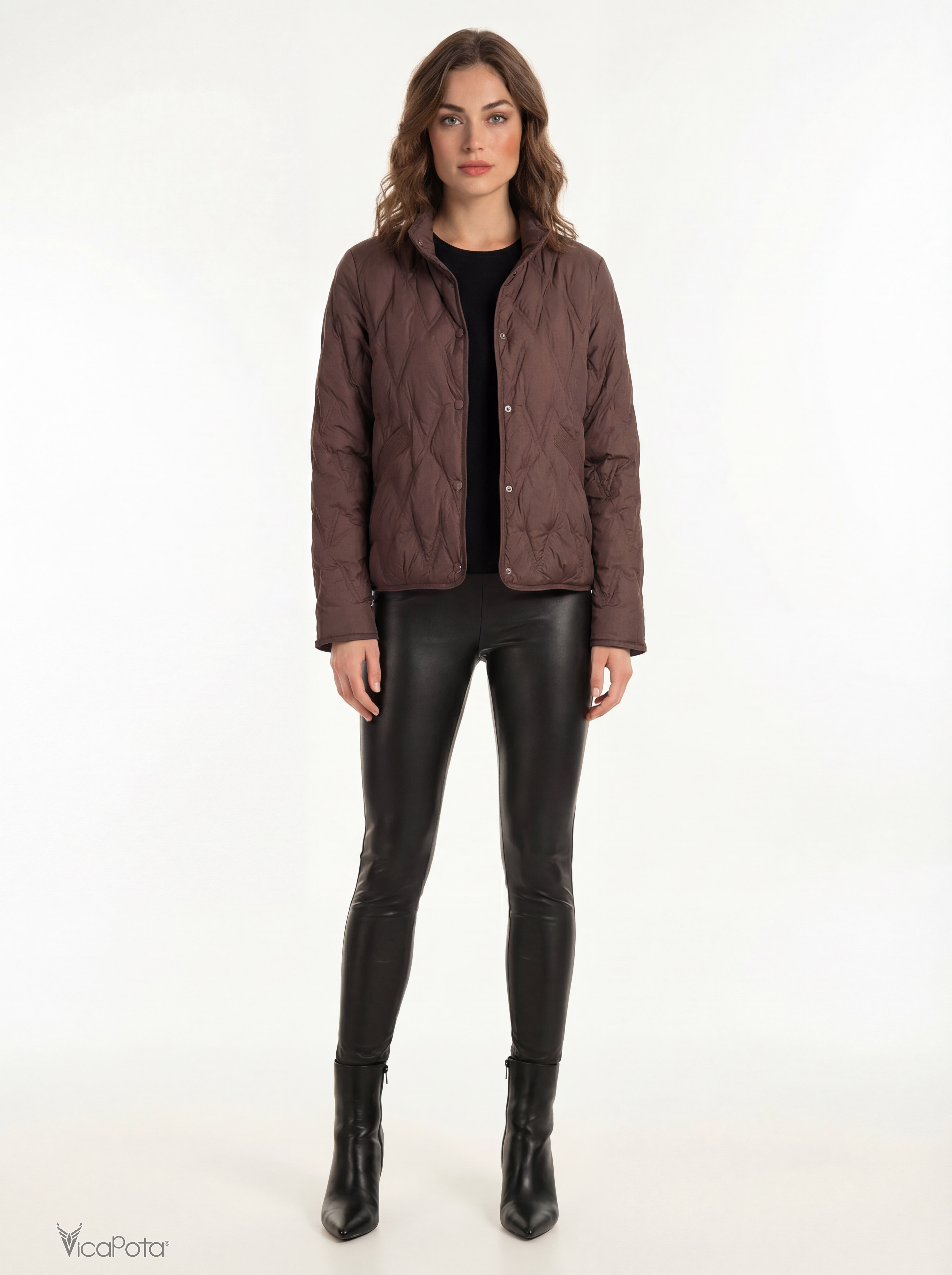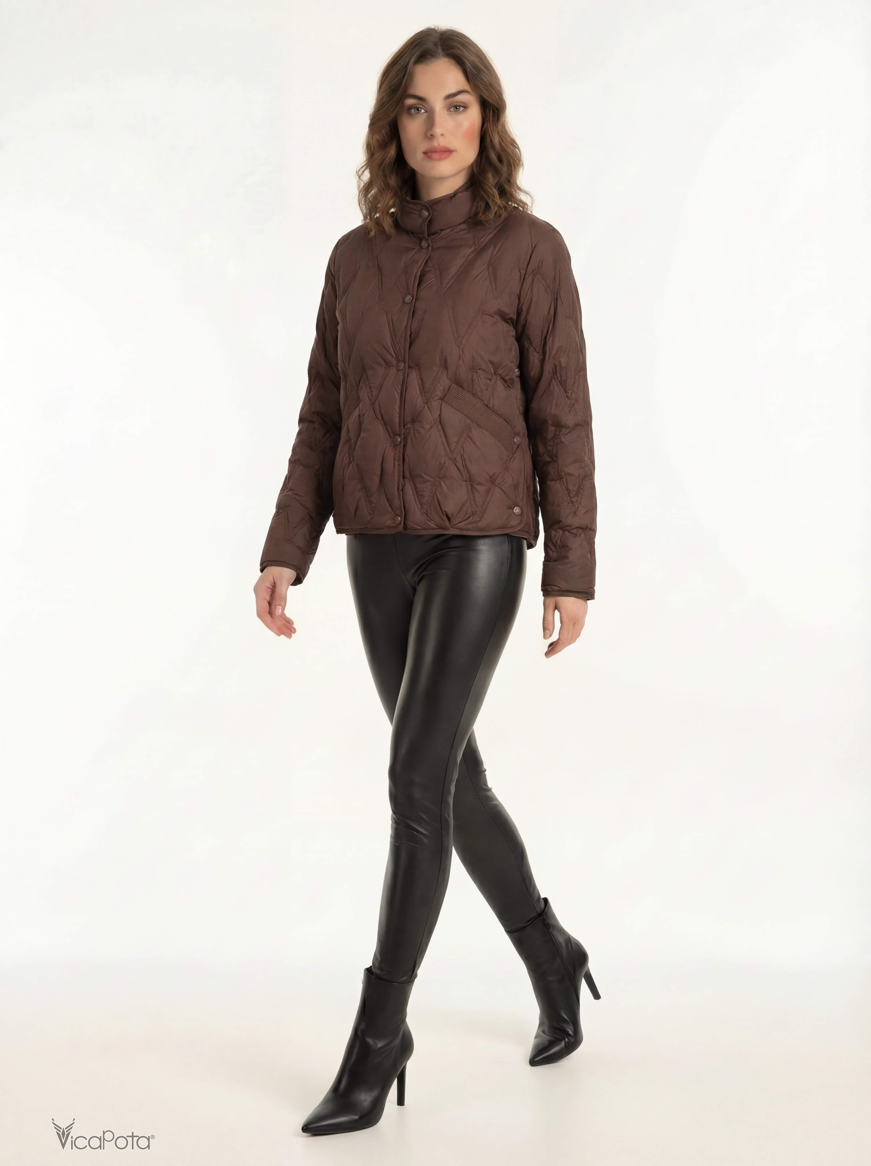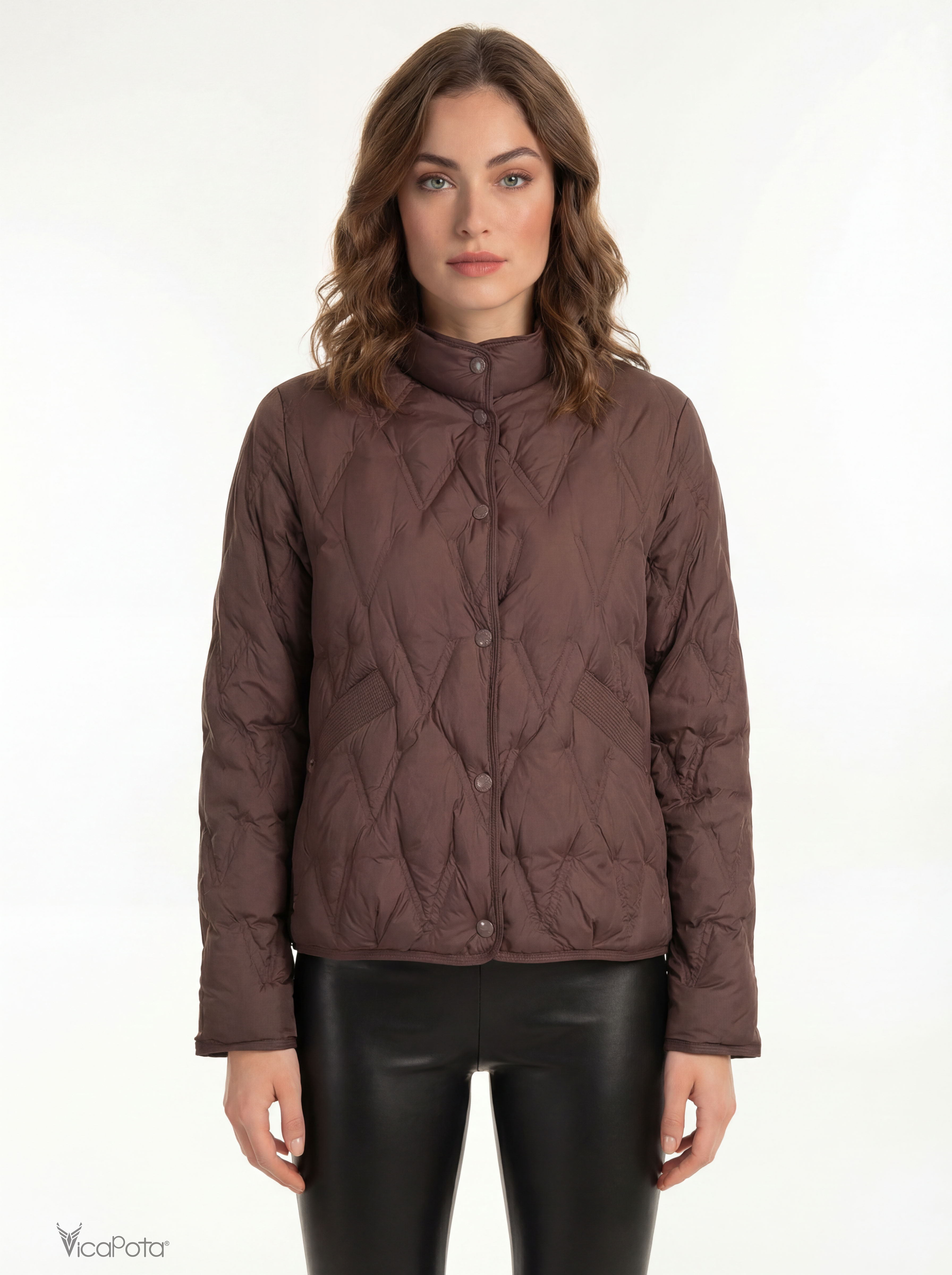 Жіноча легка пухова куртка в глибокому коричневому відтінку — сучасна демісезонна модель преміум-якості для міста. Виконана з якісної матової тканини та наповнена натуральним пухом, що забезпечує легкість і комфортне тепло.