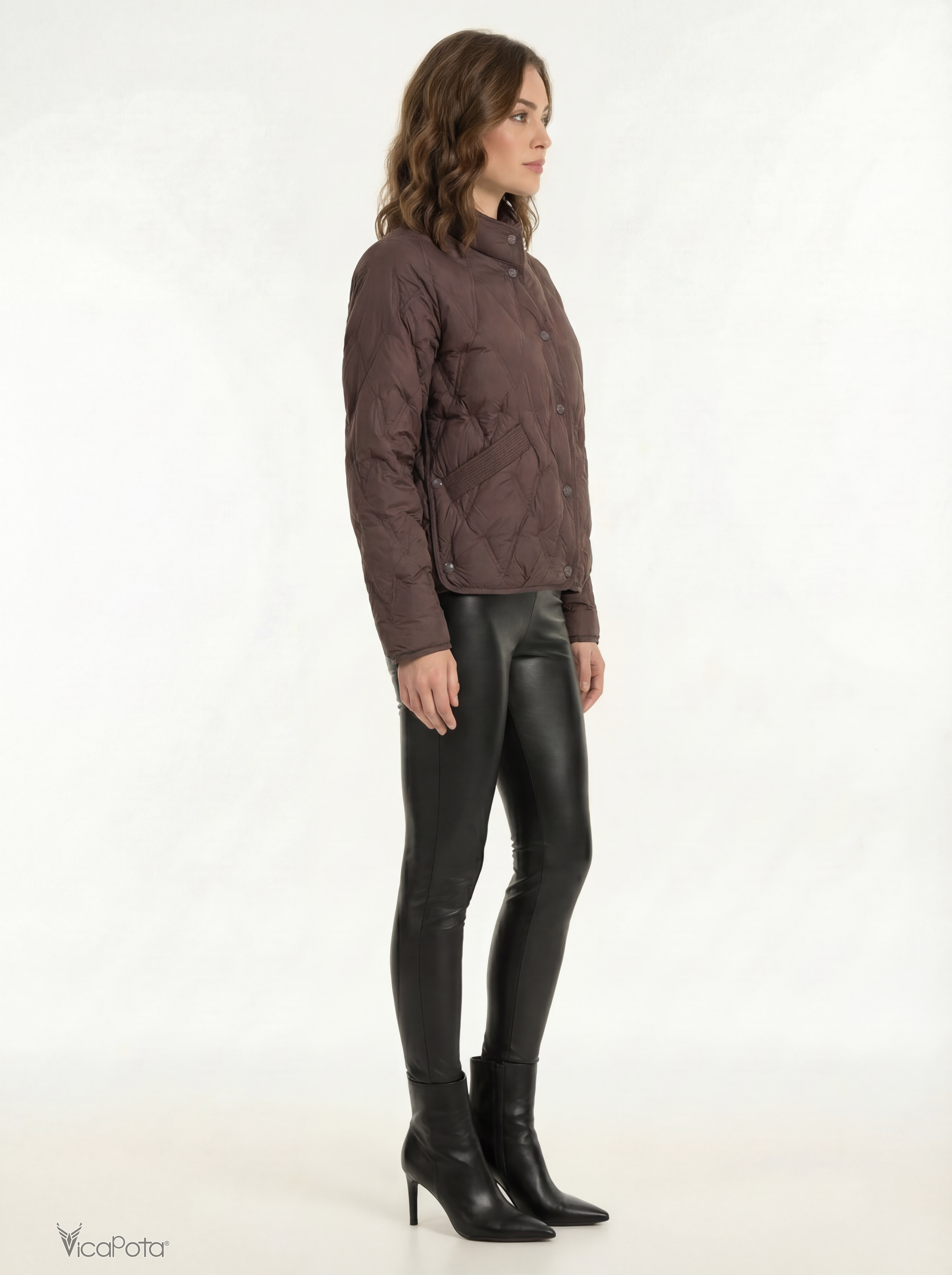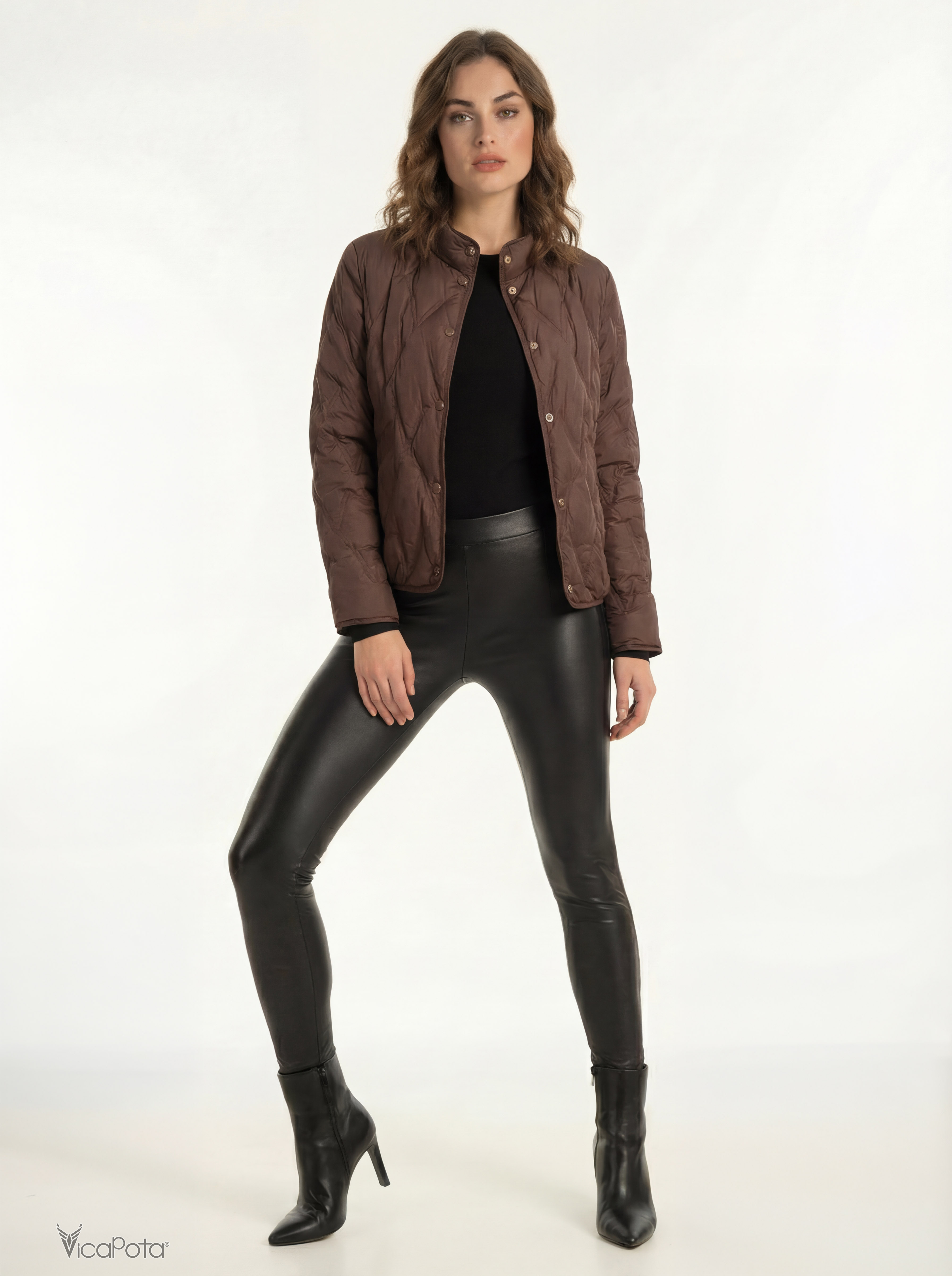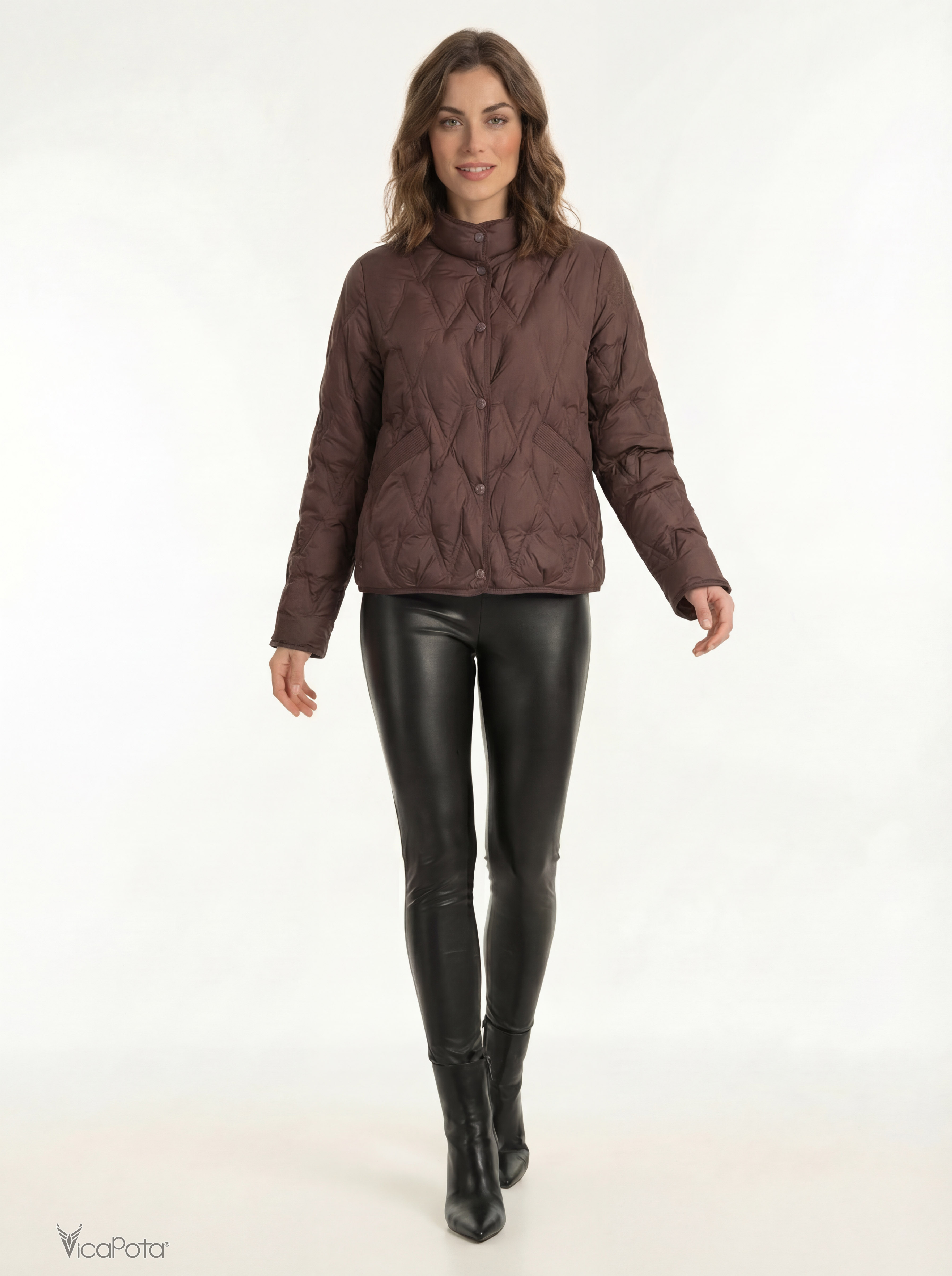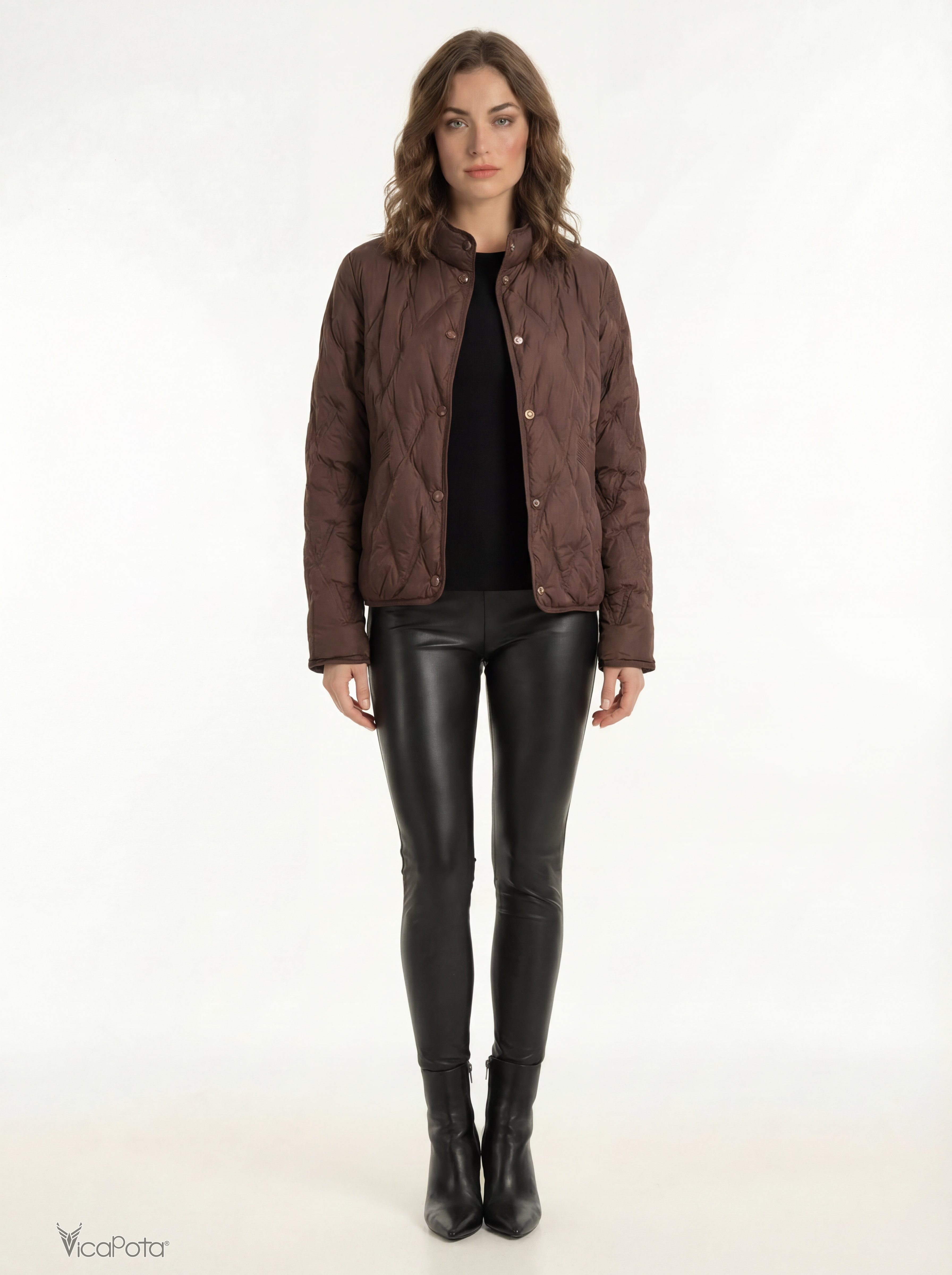 Жіноча легка пухова куртка в глибокому коричневому відтінку — сучасна демісезонна модель преміум-якості для міста. Виконана з якісної матової тканини та наповнена натуральним пухом, що забезпечує легкість і комфортне тепло.