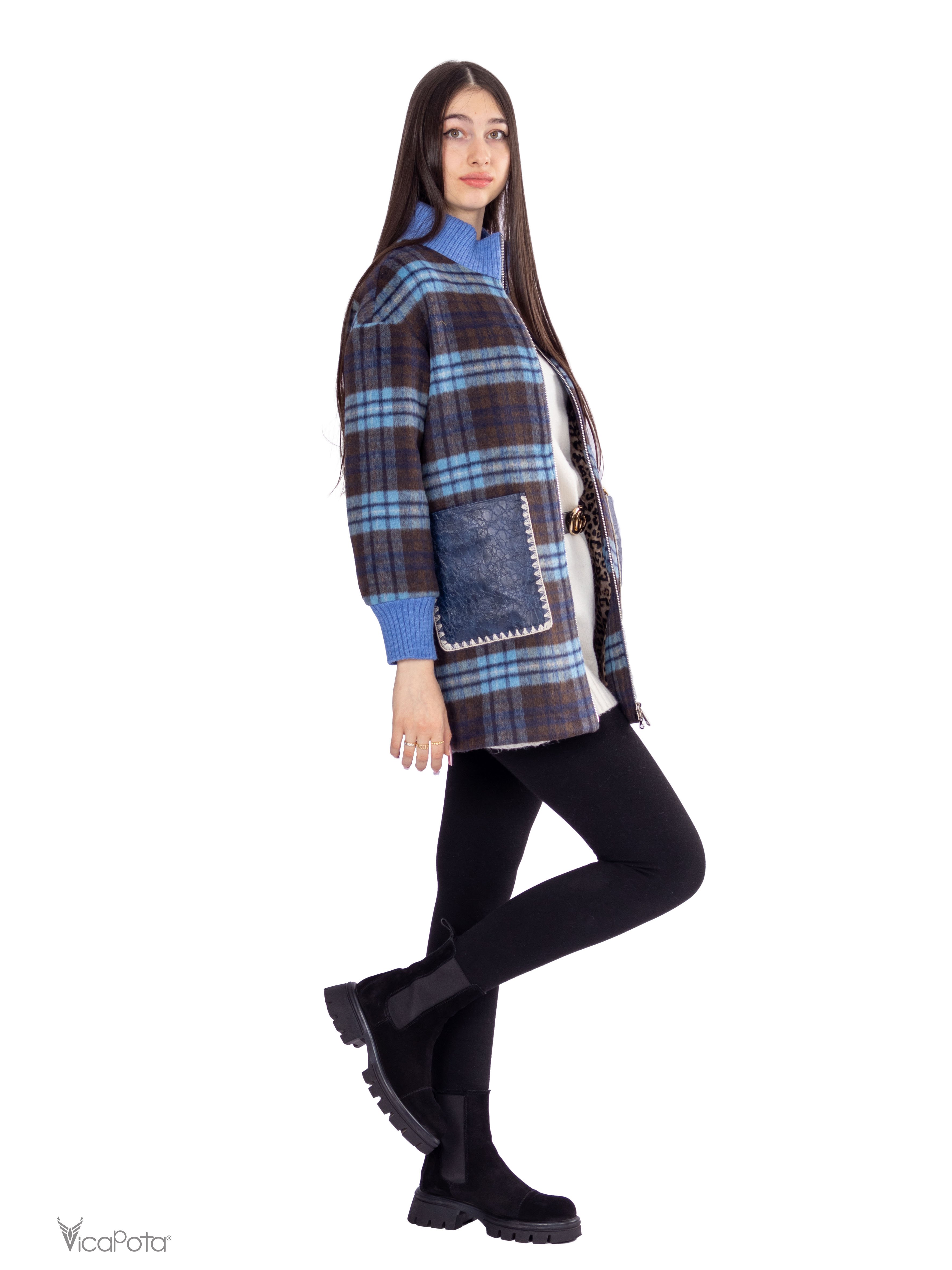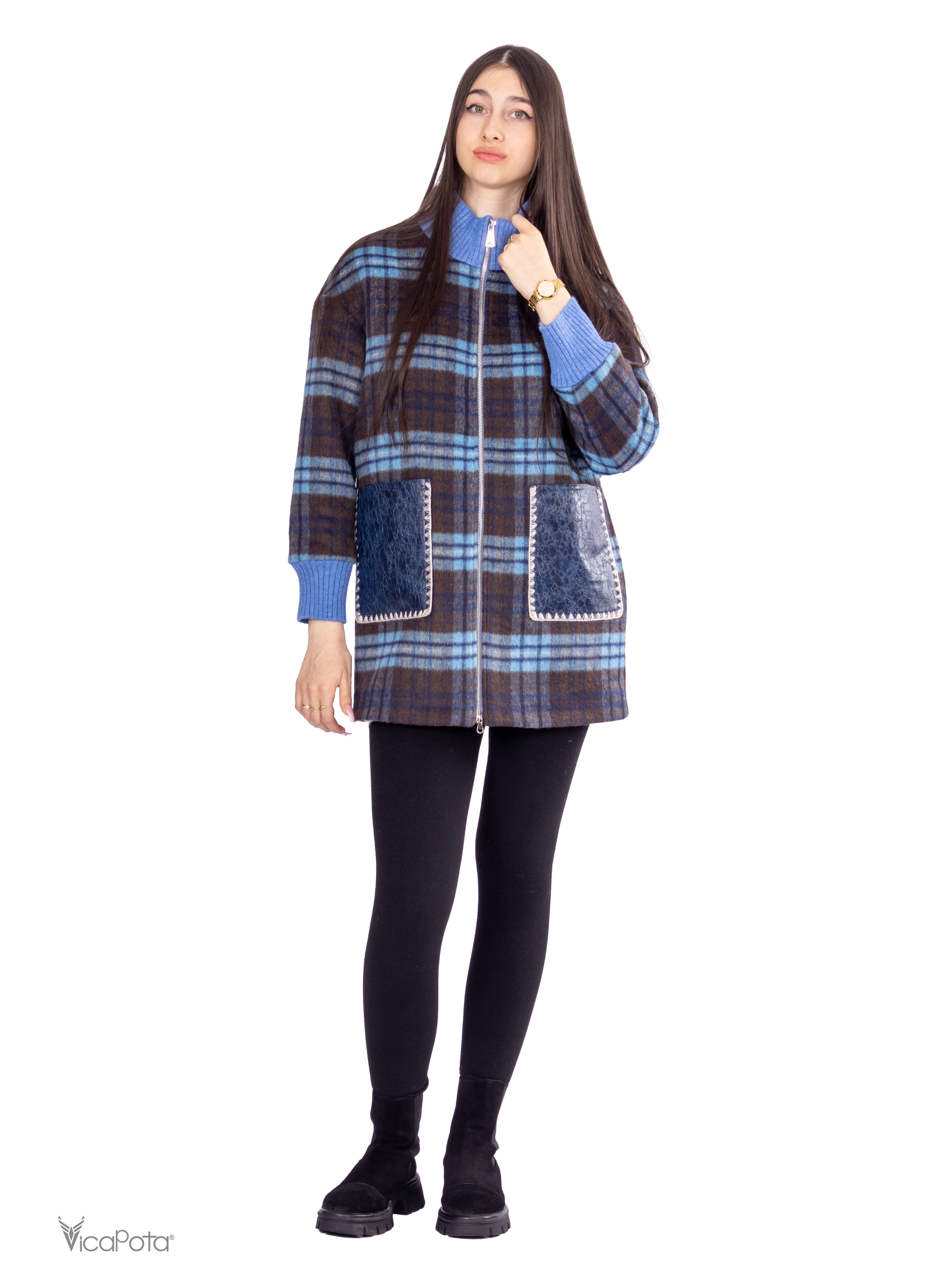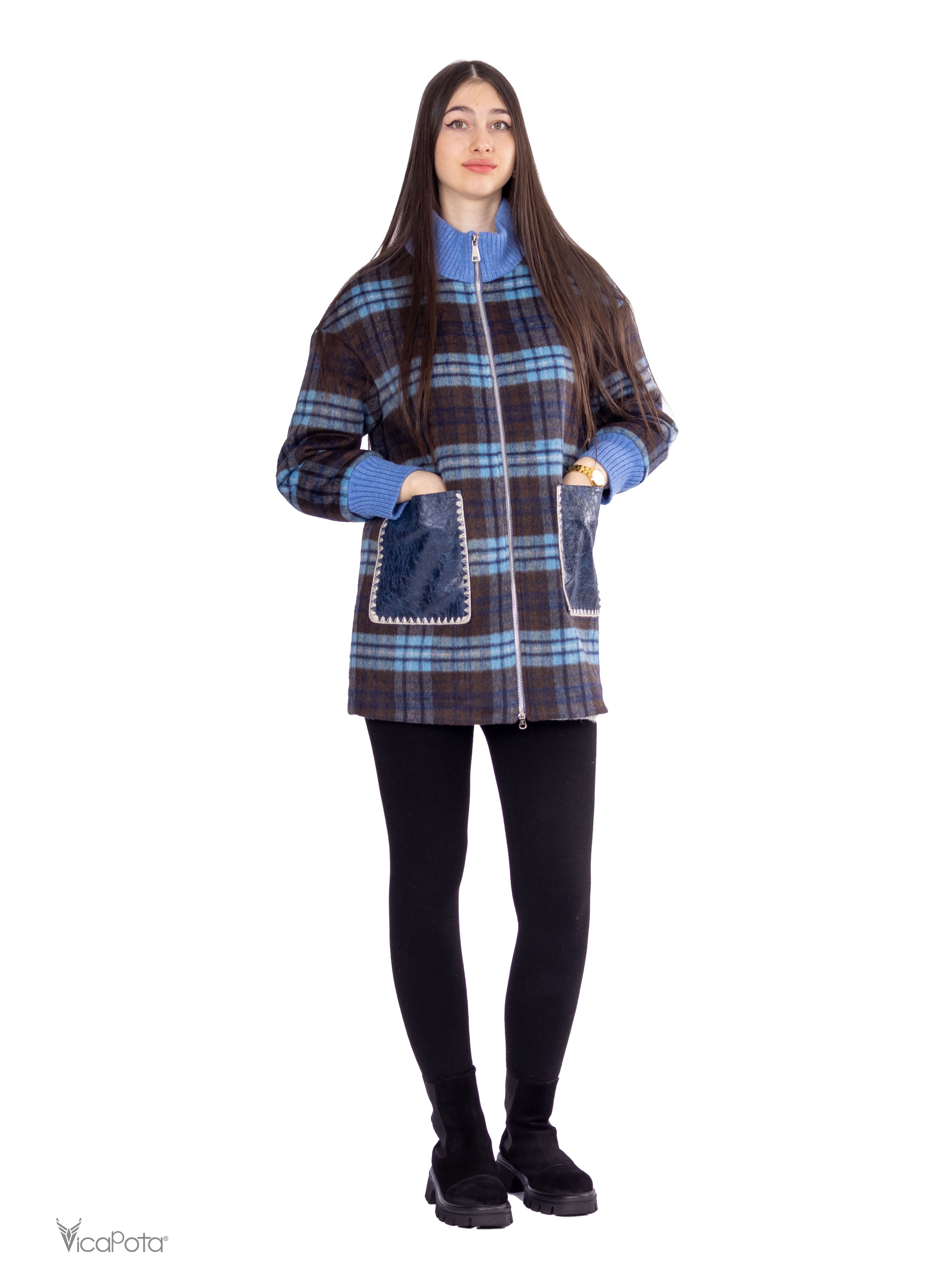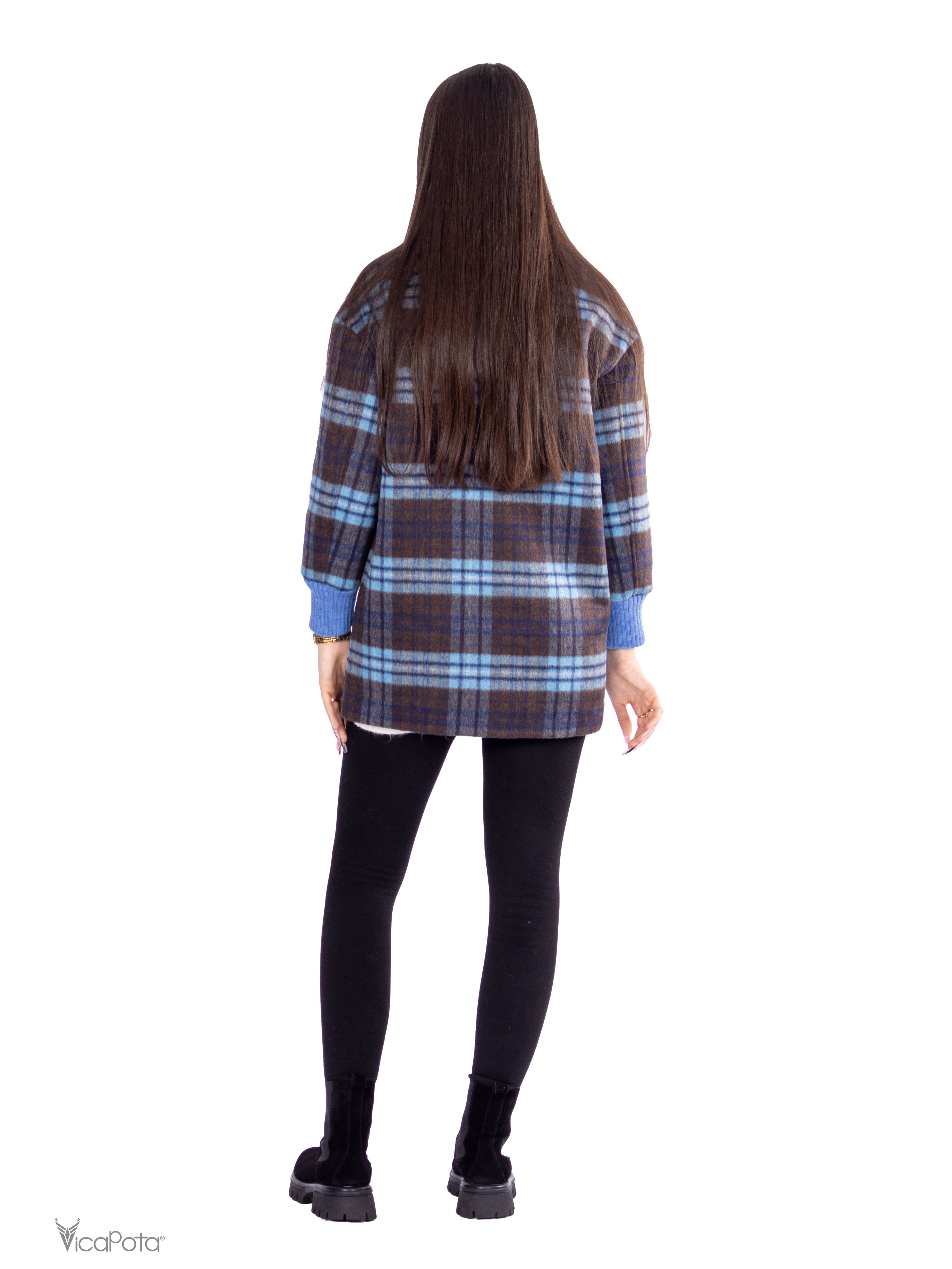 - **Дизайн:** синьо-коричневий клітчастий принт для стильного образу.