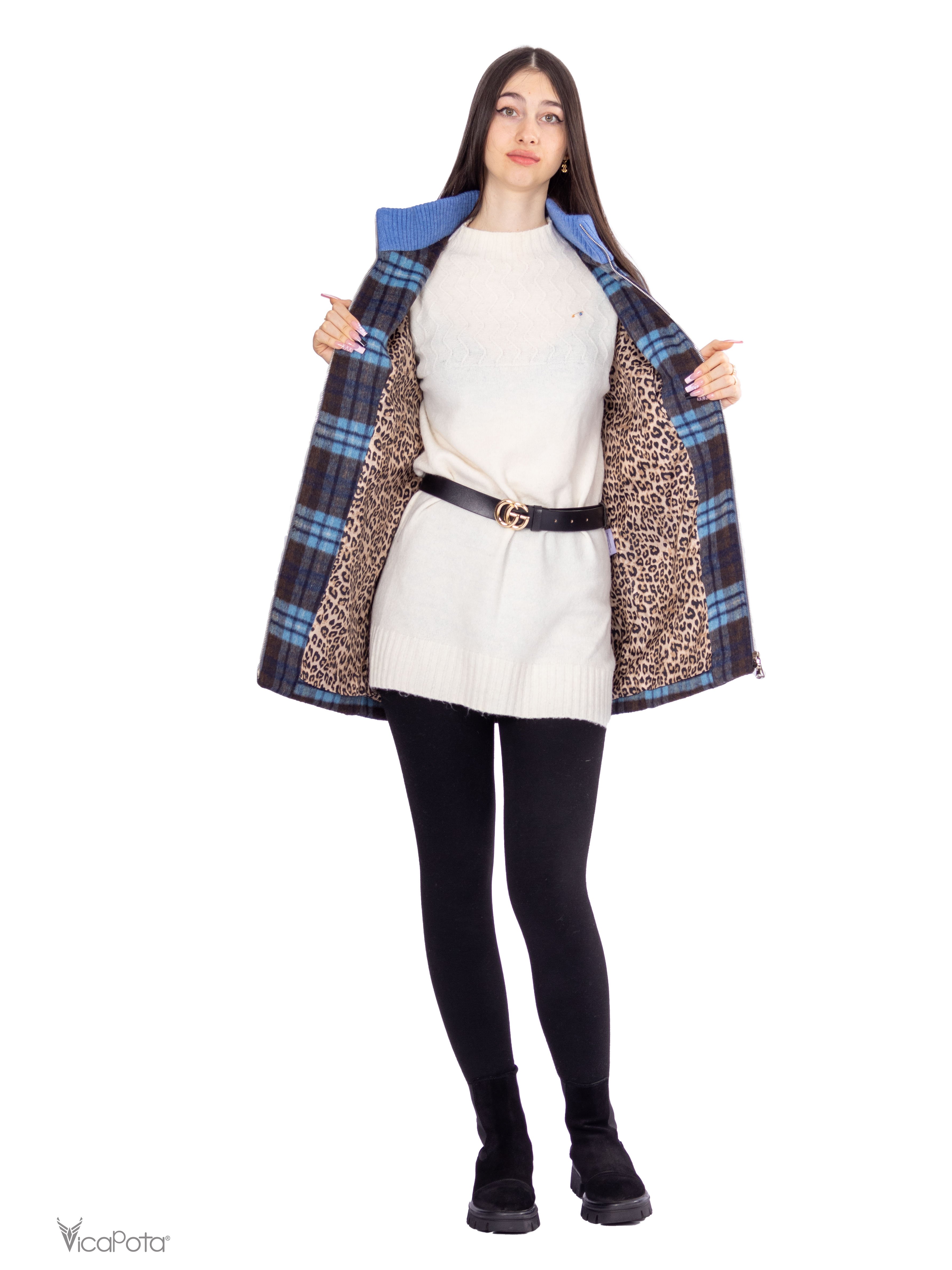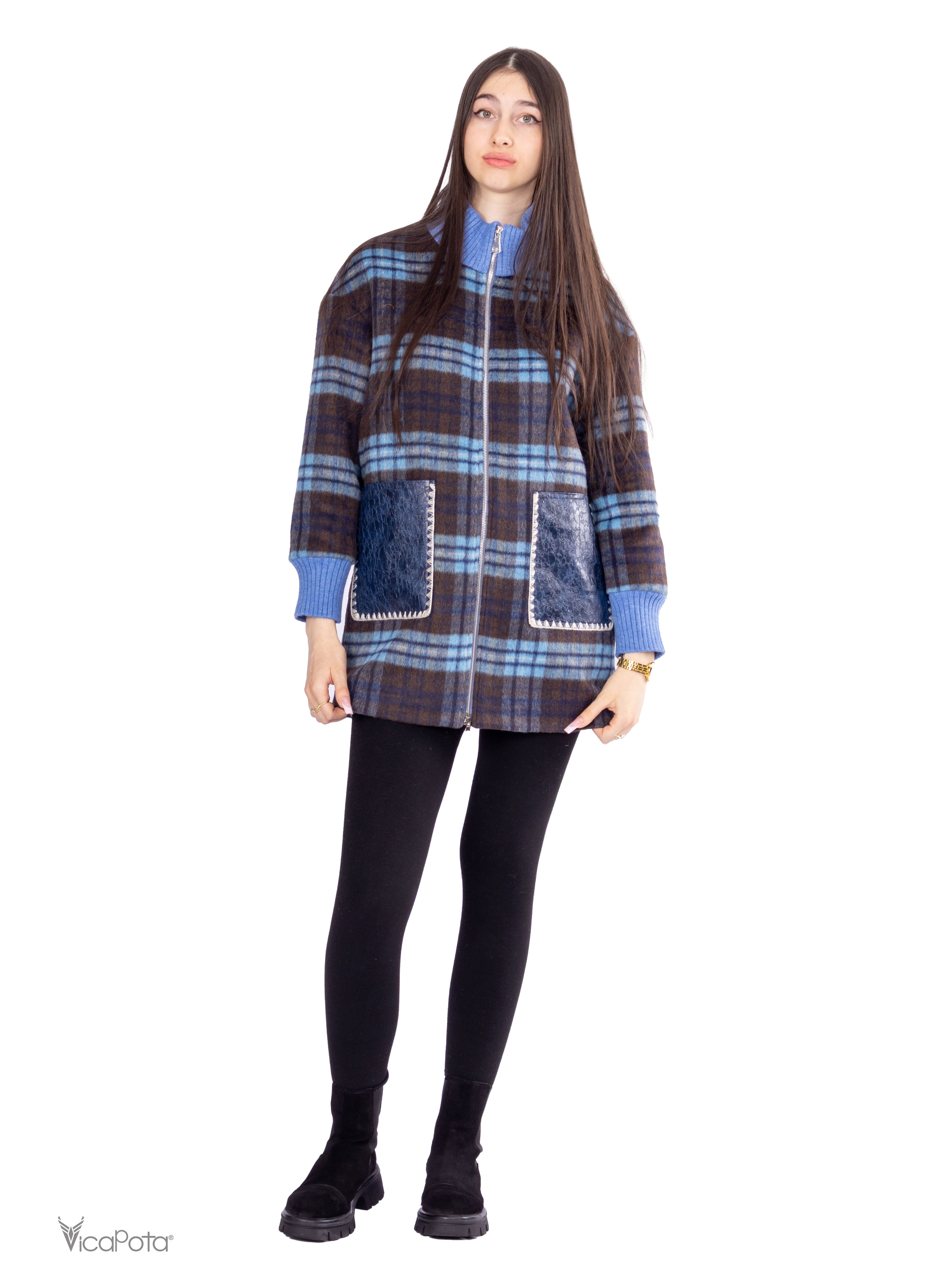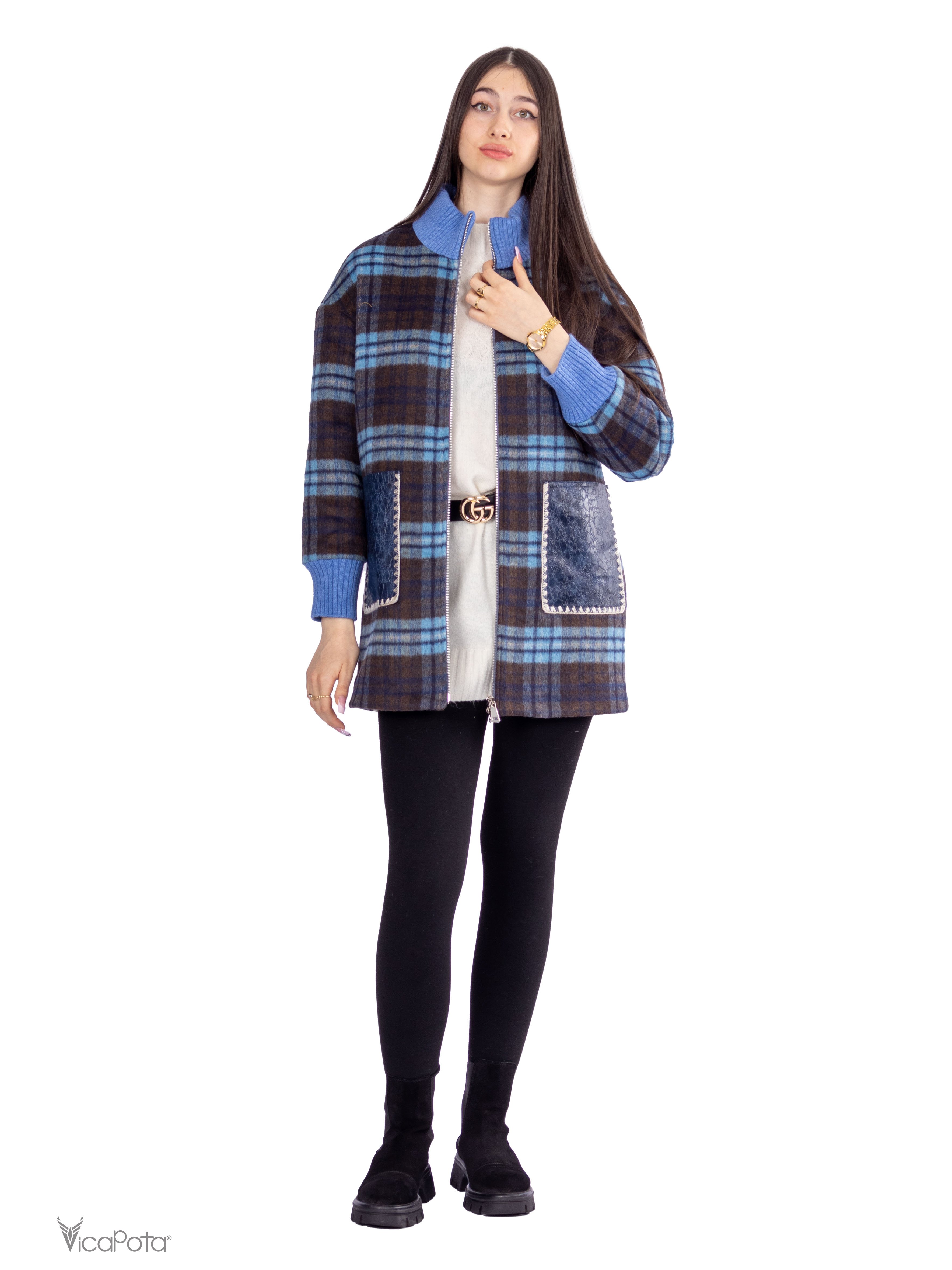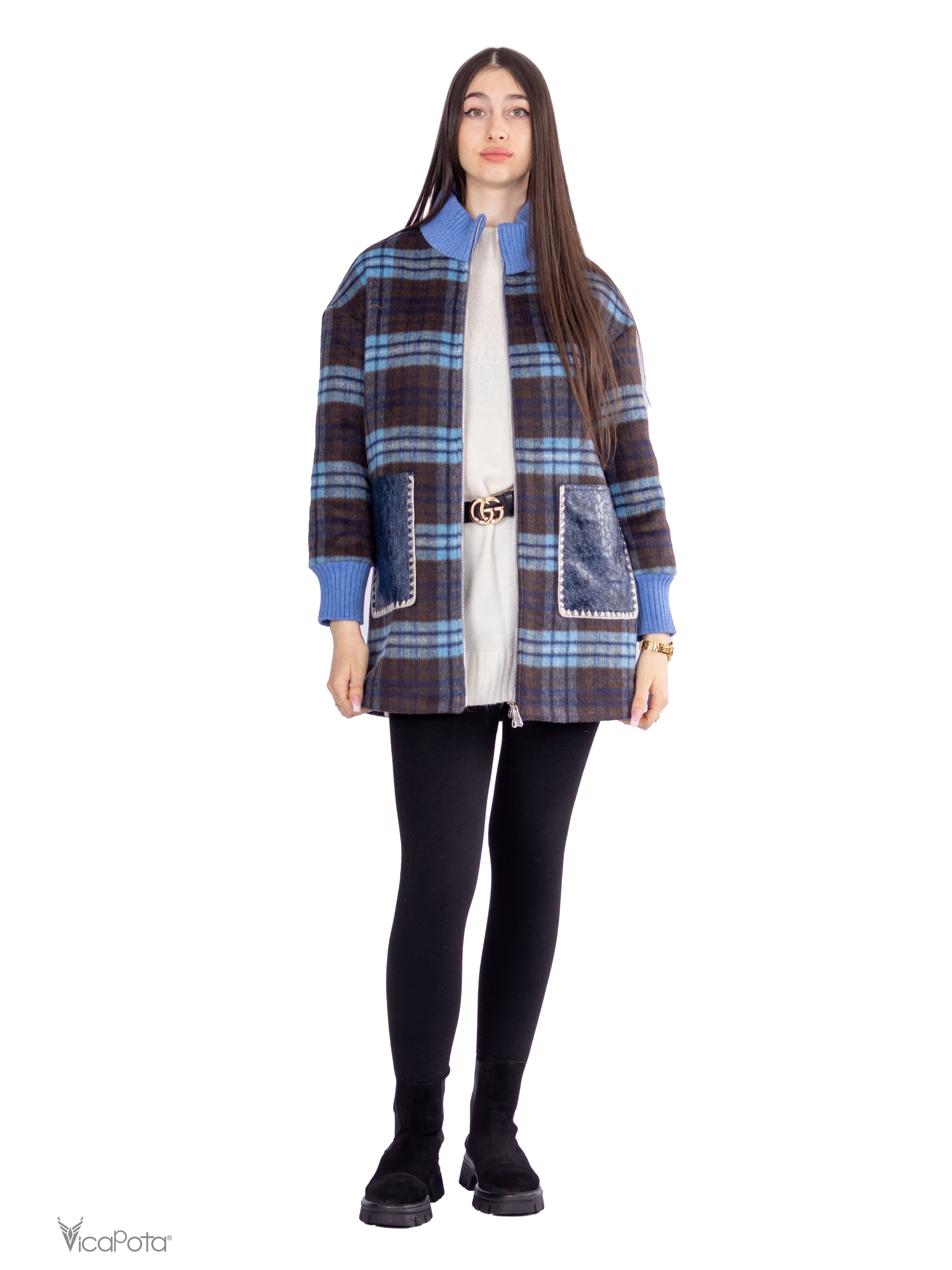 - **Дизайн:** синьо-коричневий клітчастий принт для стильного образу.