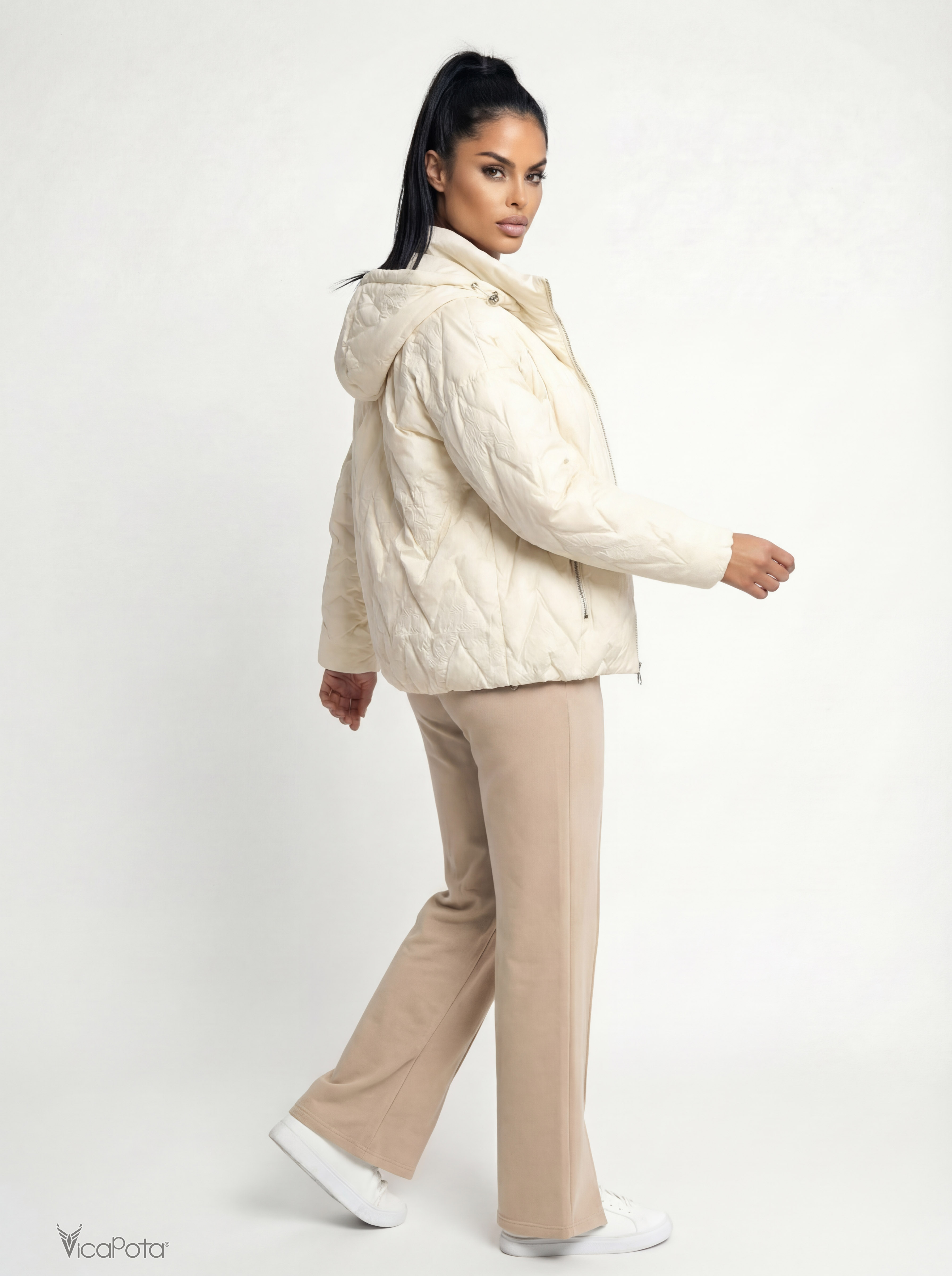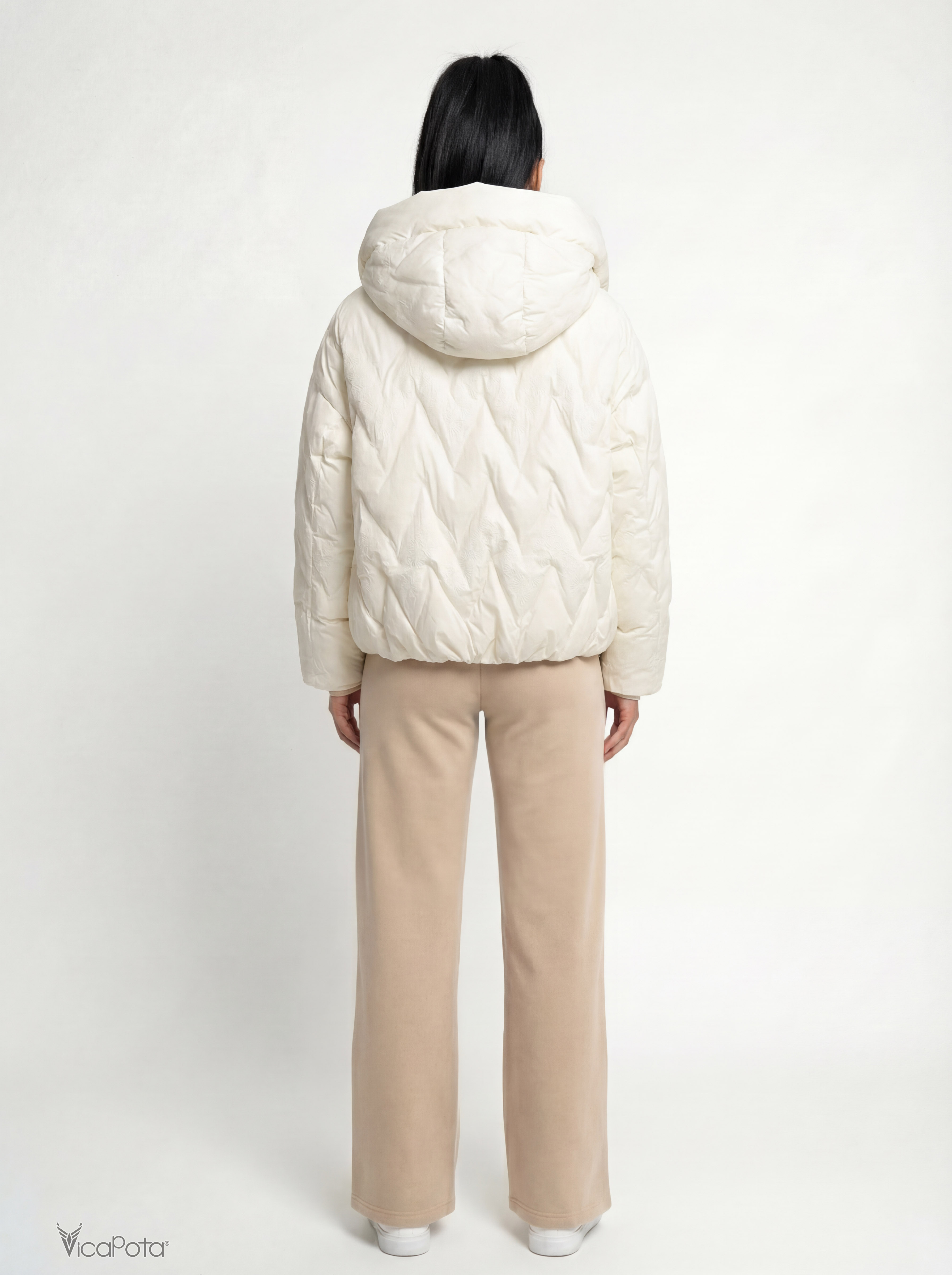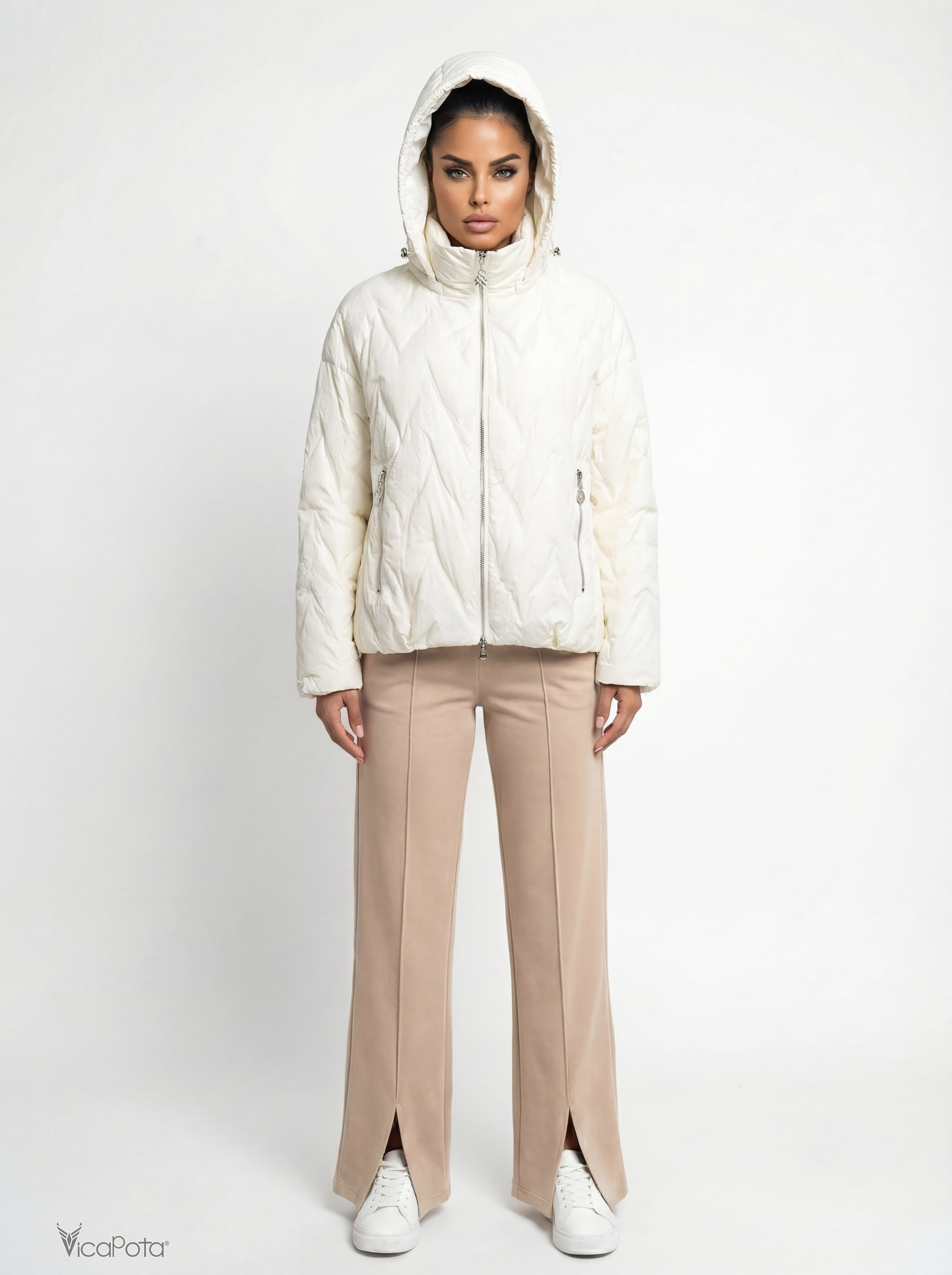 Жіноча біла куртка з капюшоном, 65 см