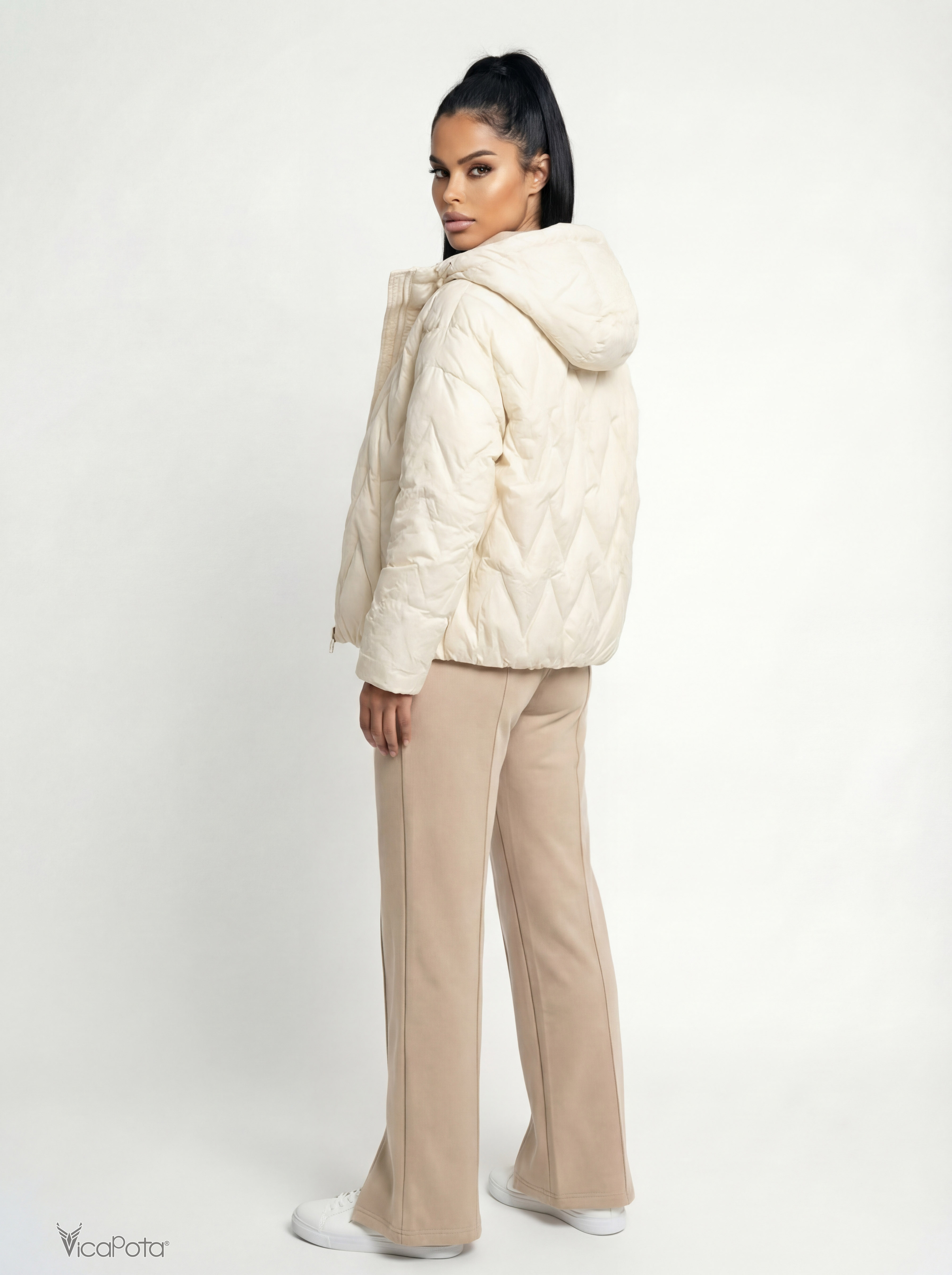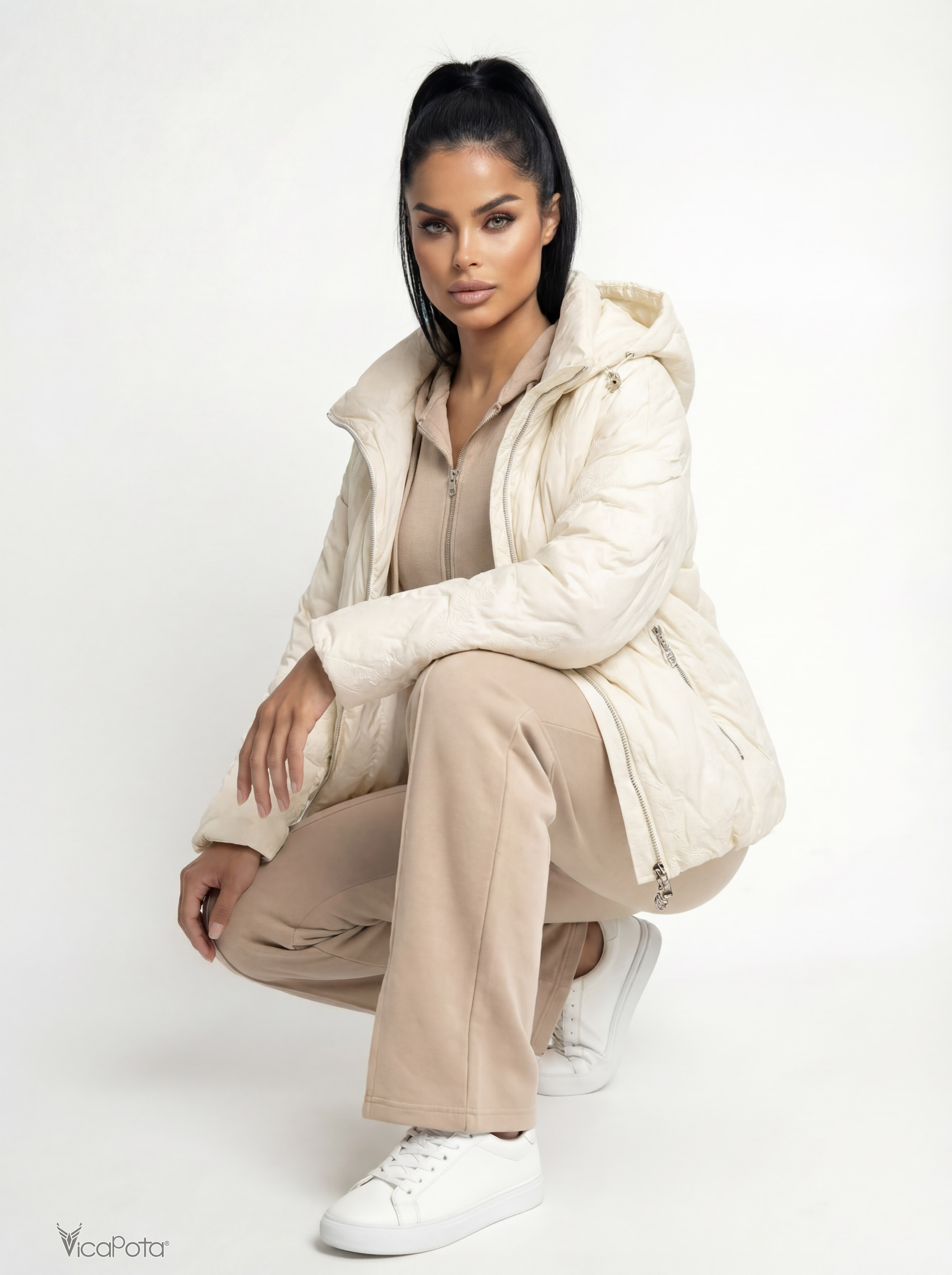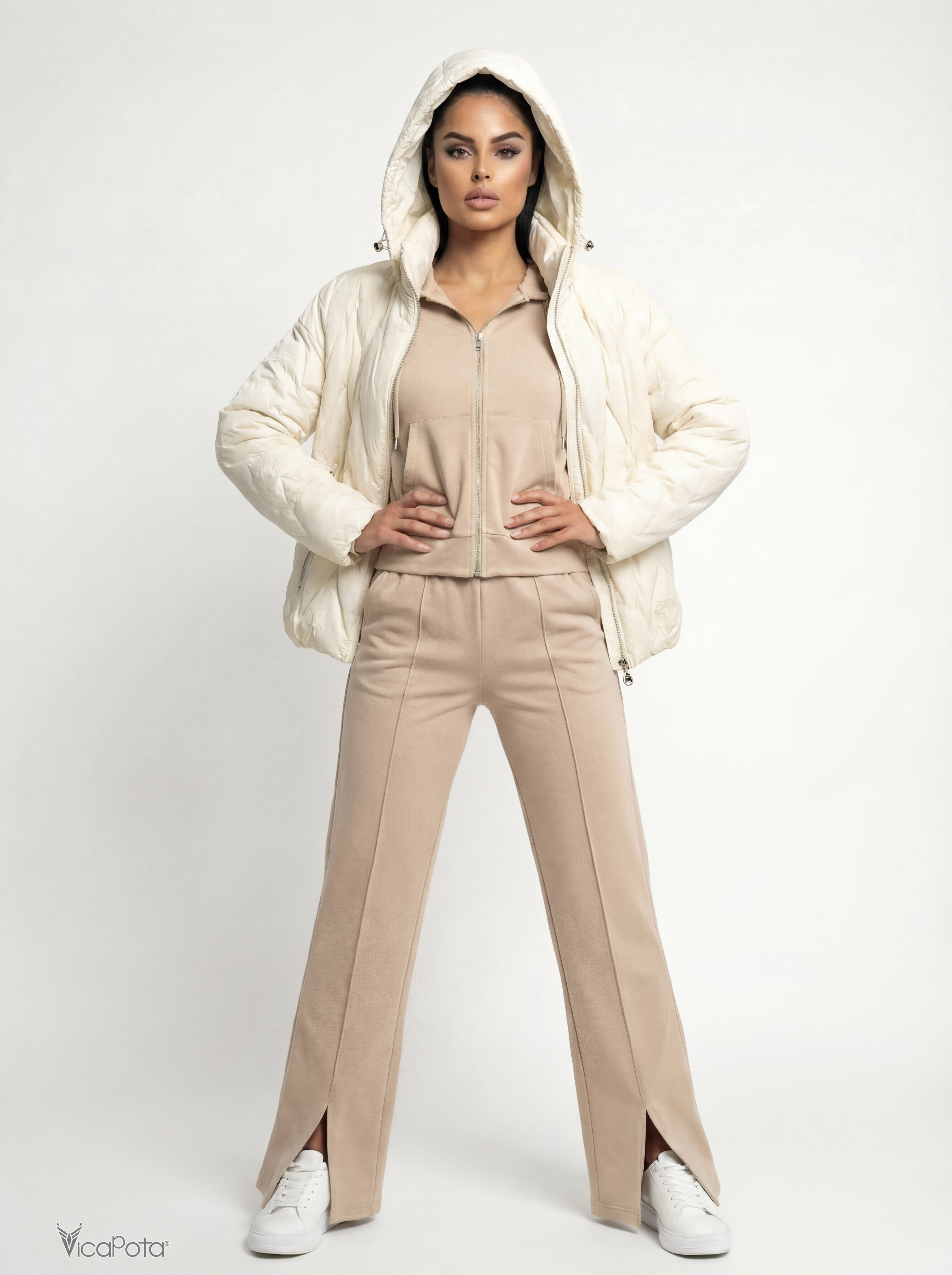 Жіноча біла куртка з капюшоном, 65 см