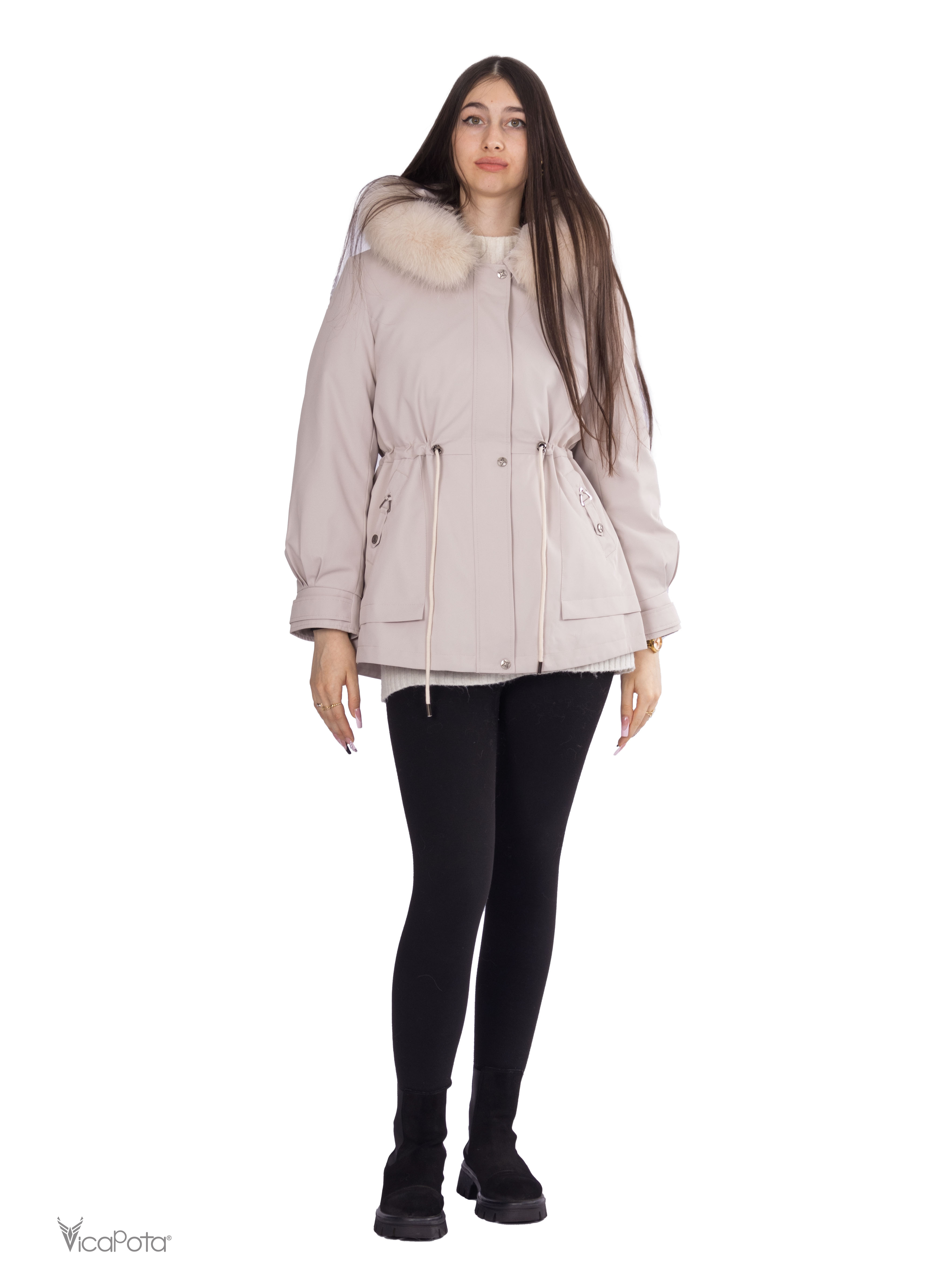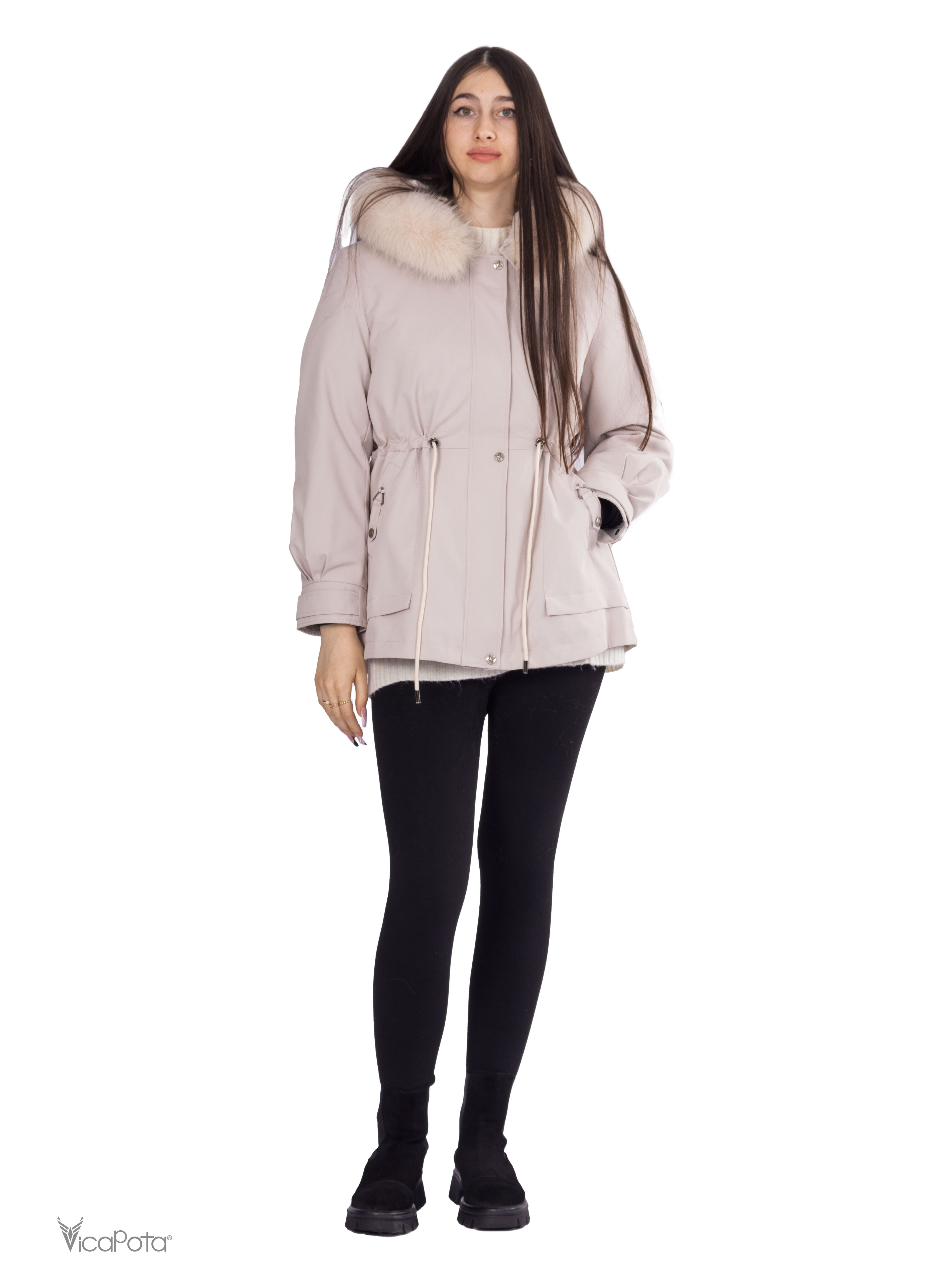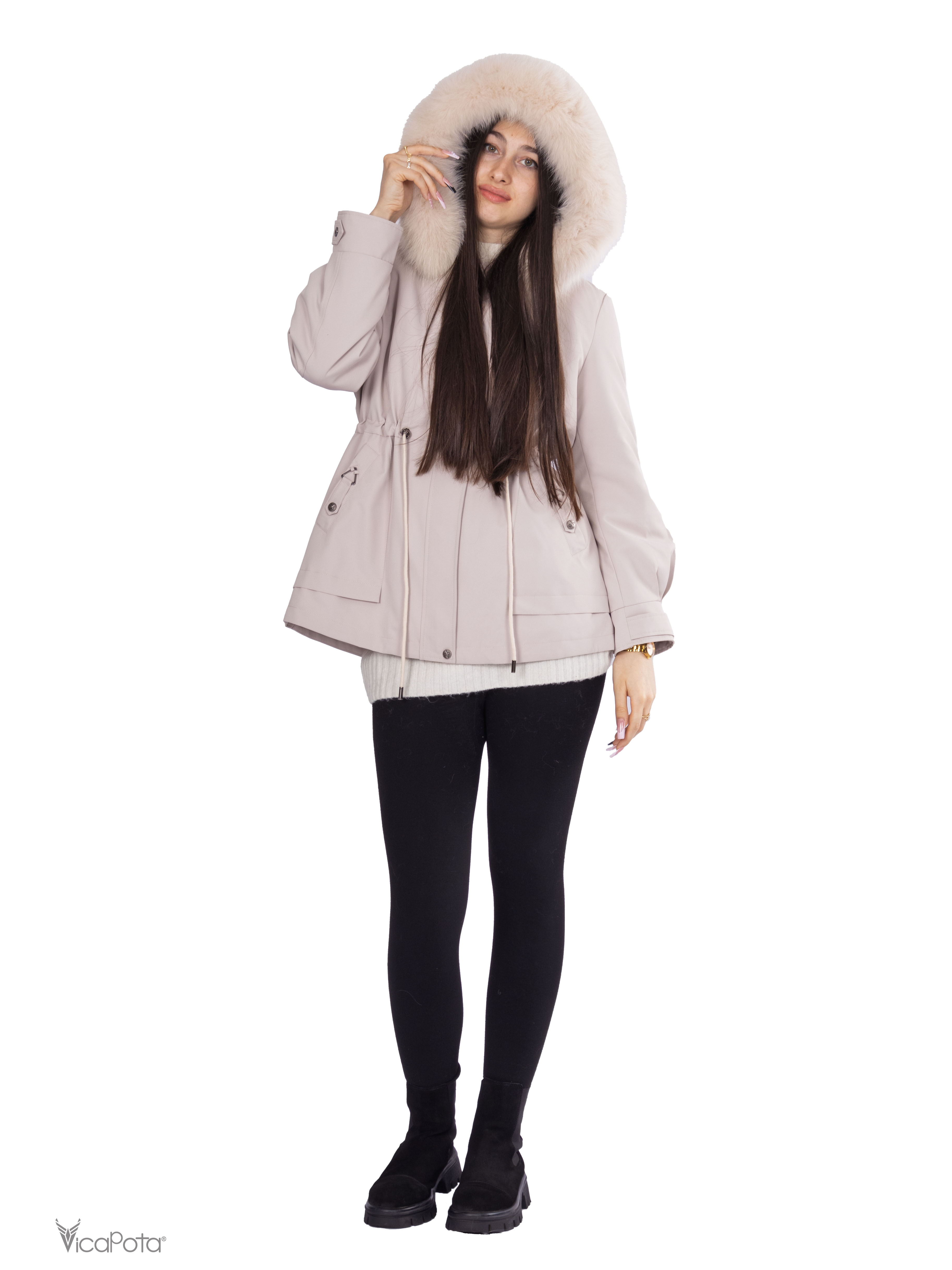 - **Хутро:** натуральне хутро кролика у знімній підкладці забезпечує тепло та комфорт, а хутро песця додає вишуканості.
