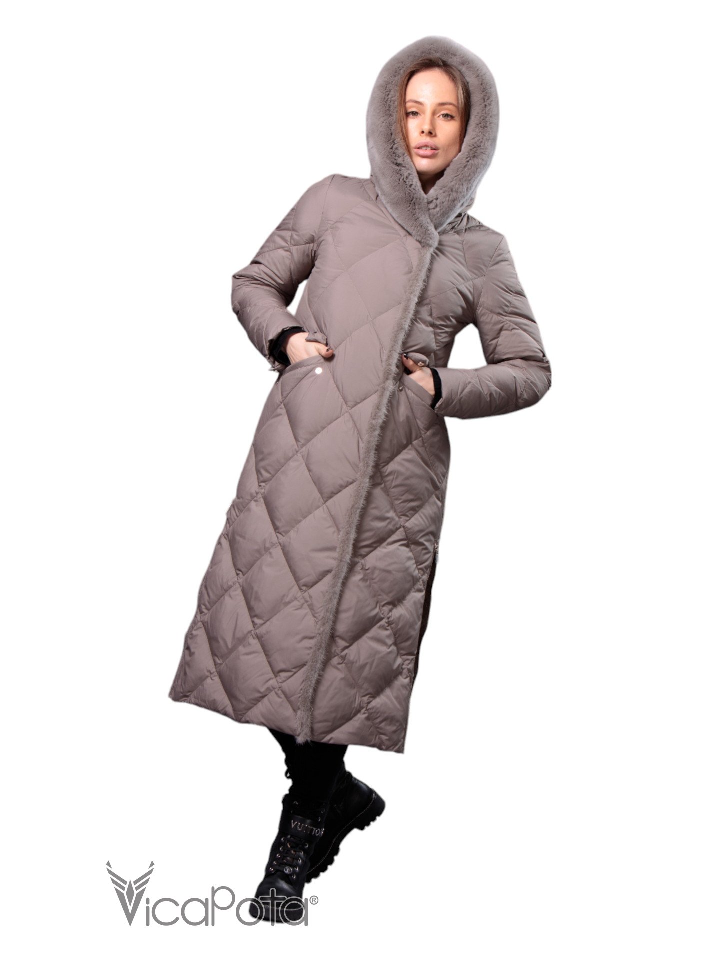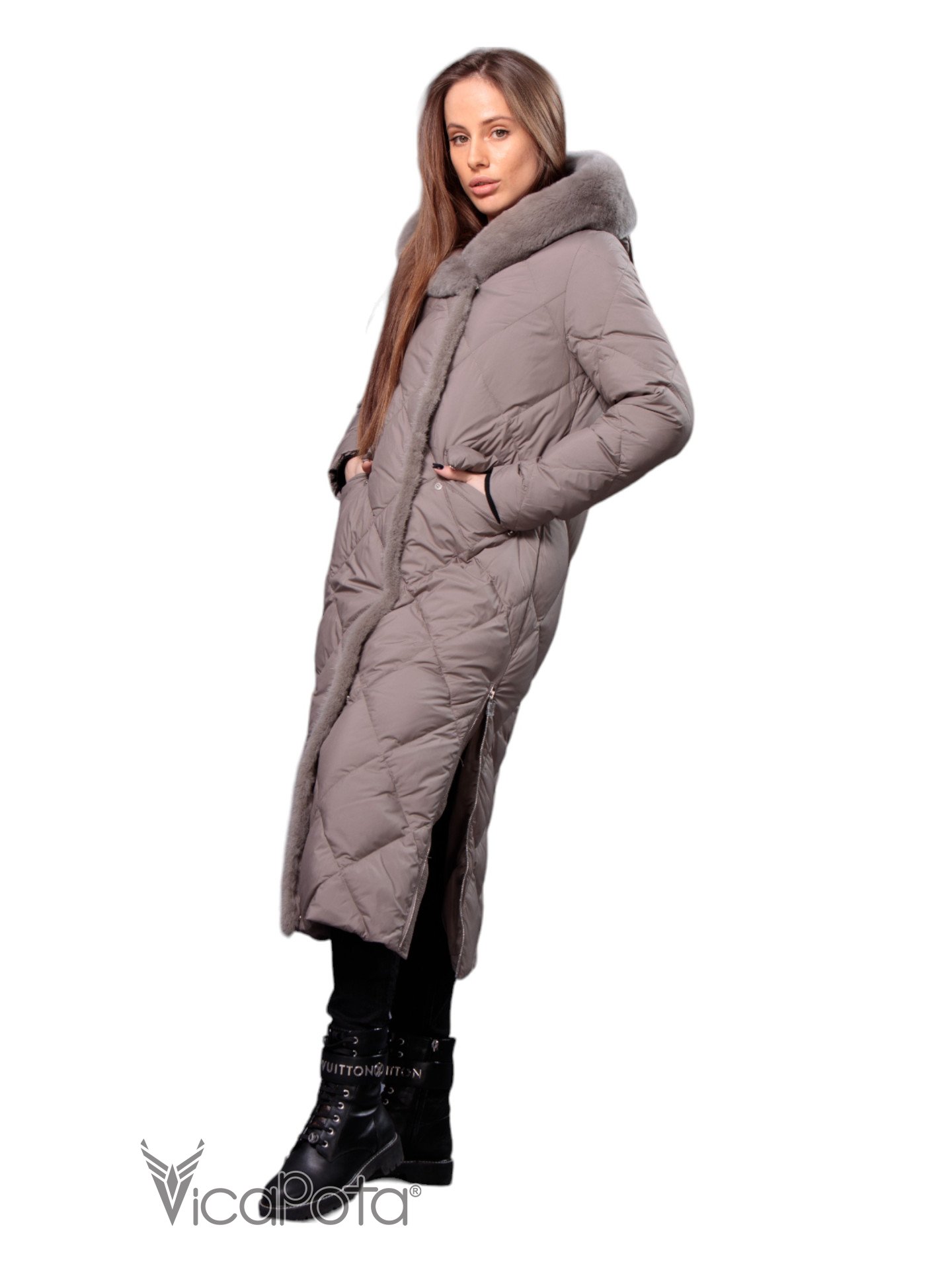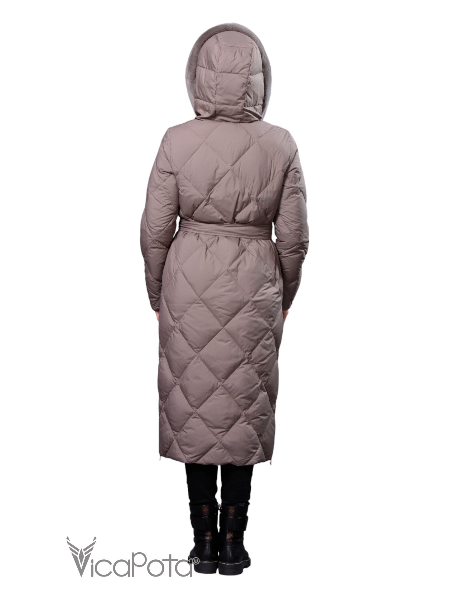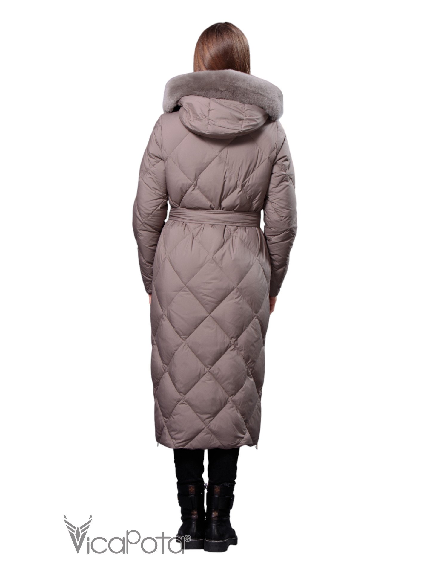 Пуховик наповнений натуральним гусячим пухом, забезпечуючи неперевершену теплоізоляцію у холодні дні. Параметри виробу: Обхват грудей – 100 см, обхват талії – 98 см, обхват стегон – 104 см, довжина – 120 см.