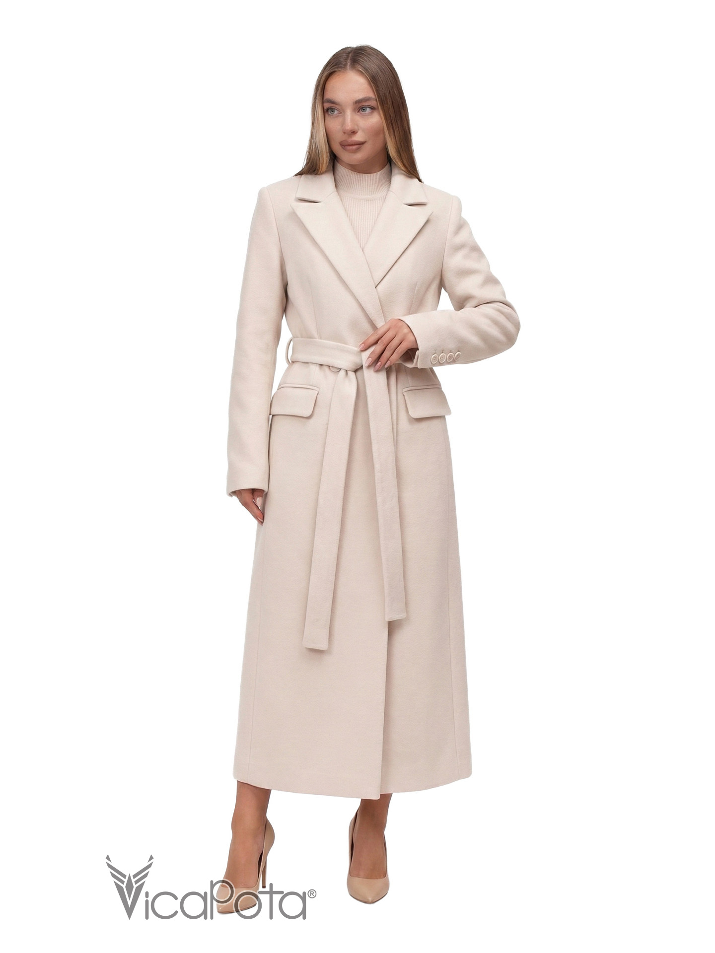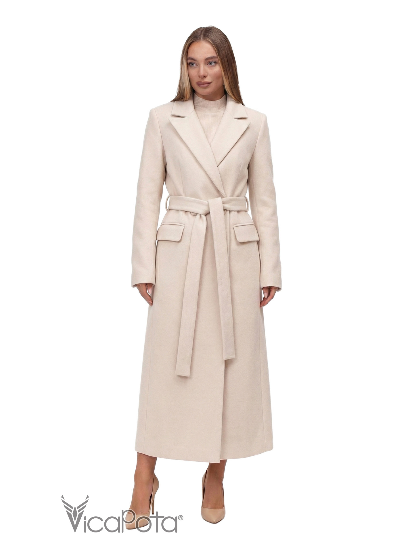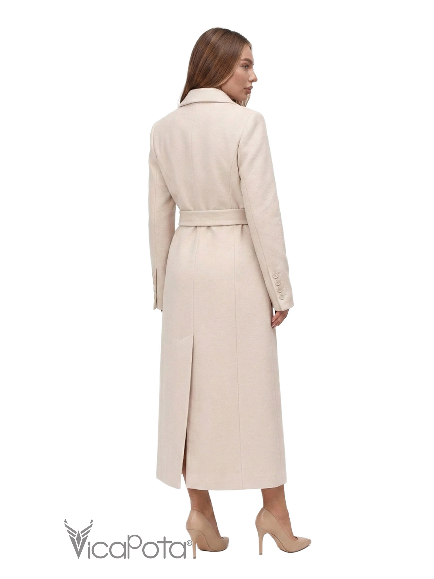 Анатомічний крій та виточки забезпечують щільне прилягання – пальто «сидить як влите». Довжина максі візуально витягує зростання і стрункішає. Пояс у комплекті дозволяє зробити додатковий акцент на талії, посилюючи ефект «пісочного годинника», але навіть без нього пальто зберігає свою чітку, приталену форму.