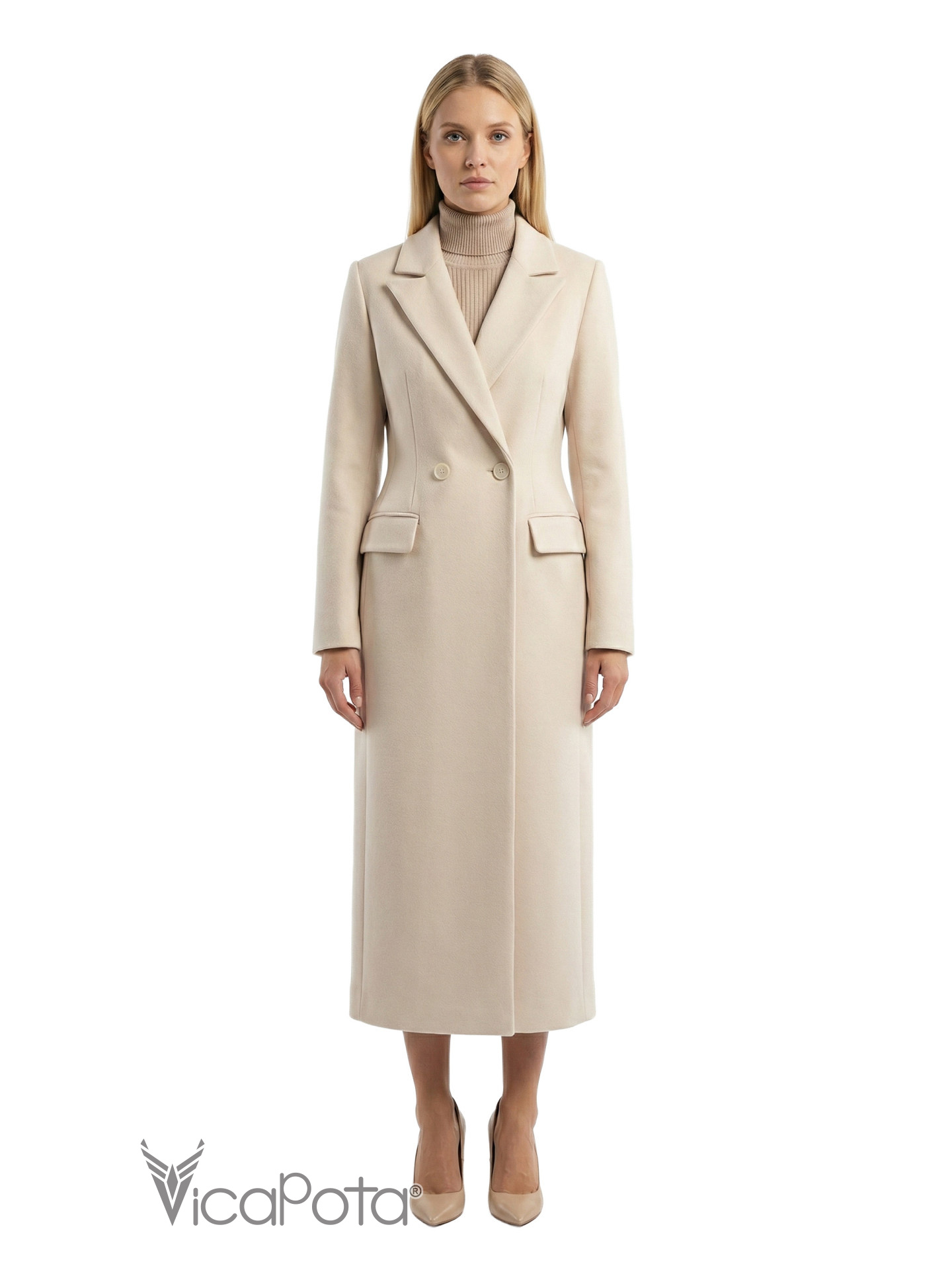 Опис: Вишукане двобортне пальто для тих, хто цінує суворі лінії та бездоганний силует. На відміну від об'ємних моделей, це пальто скроєне так, щоб ідеально окреслювати фігуру, створюючи витончений і статний образ.