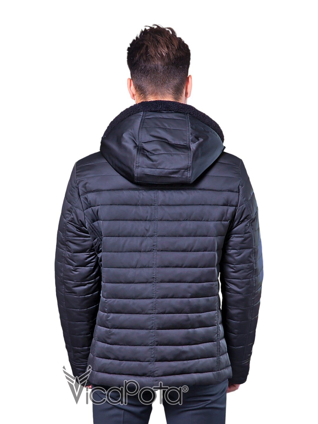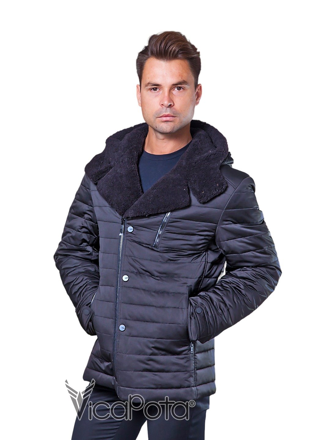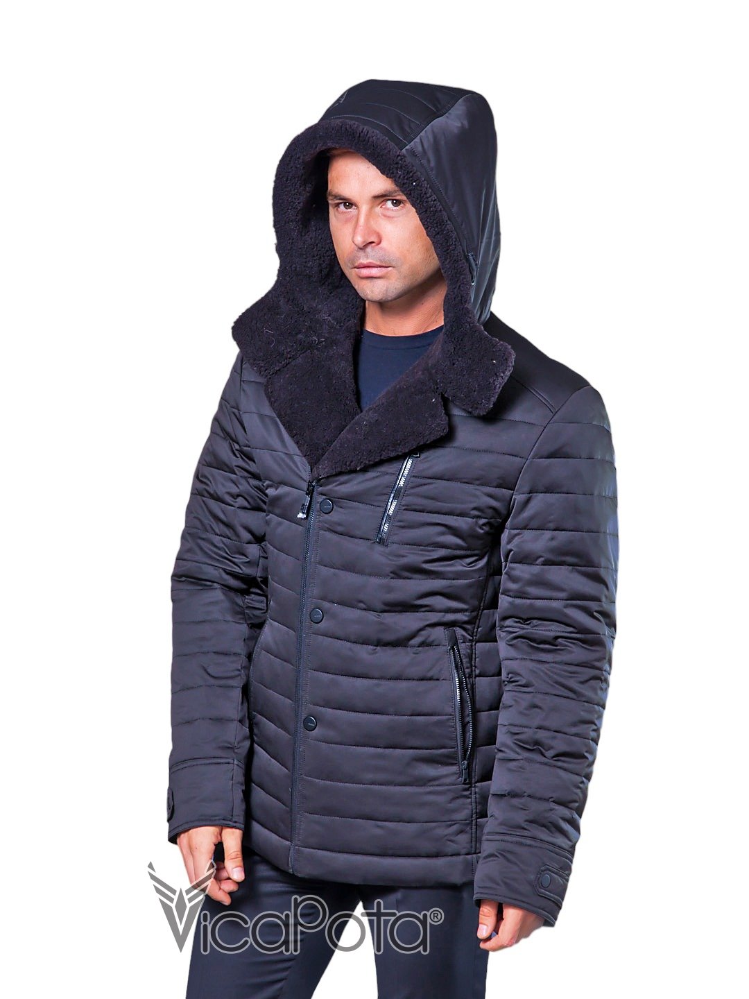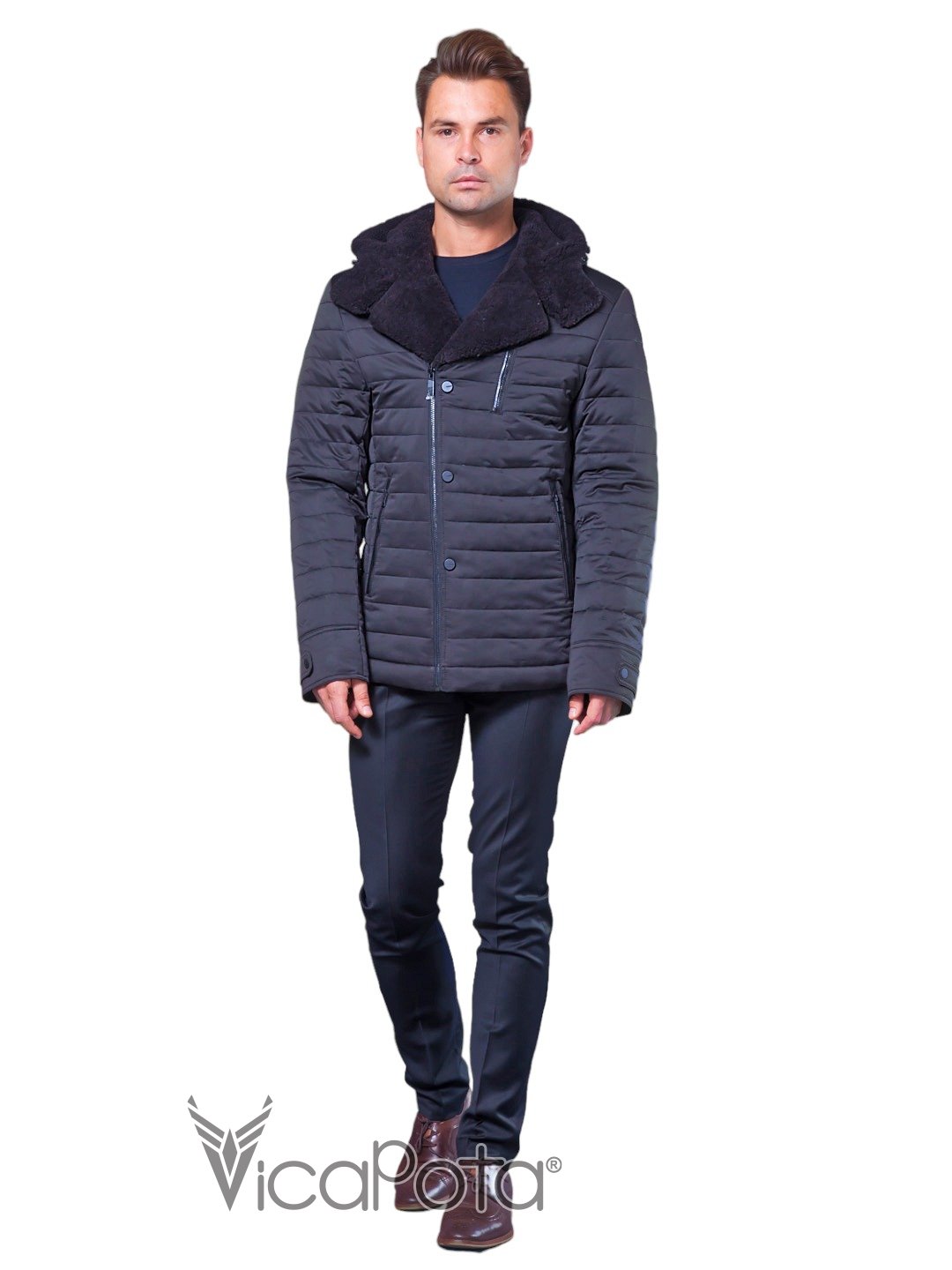 Чоловічий текстильний пуховик чорного кольору. Виконаний з водостійкого текстилю. Утеплювач - Thinsulate. Довжина виробу 70 см. Пуховик з каптуром, каптур утеплений натуральним мутоном-керлі. Фурнітура – чорна асиметрична блискавка й матові кнопки. Дві бічні й нагрудний кишені, застібаються блискавкою. Усередині виробу дві внутрішні кишені на блискавці. Сучасний і модний, стьобаний пуховик злегка приталеного силуету. Сполучається з одягом спортивного стилю й з повсякденним гардеробом. Сезон осінь-зима.