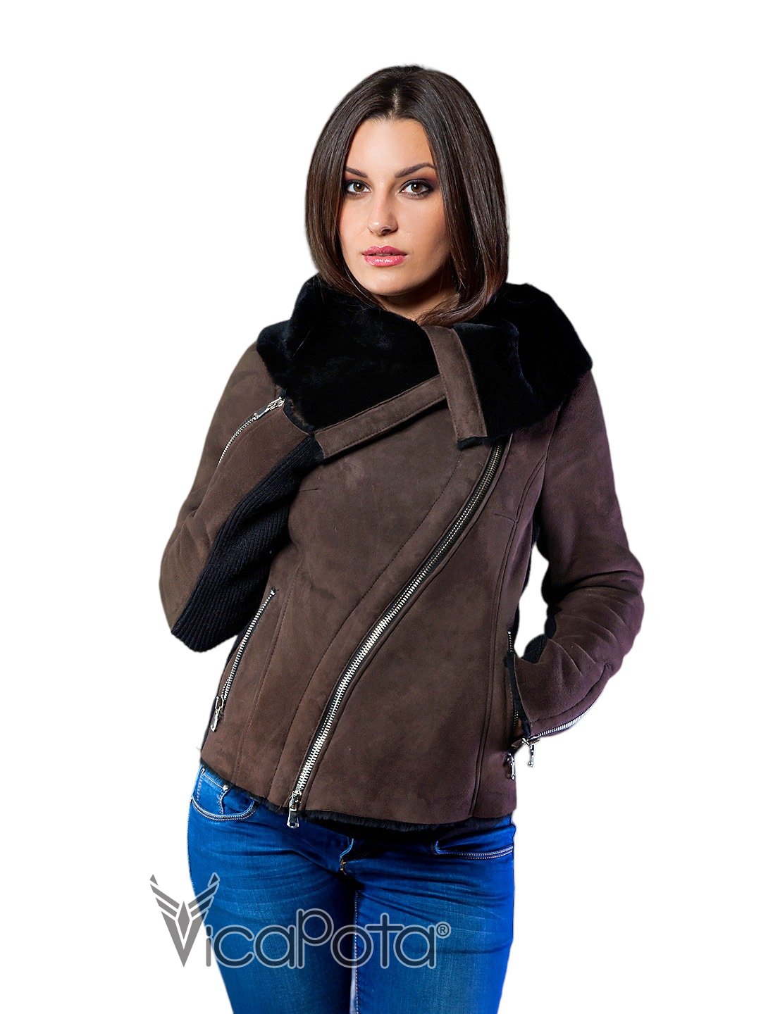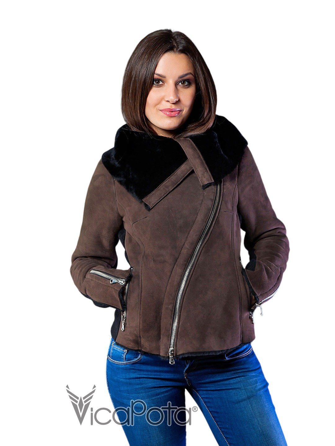 Жіноча натуральна дублянка шоколадного кольору з овчини по типу косухи. Довжина 60 см. Застібка коса блискавка . Фурнітура кольору темний металік. Декорована з боків в'язаними вовняними вставками, змійки на рукавах і на спині. Є дві бічні кишені. Воріт відкладний, який можна обіграти різними аксесуарами (головним убором, шарфом). Яскрава, стильна, тепла дублянка стане незамінною річчю на щодня.