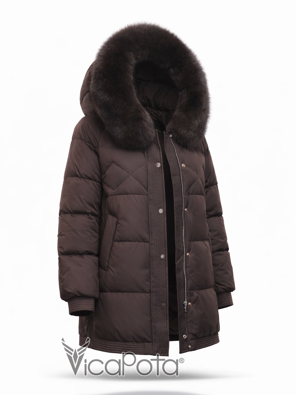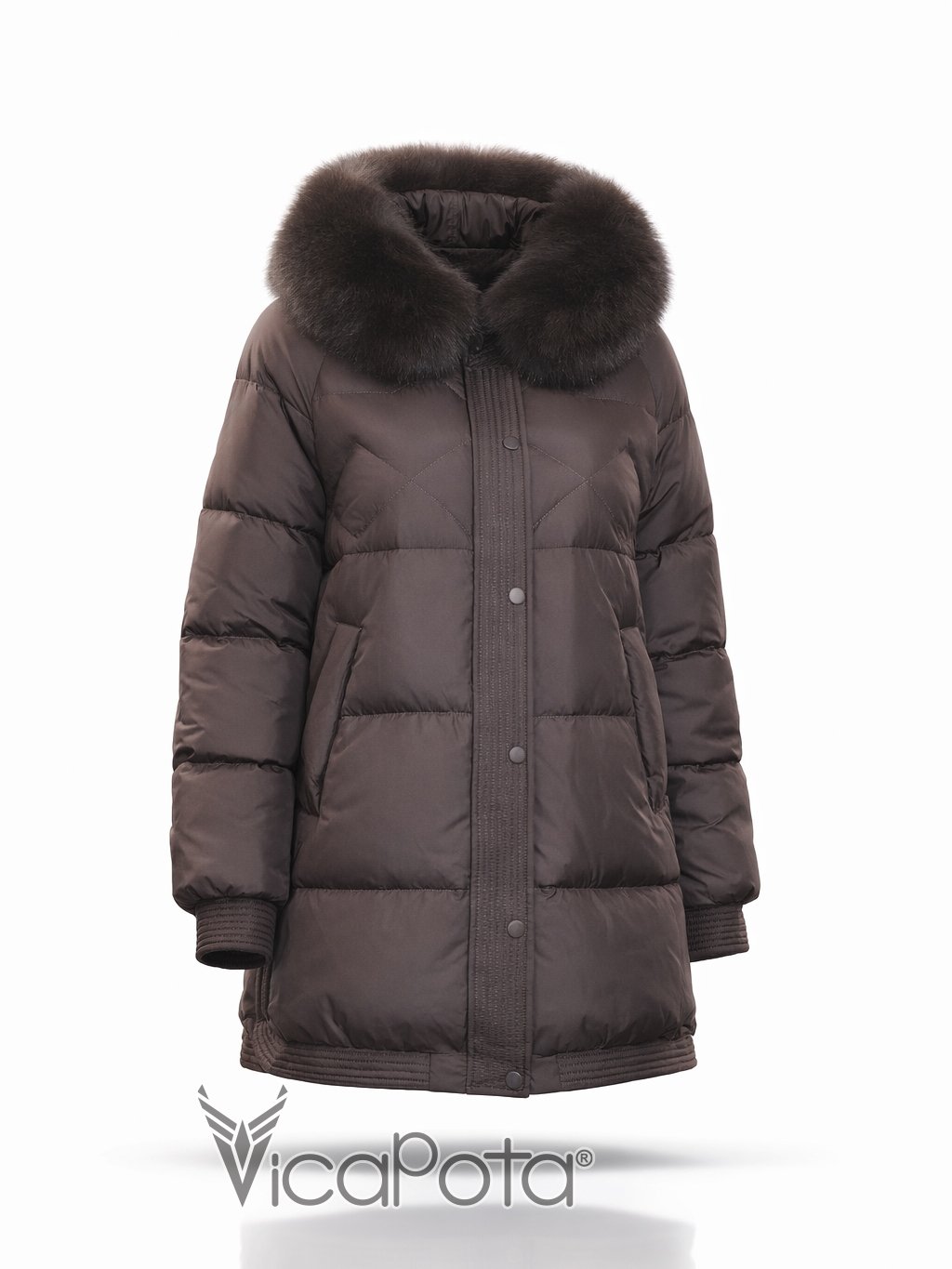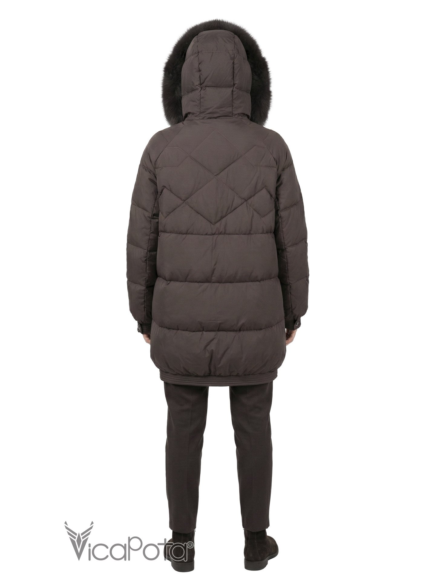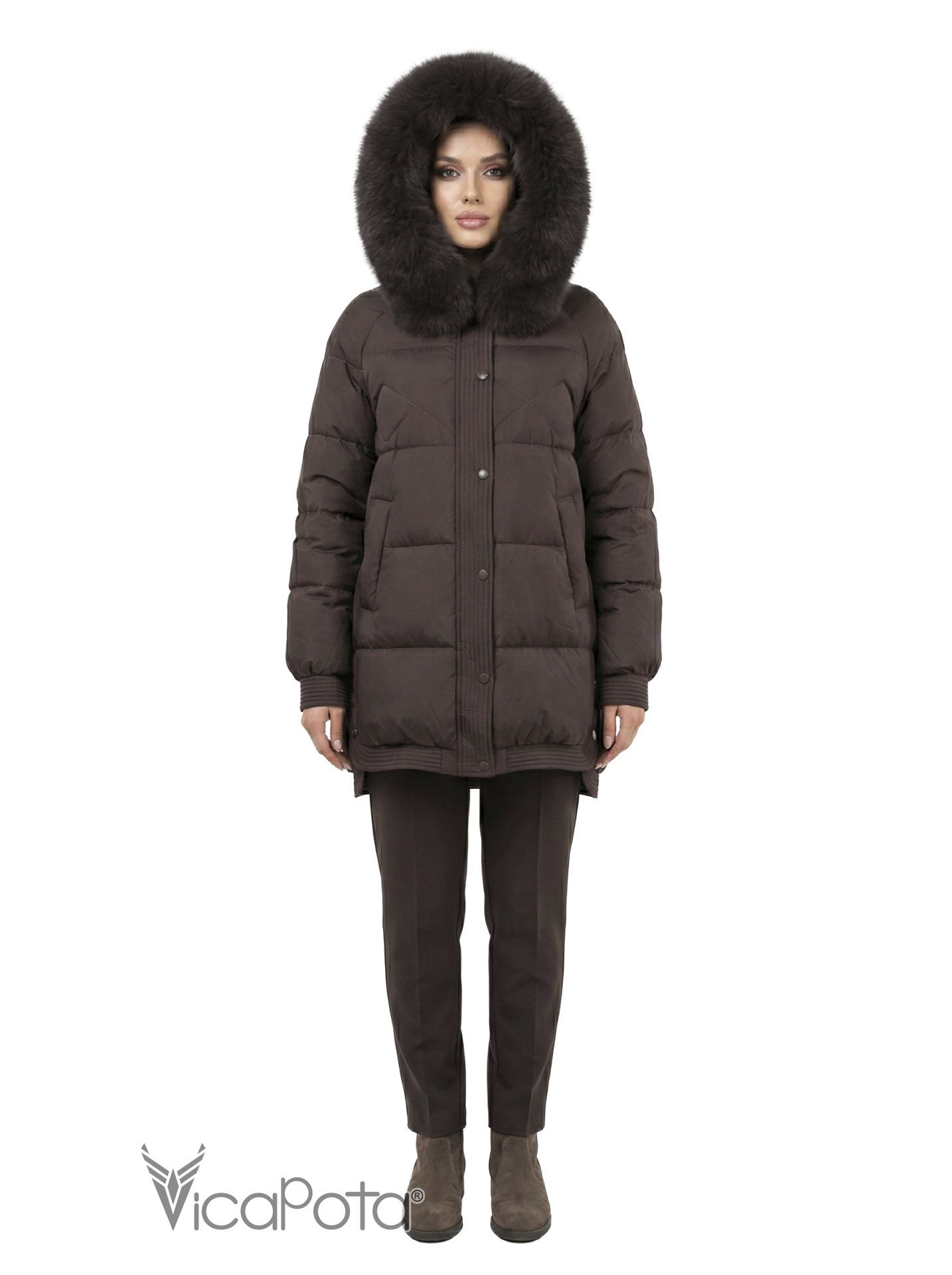 Натуральний пух у якості наповнювача гарантує високий рівень теплоізоляції без зайвої ваги. Капюшон оздоблений натуральним хутром песця, що додає образу статусності та забезпечує додатковий захист у холодну погоду.