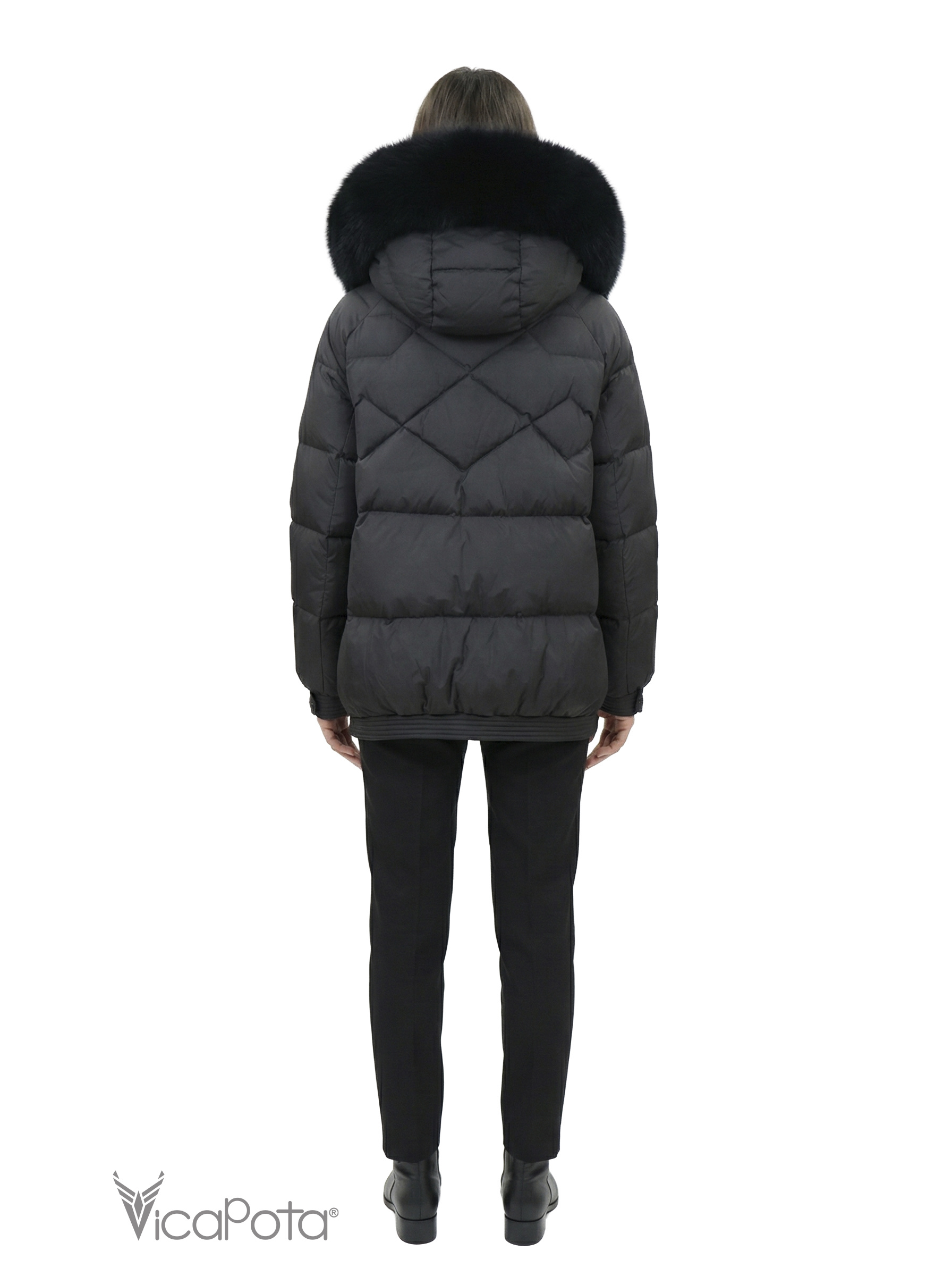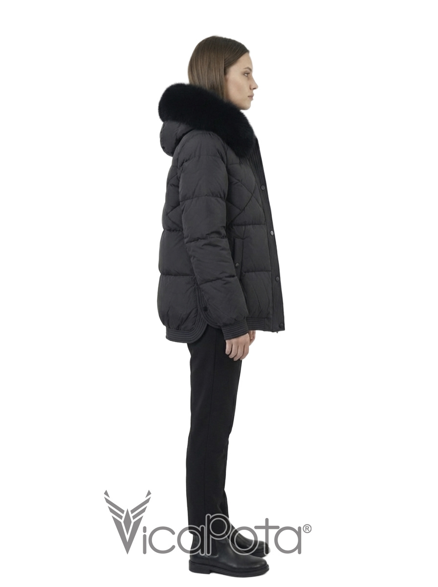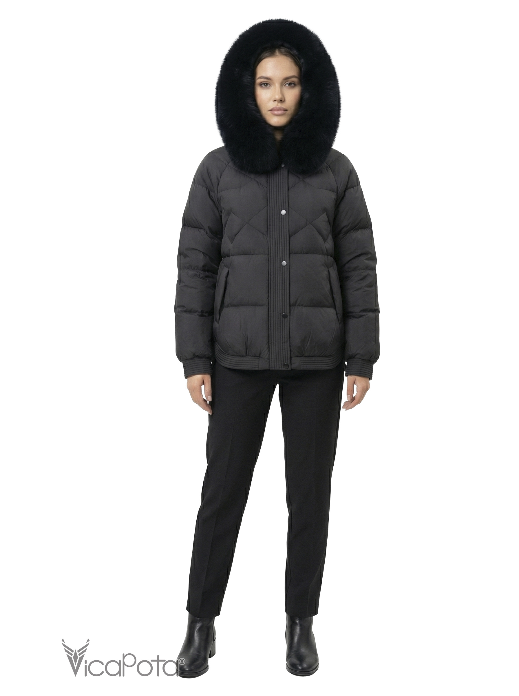Пуховик доповнений капюшоном із об’ємною хутряною опушкою чорного кольору. Хутро виглядає розкішно, може носитися навколо обличчя або вкладатися у вигляді коміра.