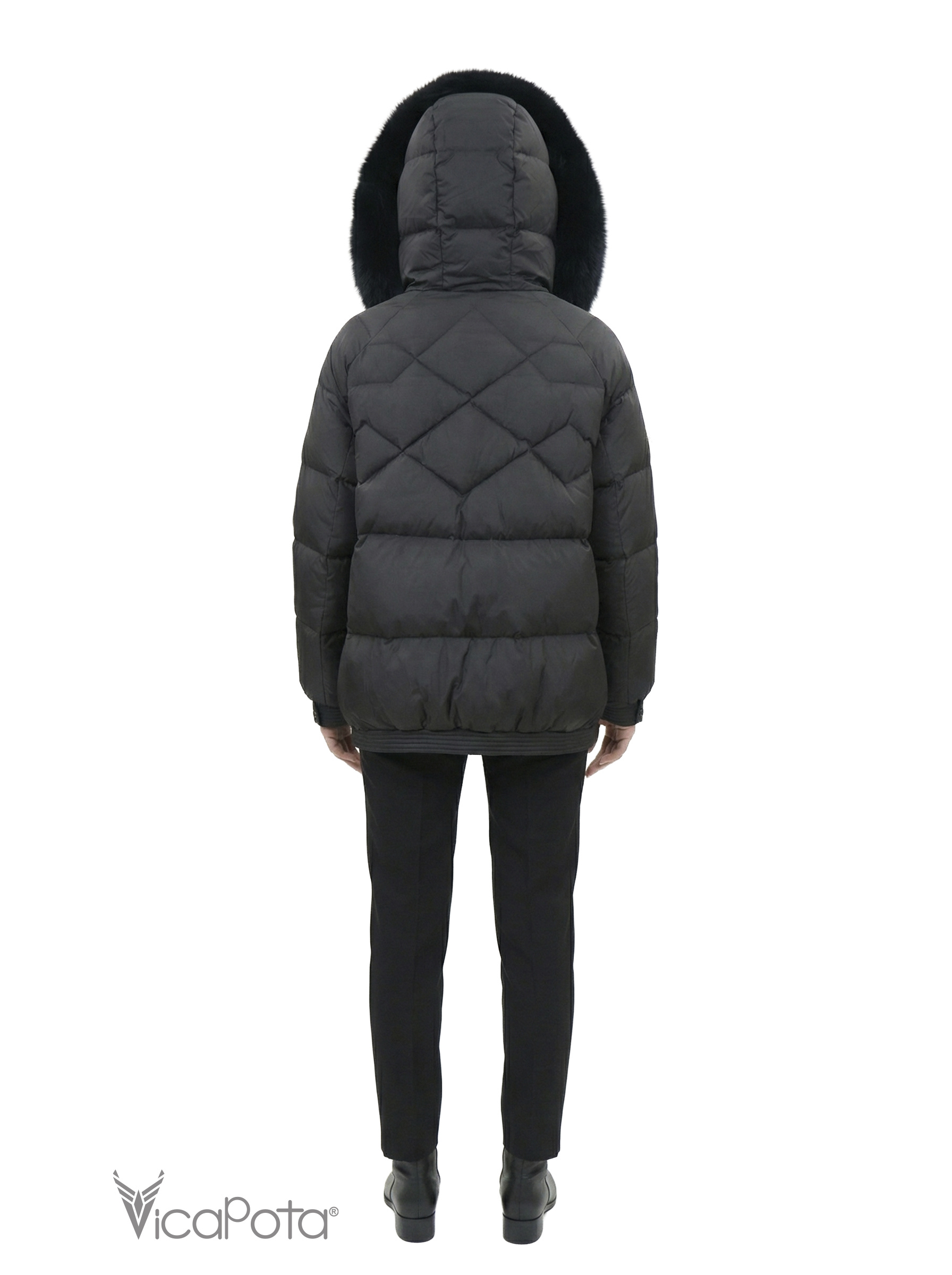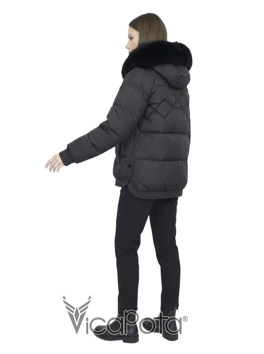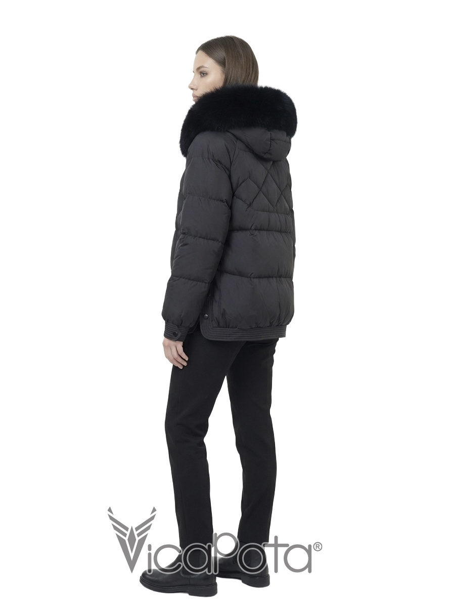 Пуховик доповнений капюшоном із об’ємною хутряною опушкою чорного кольору. Хутро виглядає розкішно, може носитися навколо обличчя або вкладатися у вигляді коміра.
