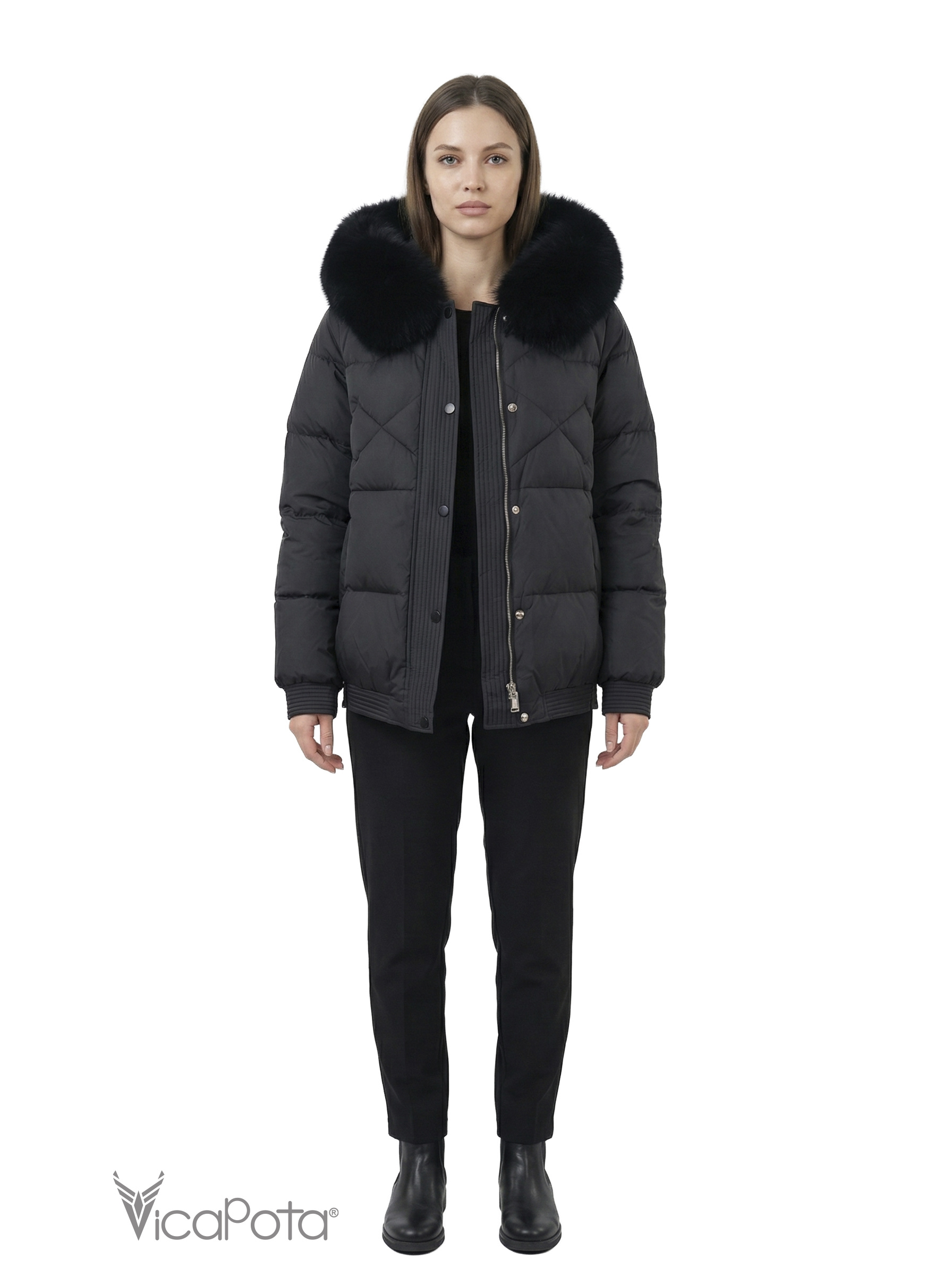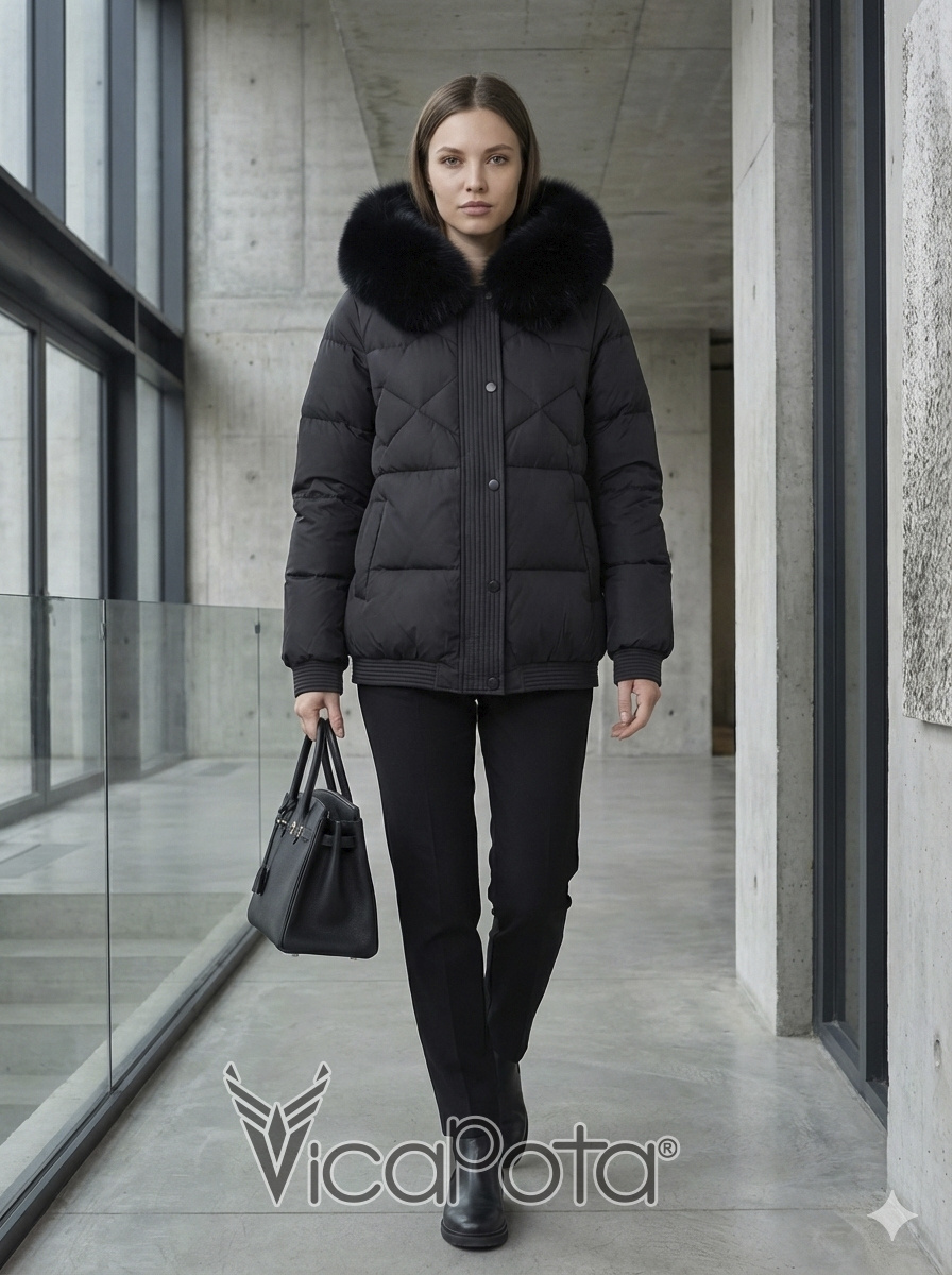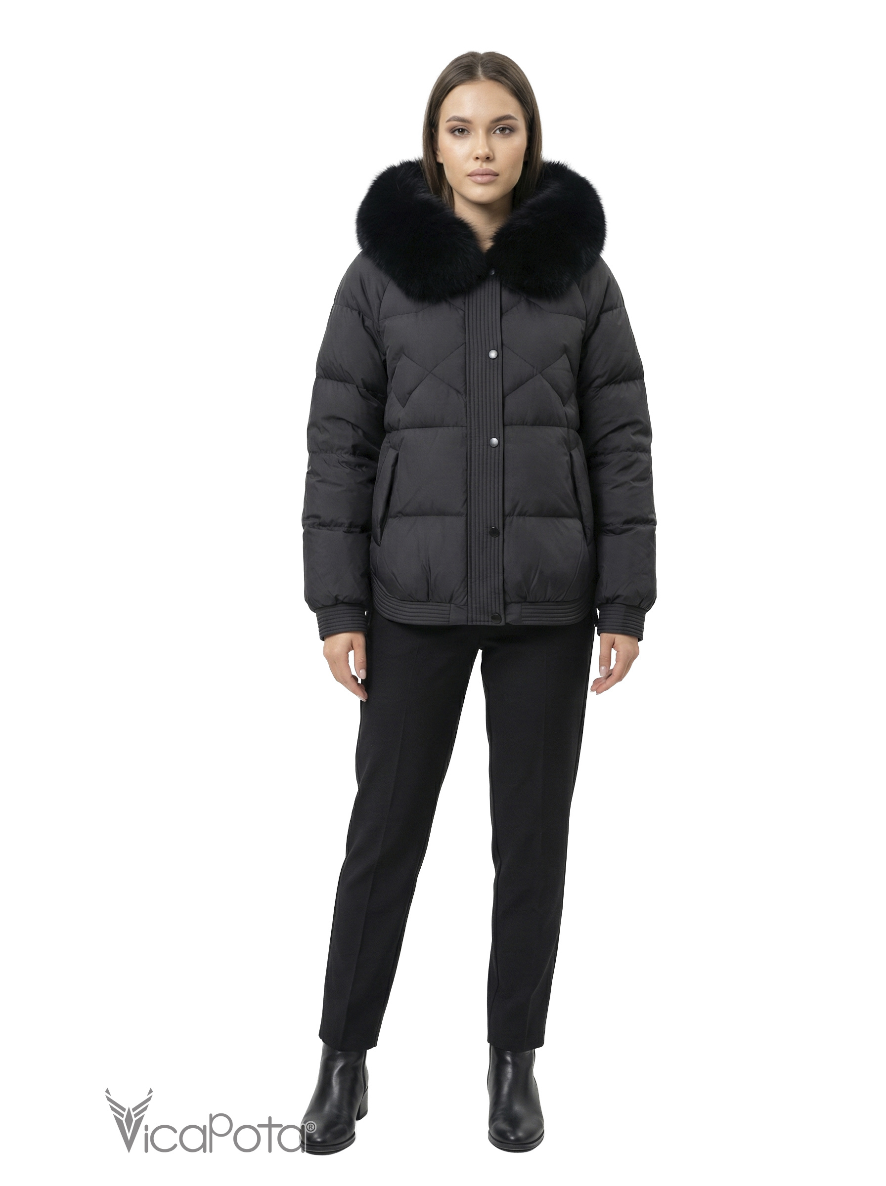 Жіночий пуховик-бомбер преміум-рівня, створений для холодної зими та активного міського життя. Модель виконана у глибокому чорному матовому кольорі, без блиску, що робить її універсальною та елегантною.