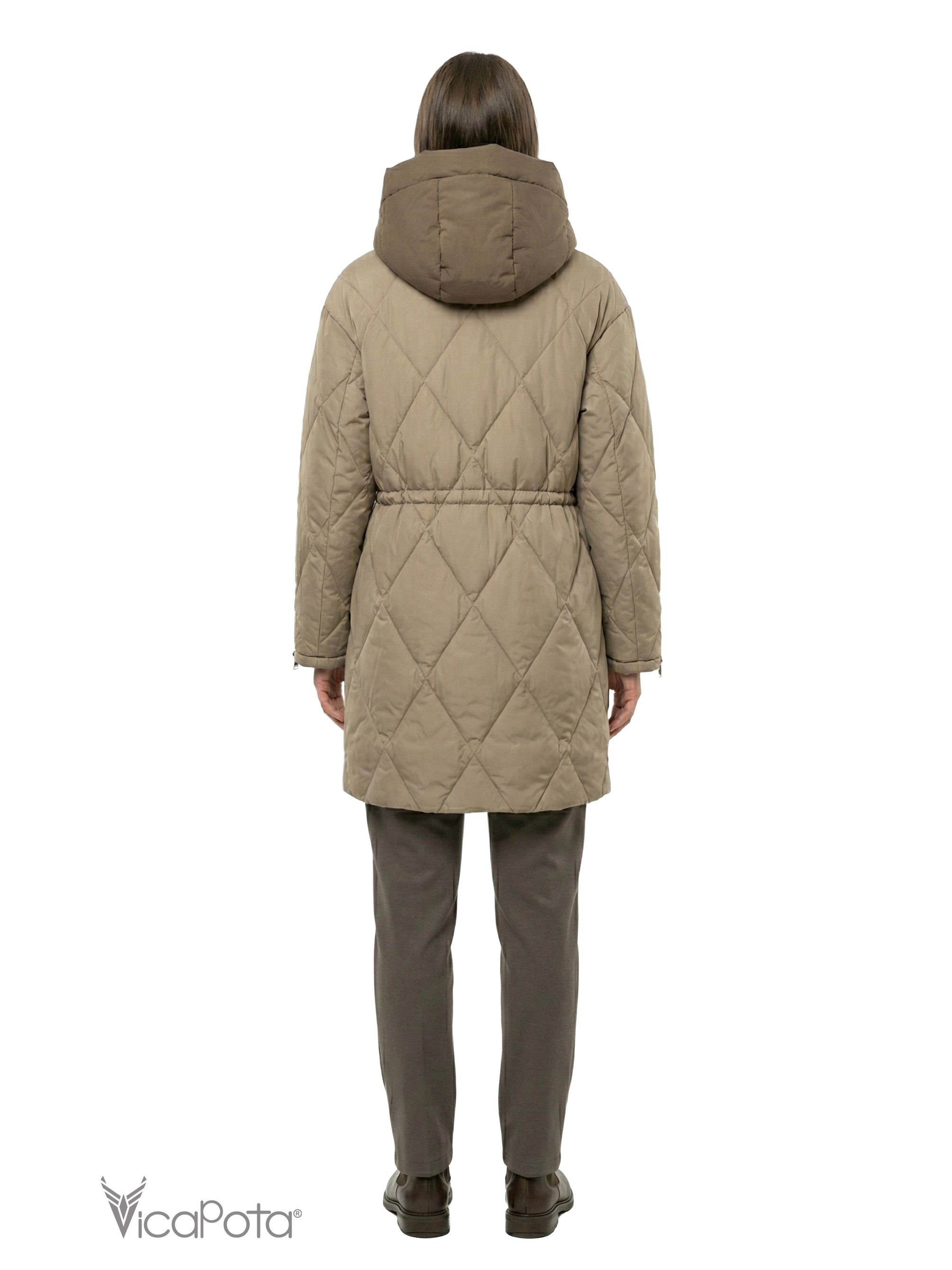 Верх виготовлений з преміальної тканини з благородним матовим ефектом — практичної, зносостійкої та приємної на дотик. Контрастний капюшон темнішого відтінку додає глибини образу та підкреслює люксовий характер виробу.