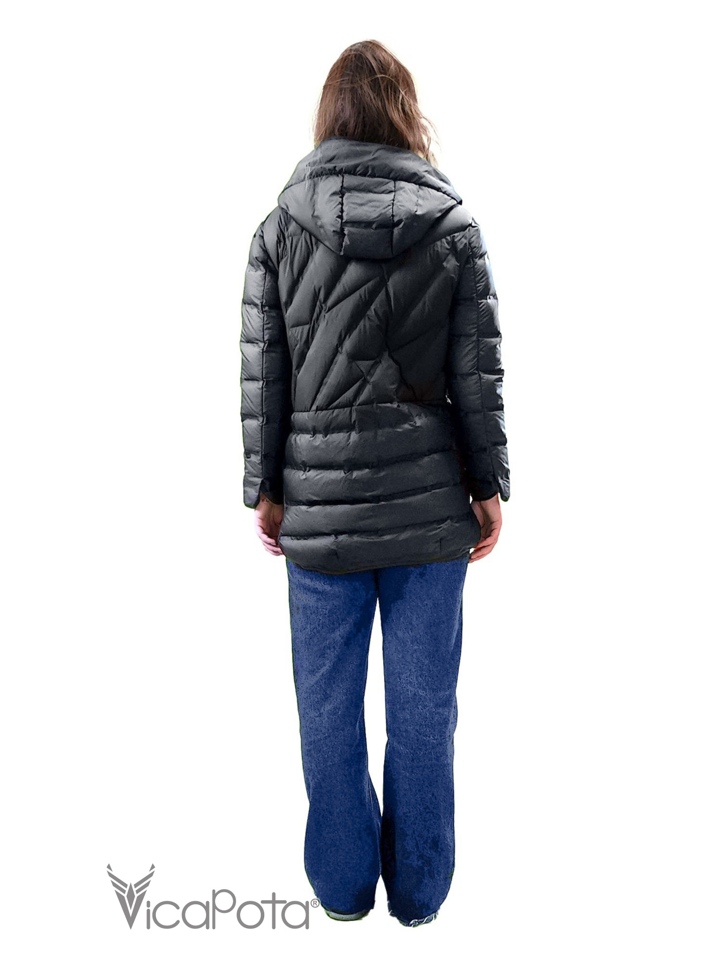 Об'ємна стьобана куртка з пуховим наповнювачем — тепла, легка та неймовірно затишна. Комбінована прострочка (діагональна на спинці, квадратна спереду) створює цікаву фактуру, а капюшон із контрастною підкладкою додає стильну деталь.