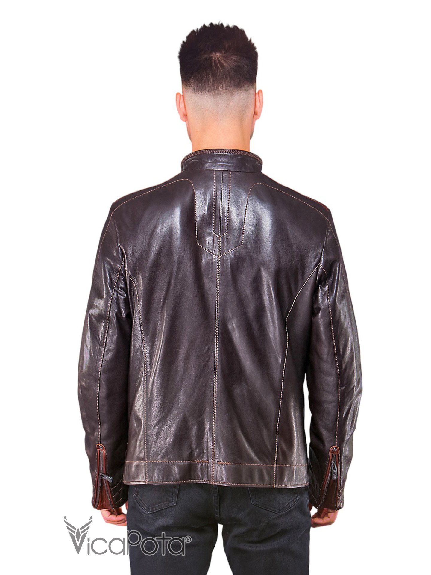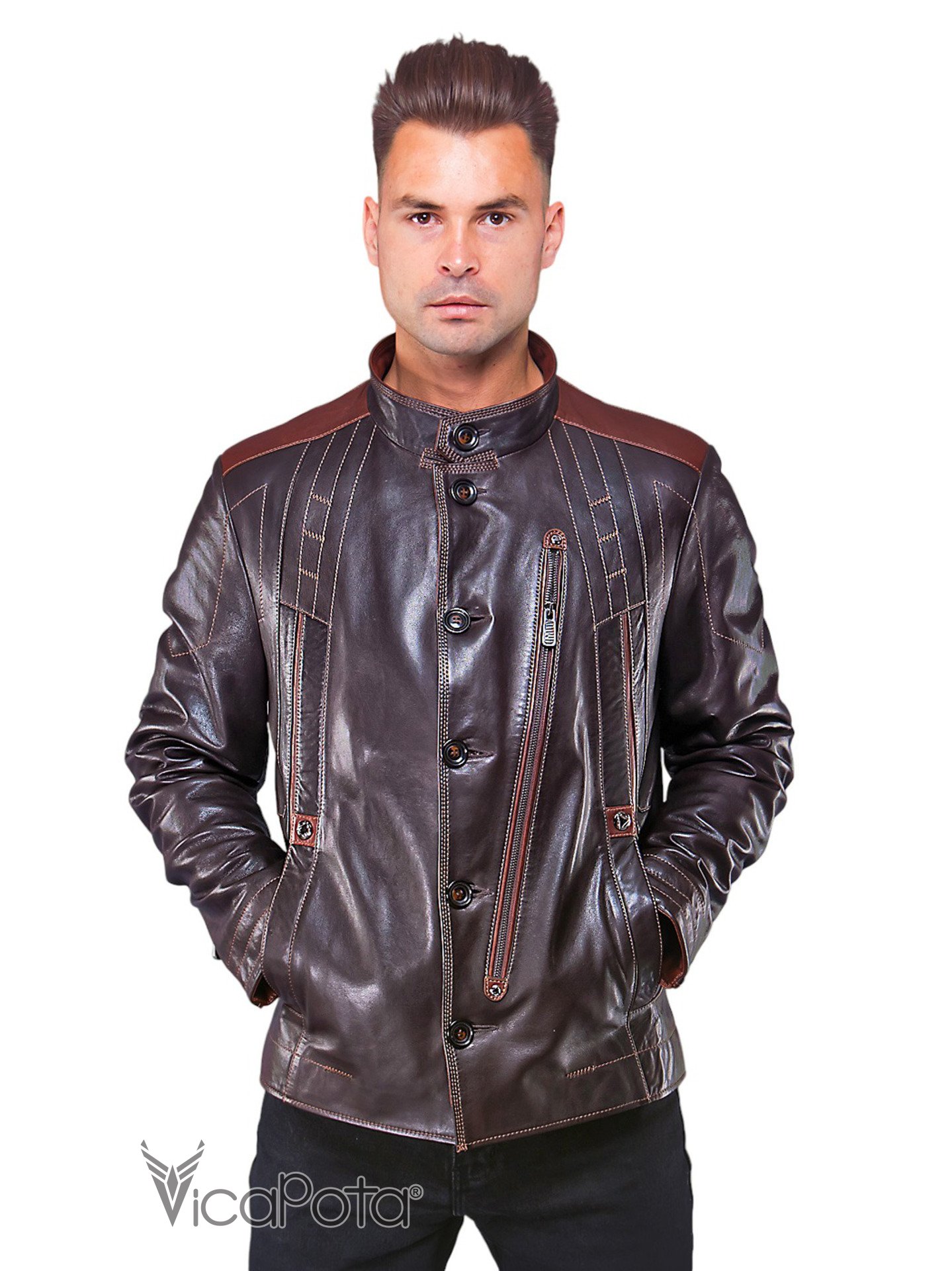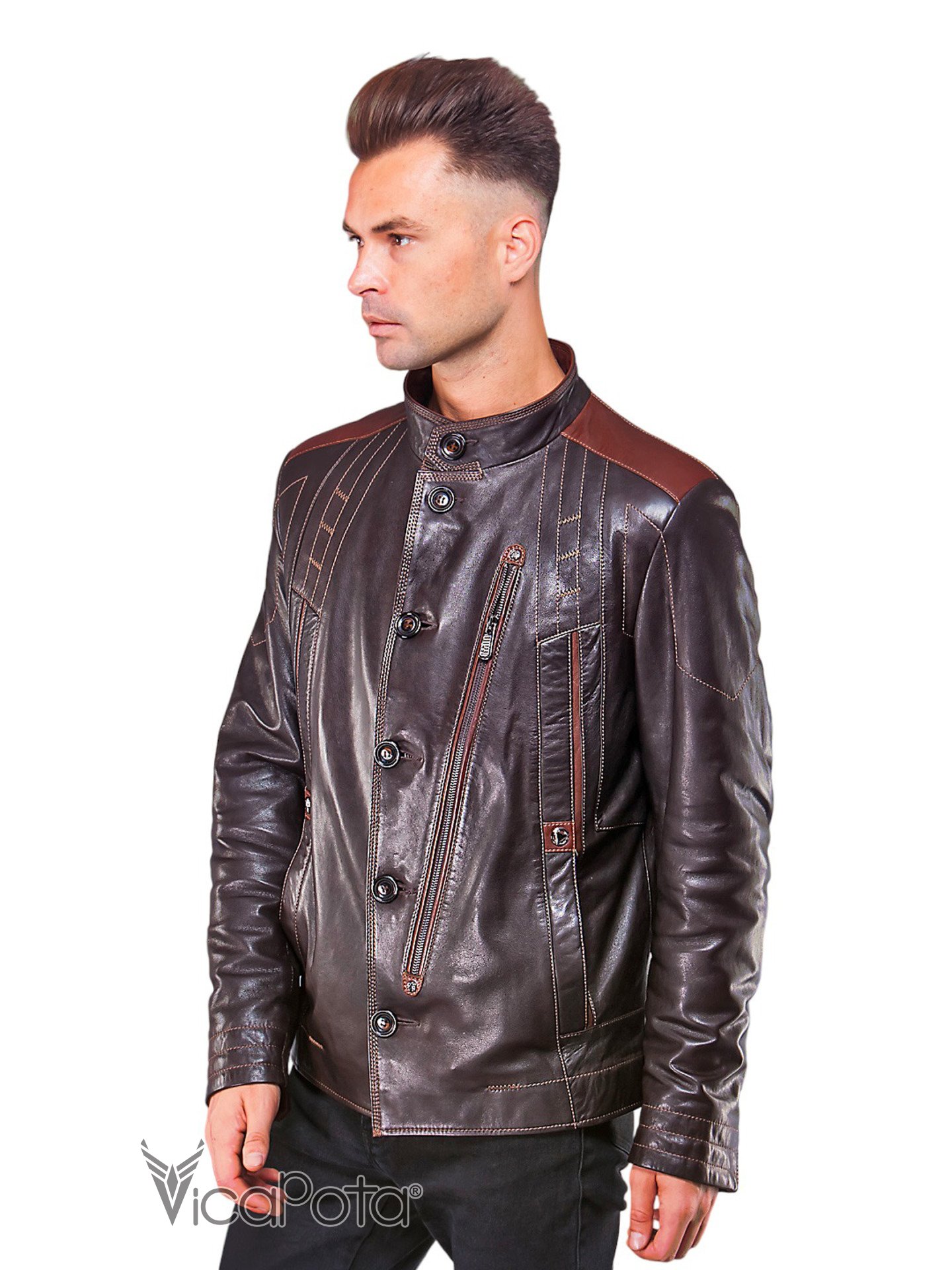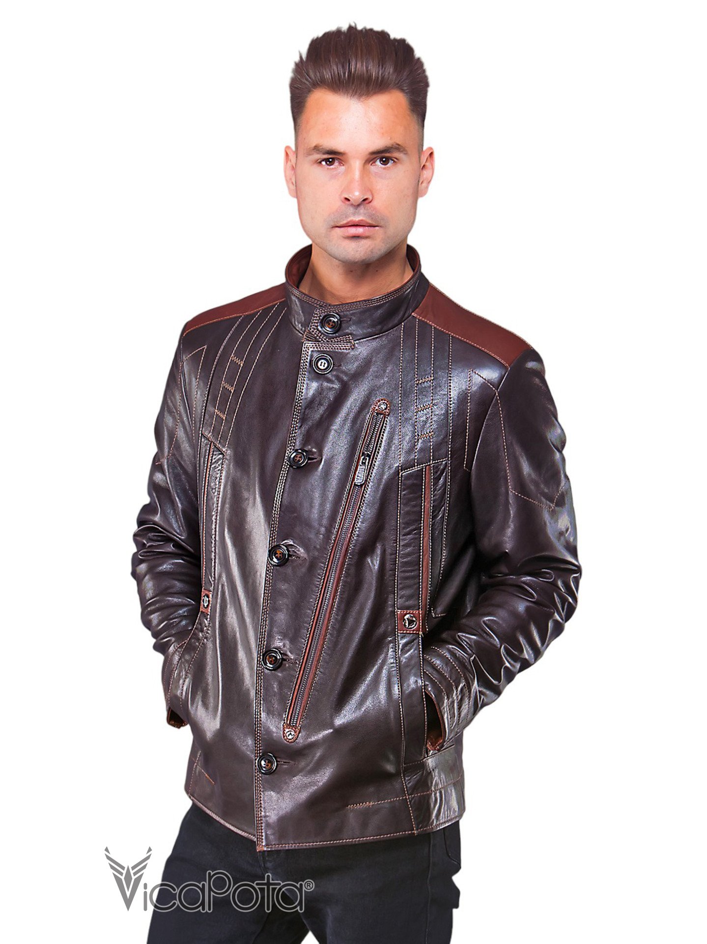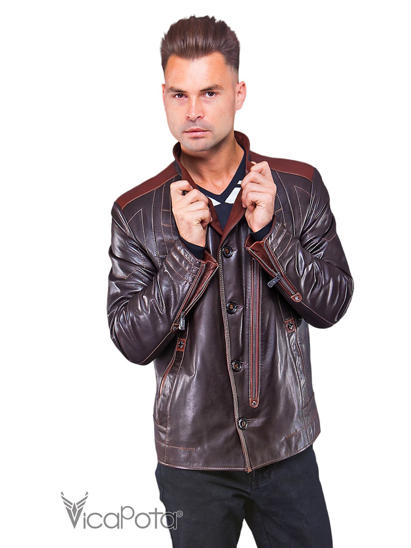 Чоловіча куртка із гладкої полірованої шкіри ягняти, колір комбінований- чорний з темно-коричневим. Має дві функціональні бічні кишені на магнітах. Застібка на ґудзиках сполучена з елементами змійки. Комір можна носити у двох варіантах стійка й англійський. Виміри по куртці Довжина виробу 64 см. Груди 55 см, Талія 52 см, Плечі 46 см, Рукав 66 см, По низу 52 см.