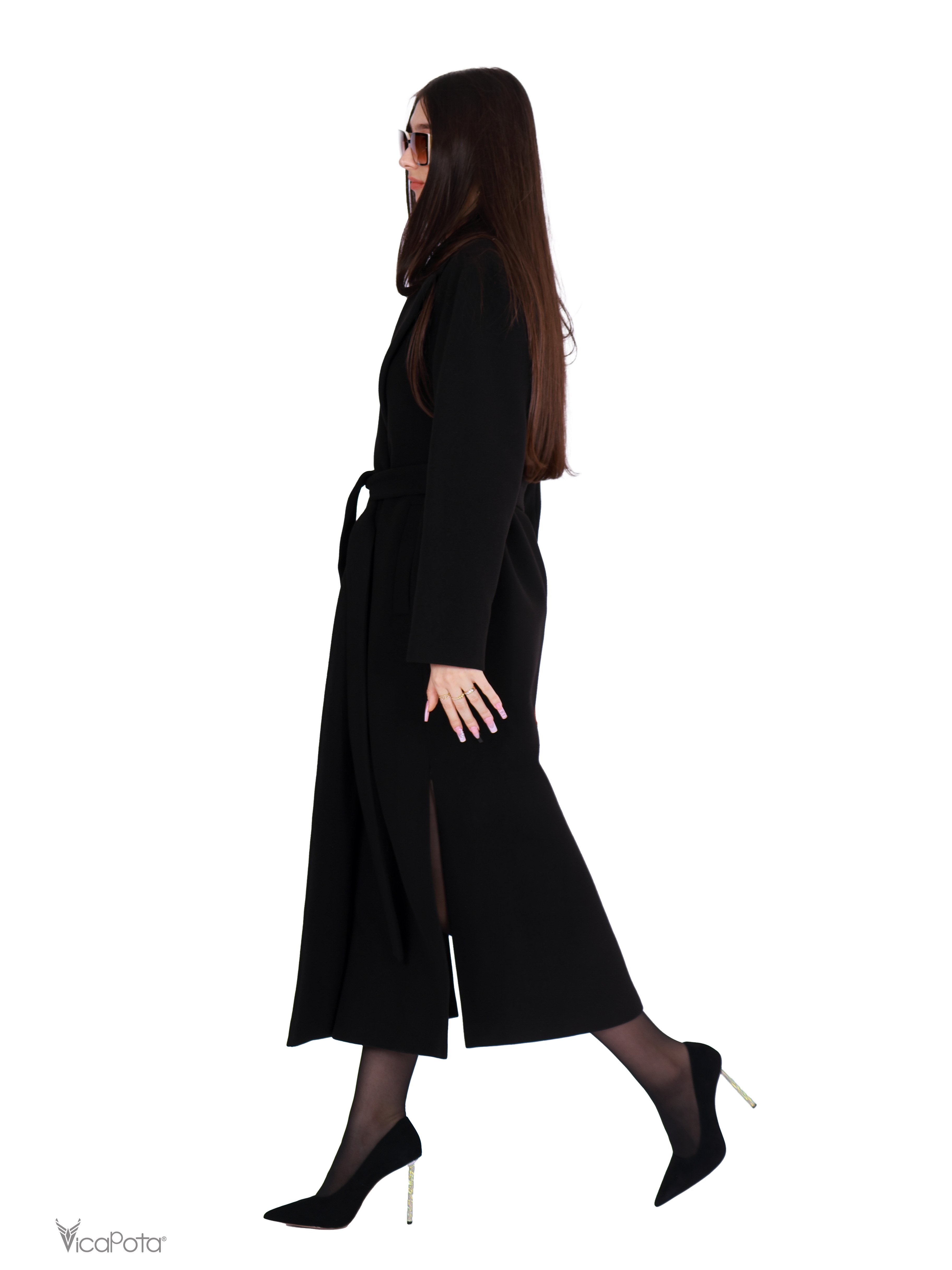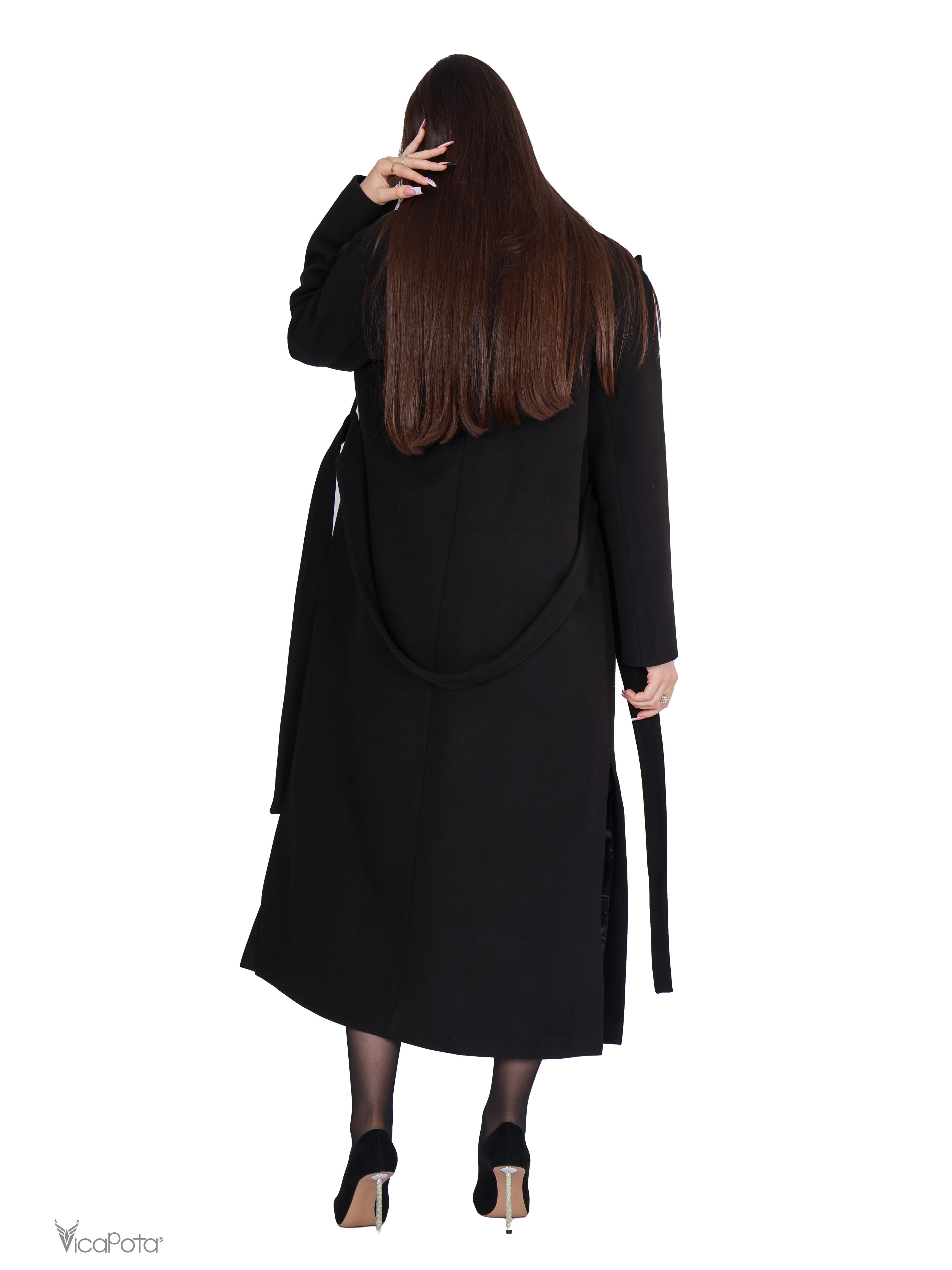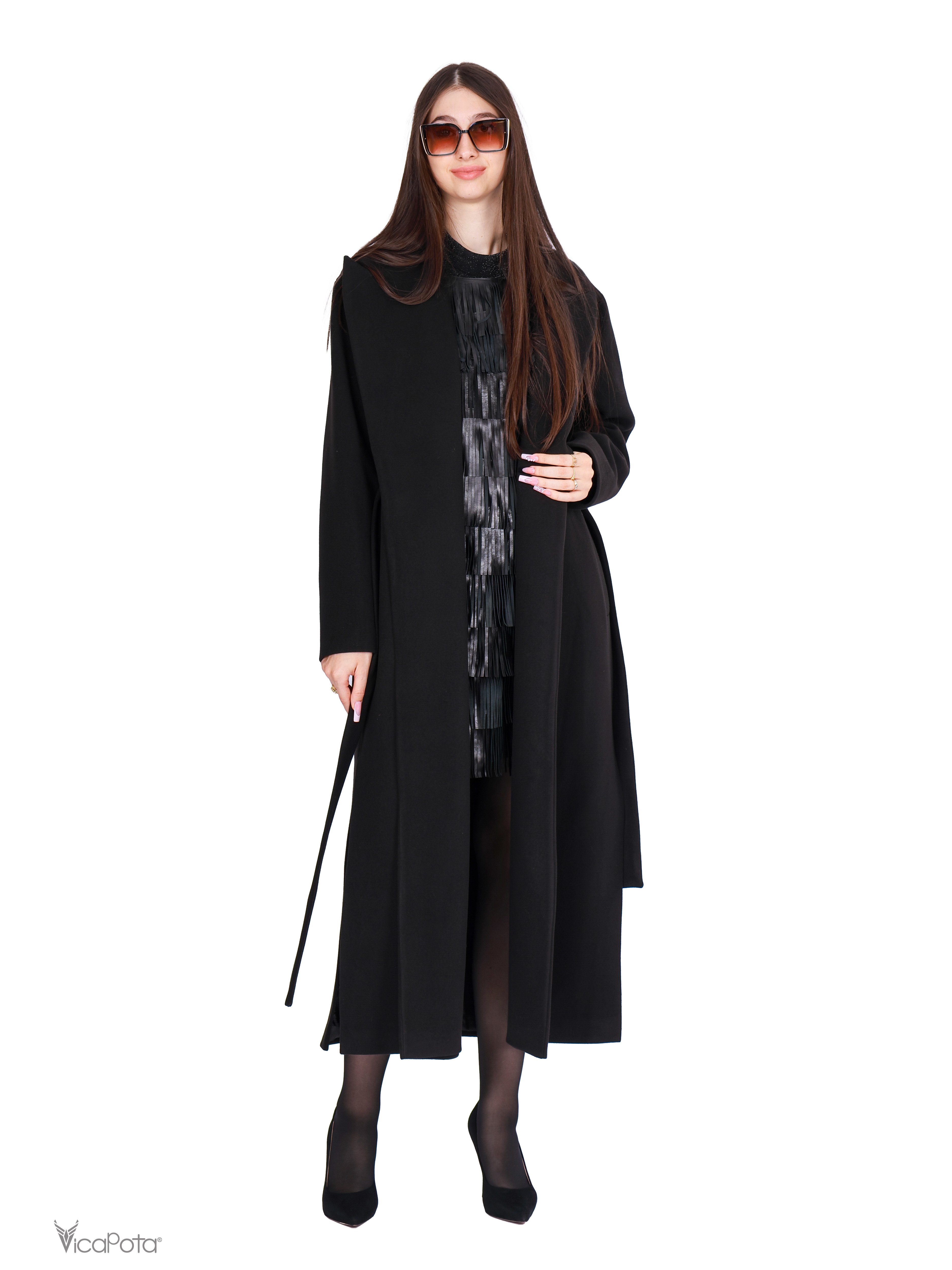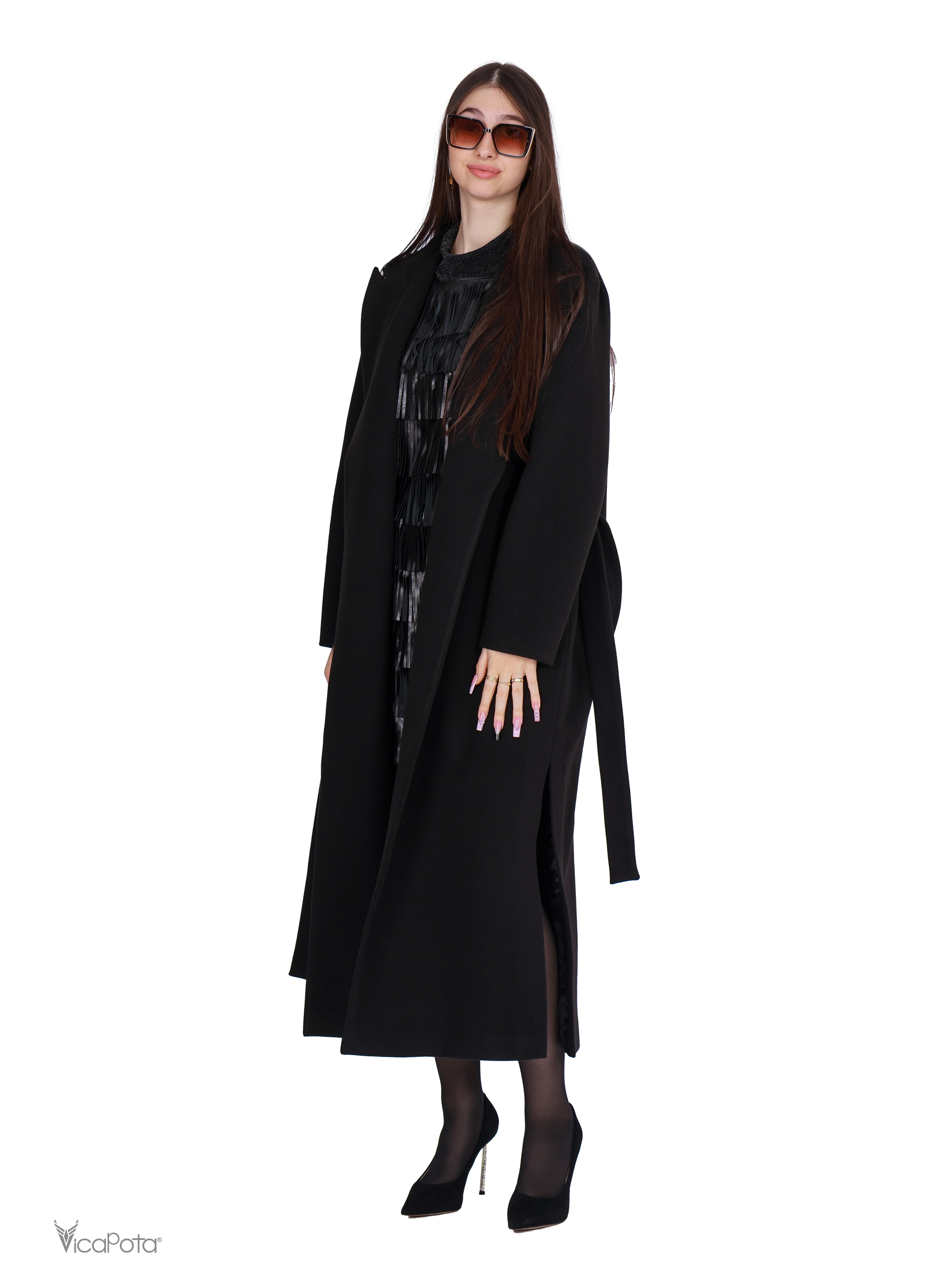 Елегантне кашемірове пальто на запах із поясом, виконане в класичному чорному кольорі, — ідеальний вибір для холодного сезону. Модель виготовлена з якісної тканини з вмістом 70% вовни, акрилу та віскози, що забезпечує м’якість і міцність. Довжина 130 см робить пальто універсальним рішенням, а бокові розрізи додають свободи рухів та елегантності образу. Це пальто підкреслить вашу індивідуальність, ставши стильним і універсальним доповненням зимового гардероба.