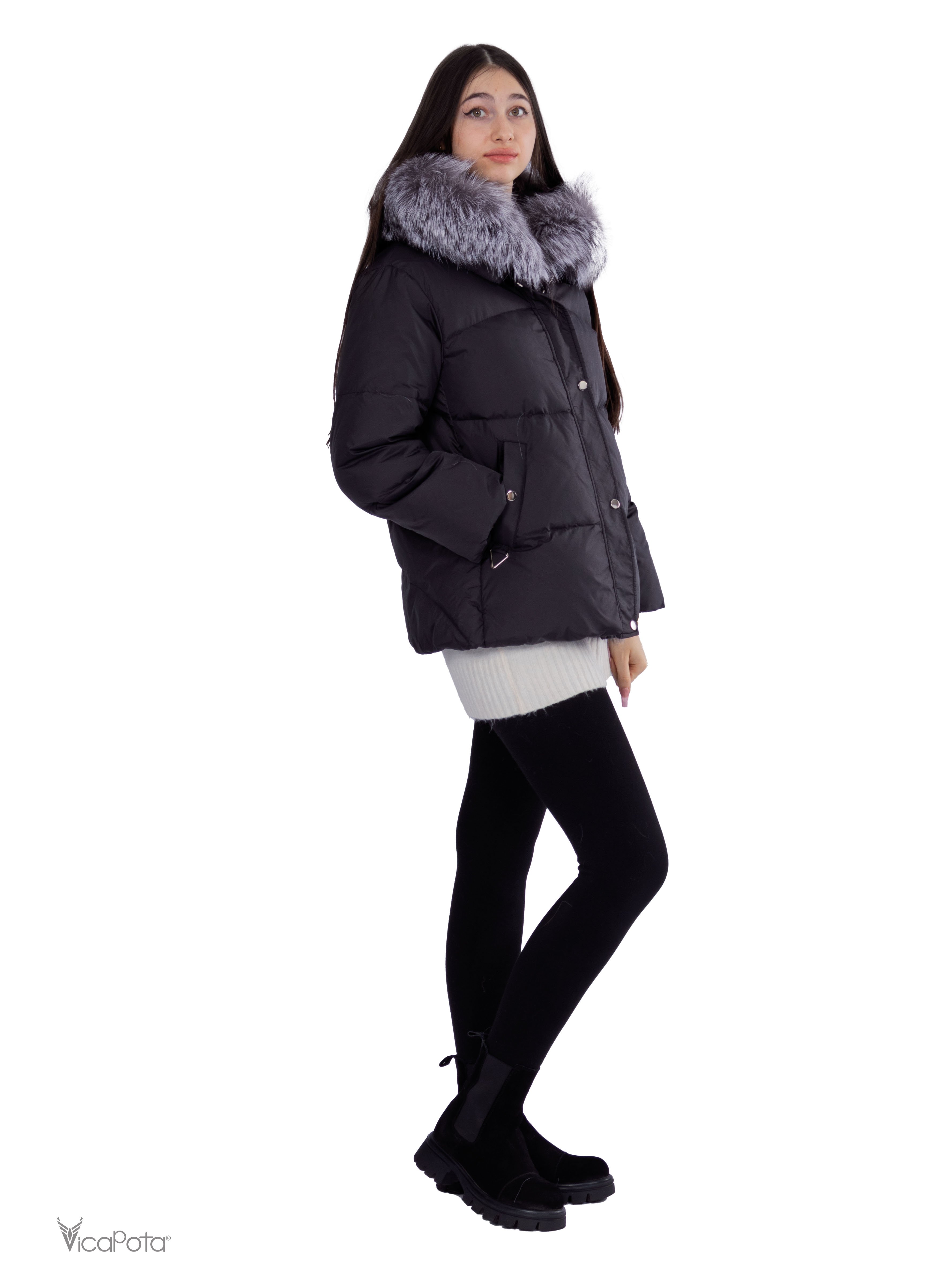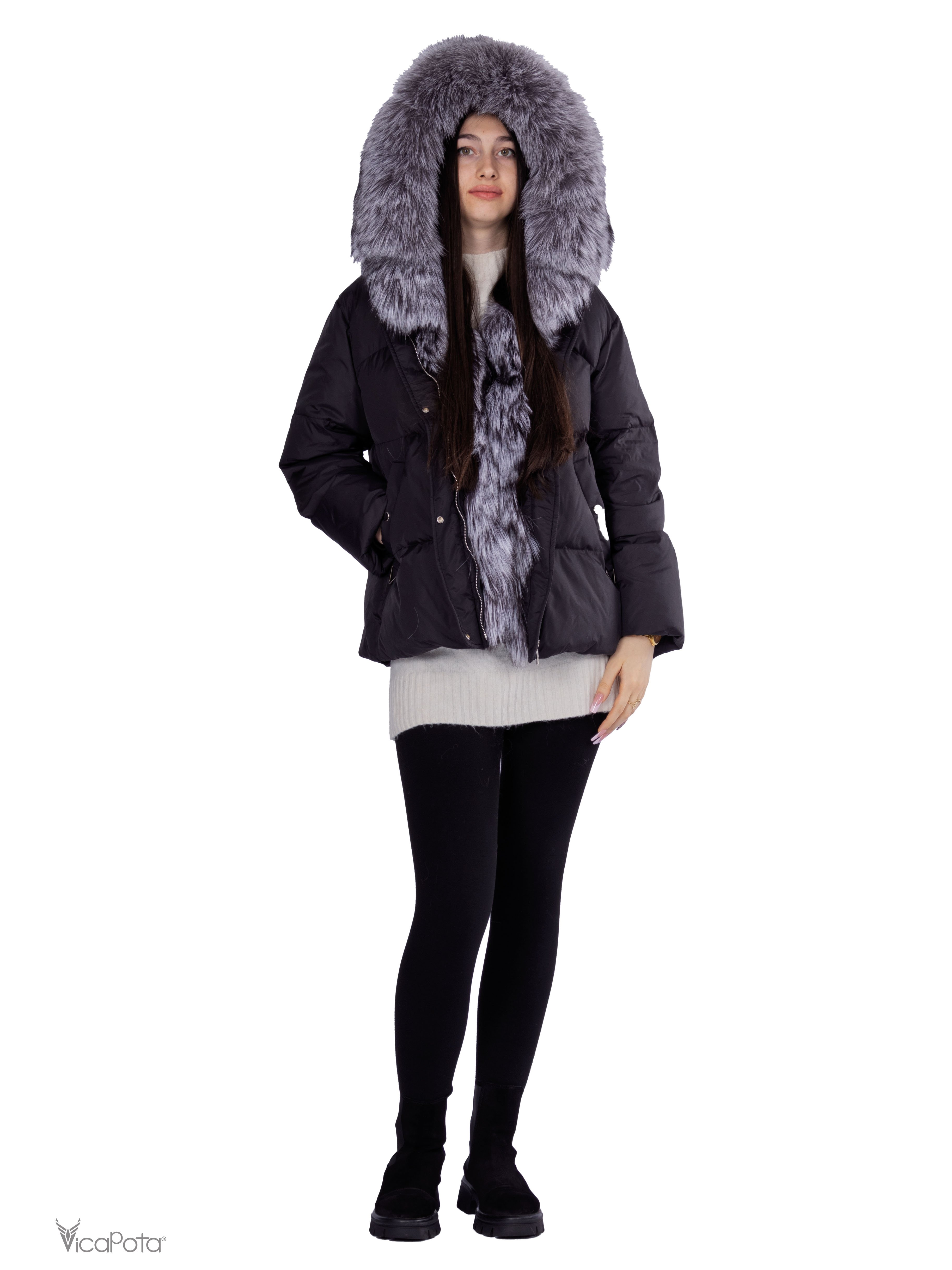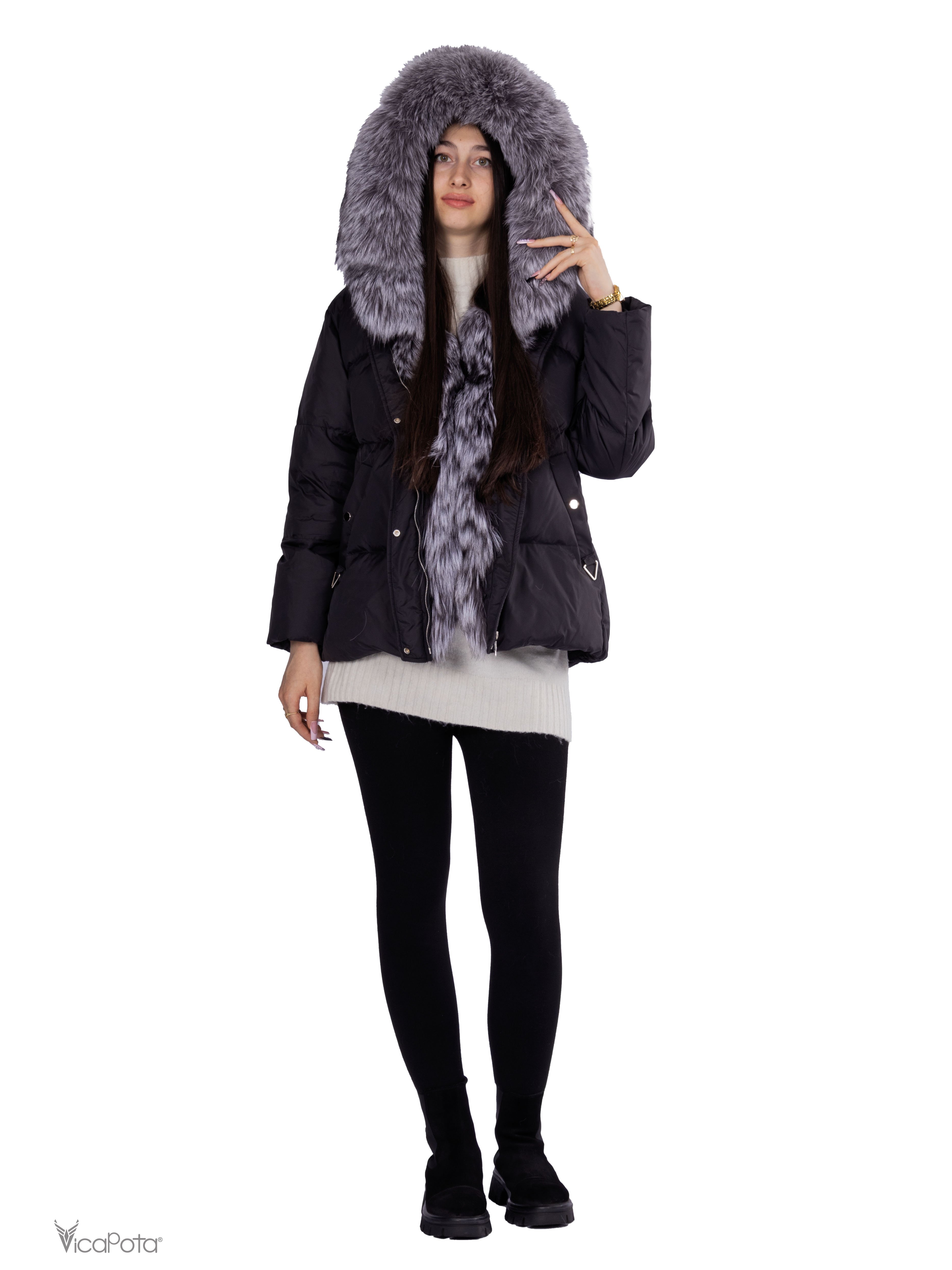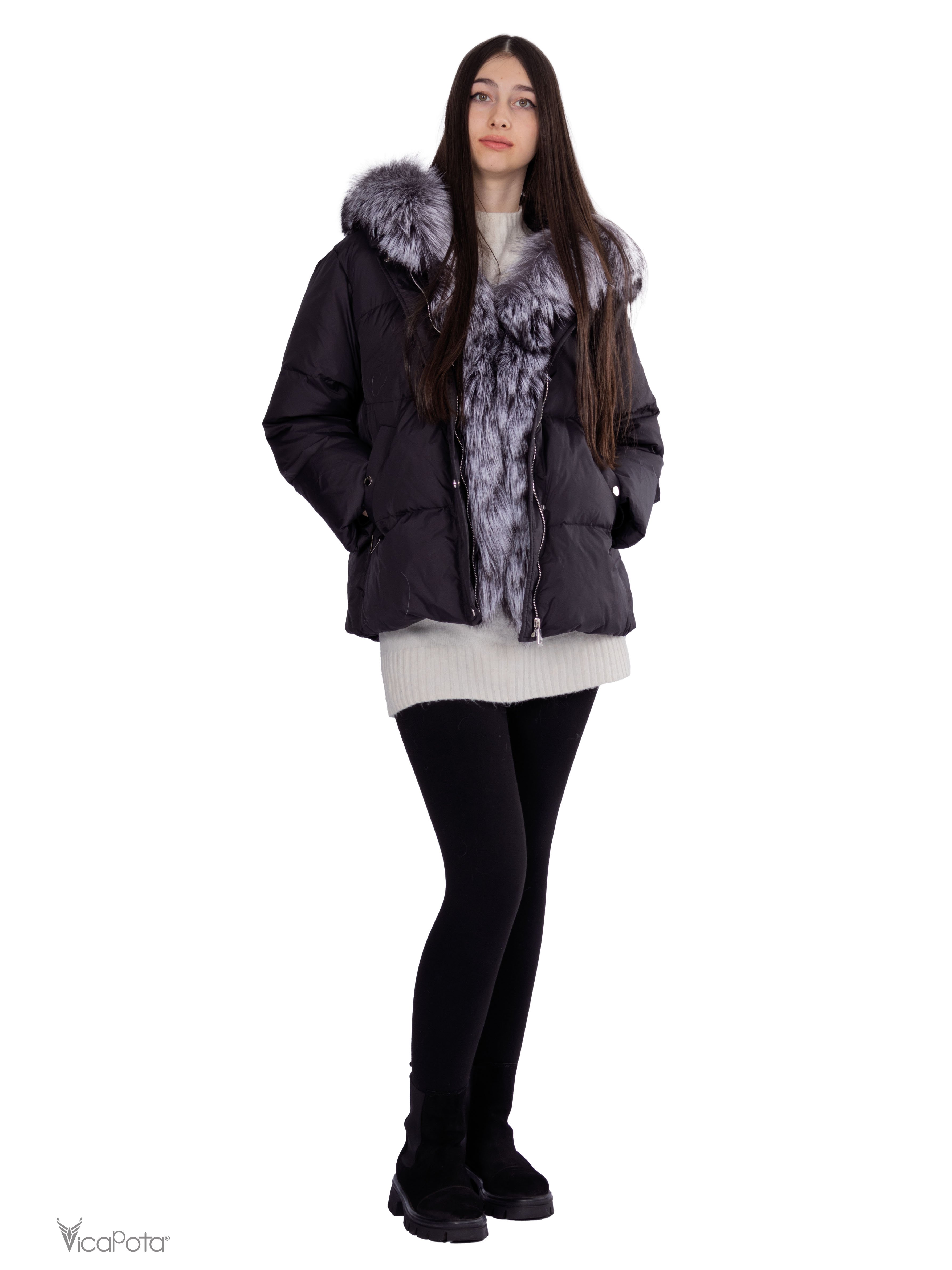 - **Отделка:** натуральный мех песца цвета соболя добавляет пуховику элегантности.