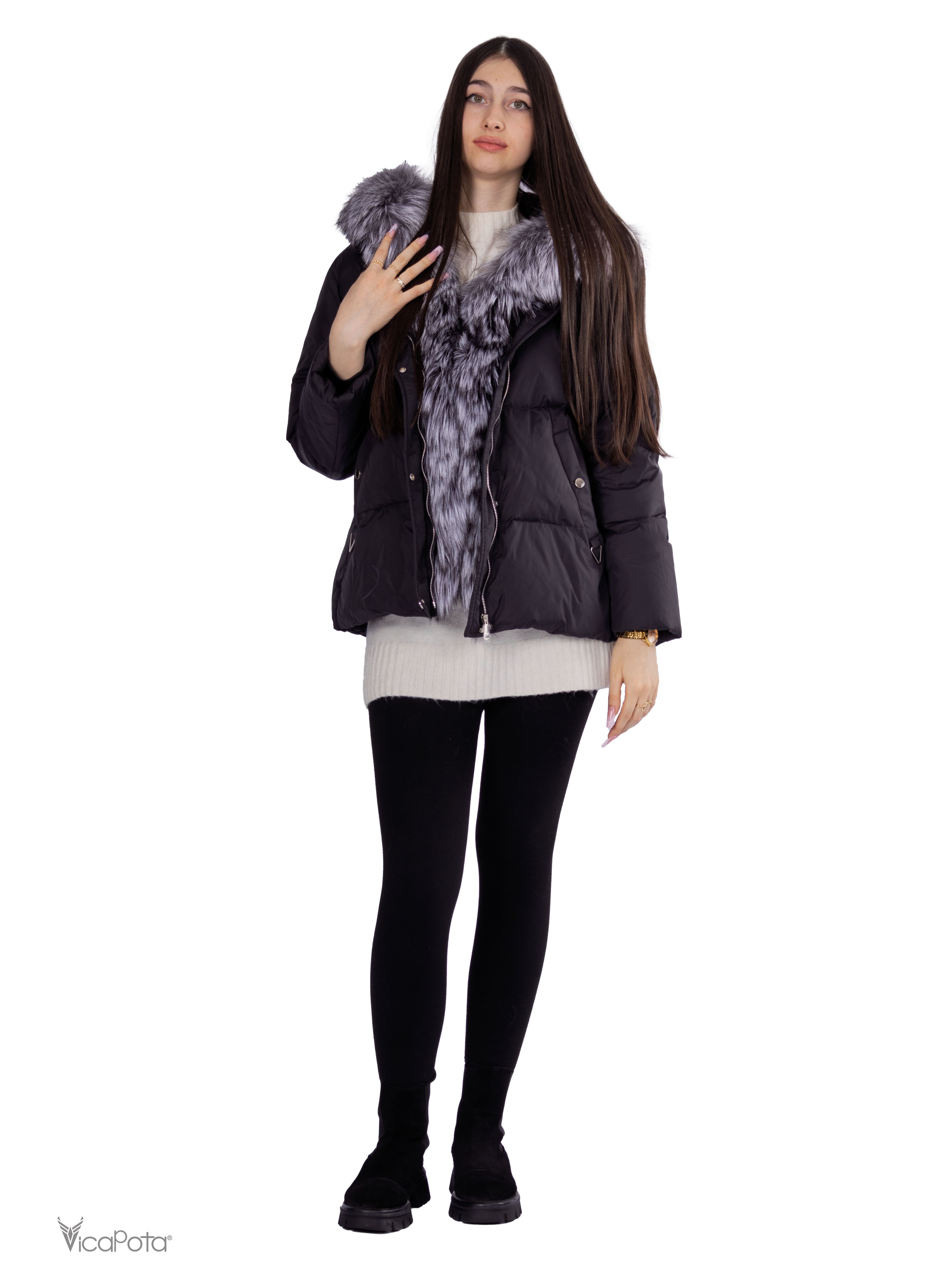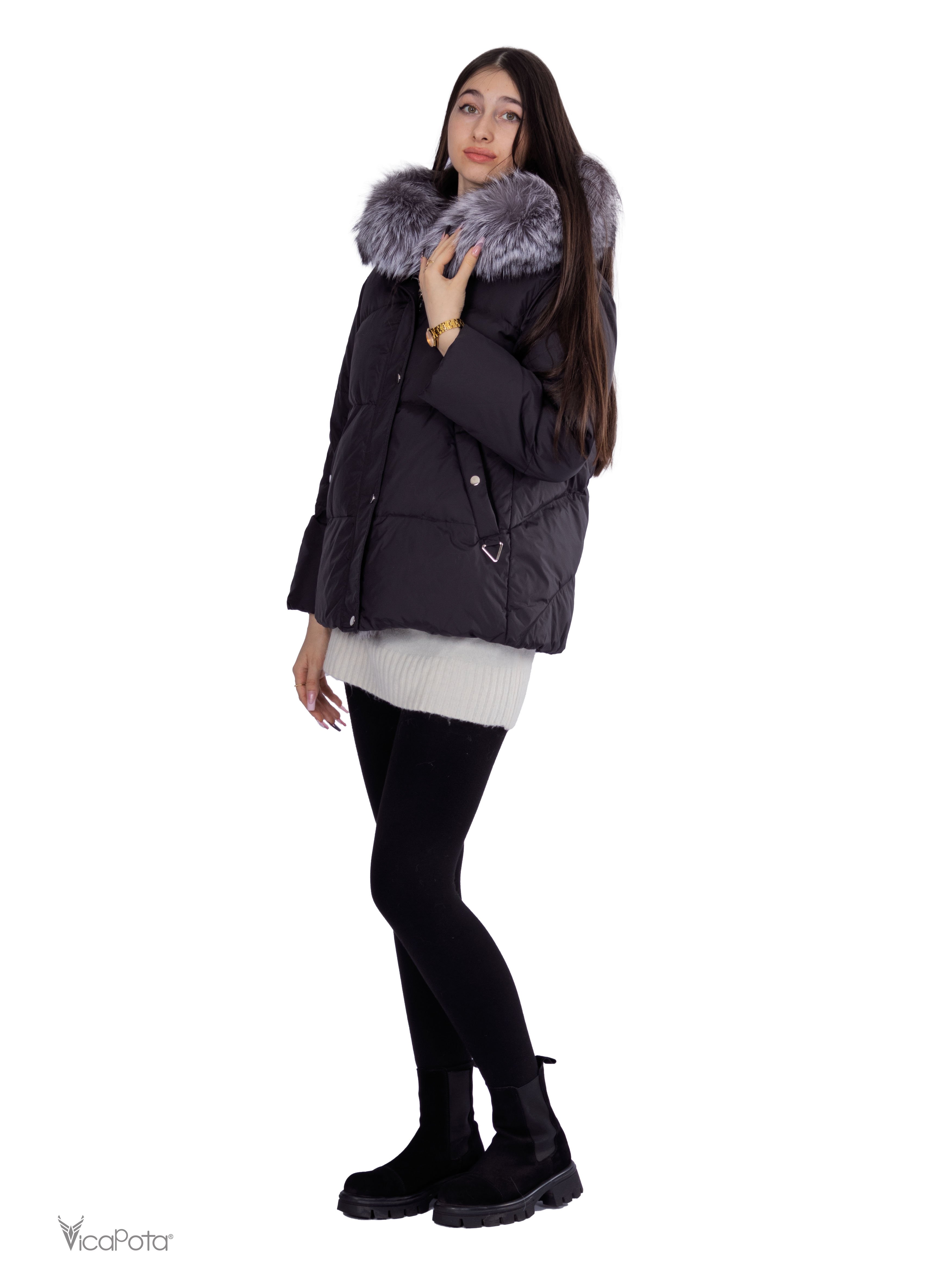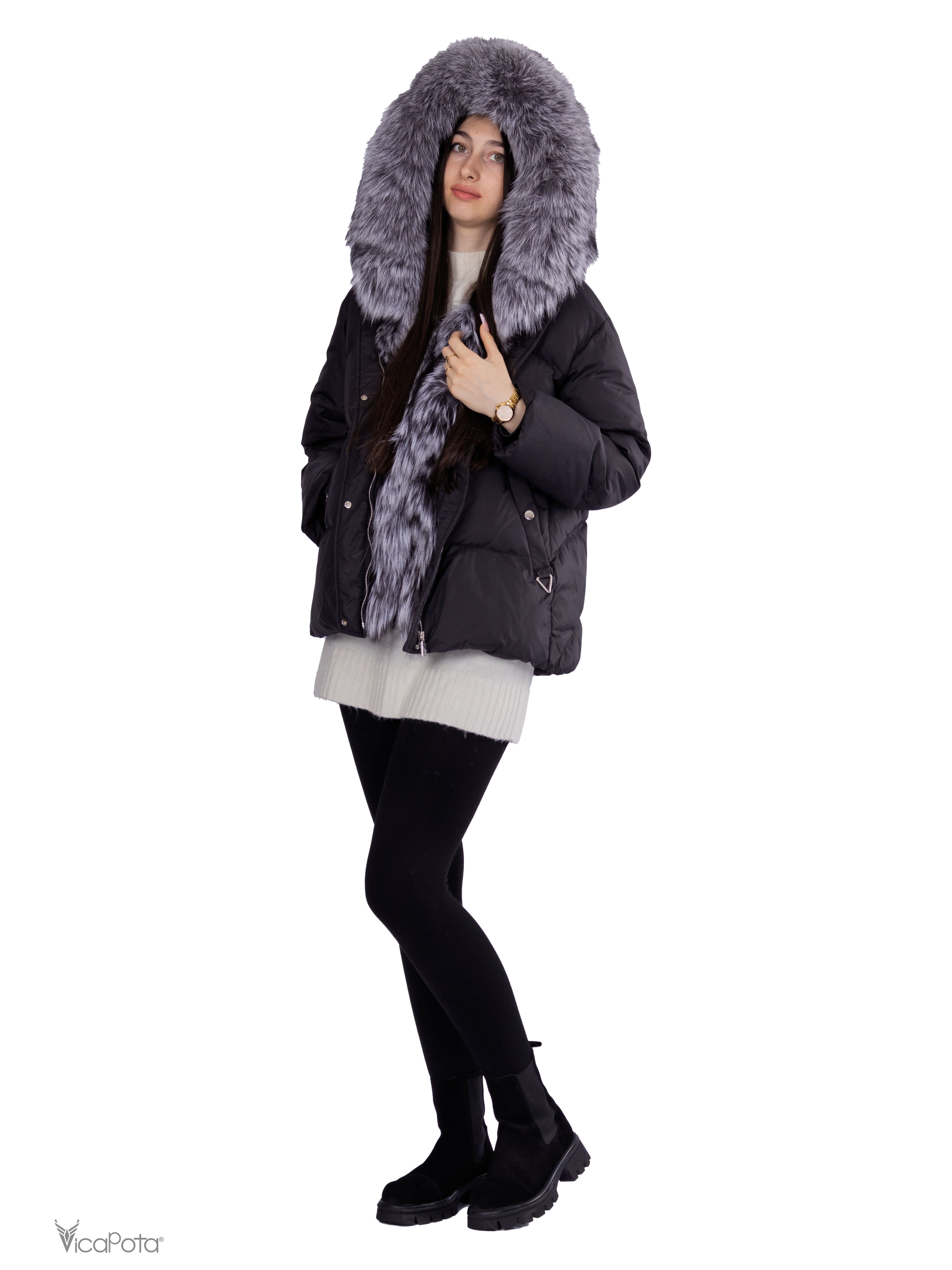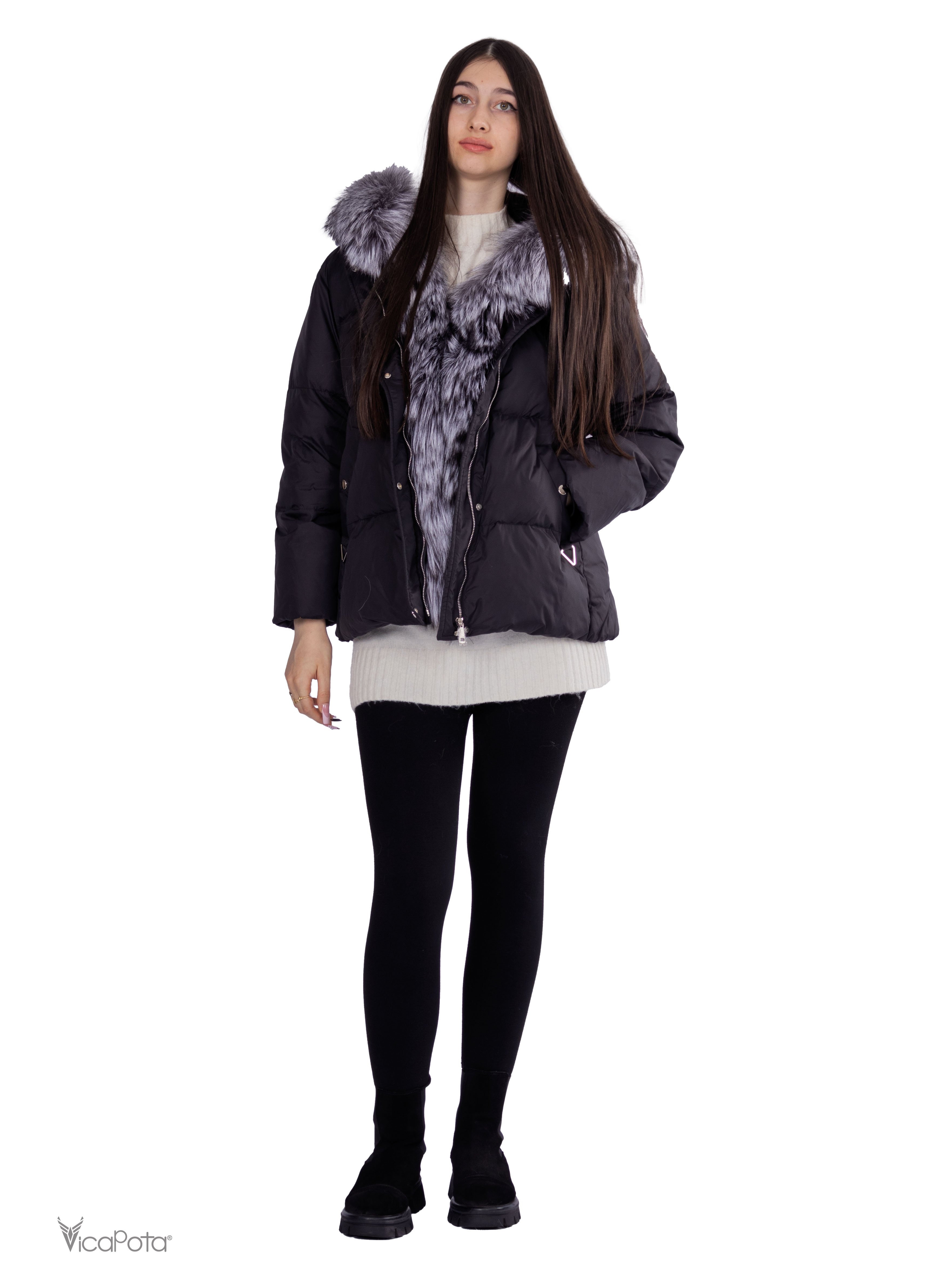 - **Отделка:** натуральный мех песца цвета соболя добавляет пуховику элегантности.