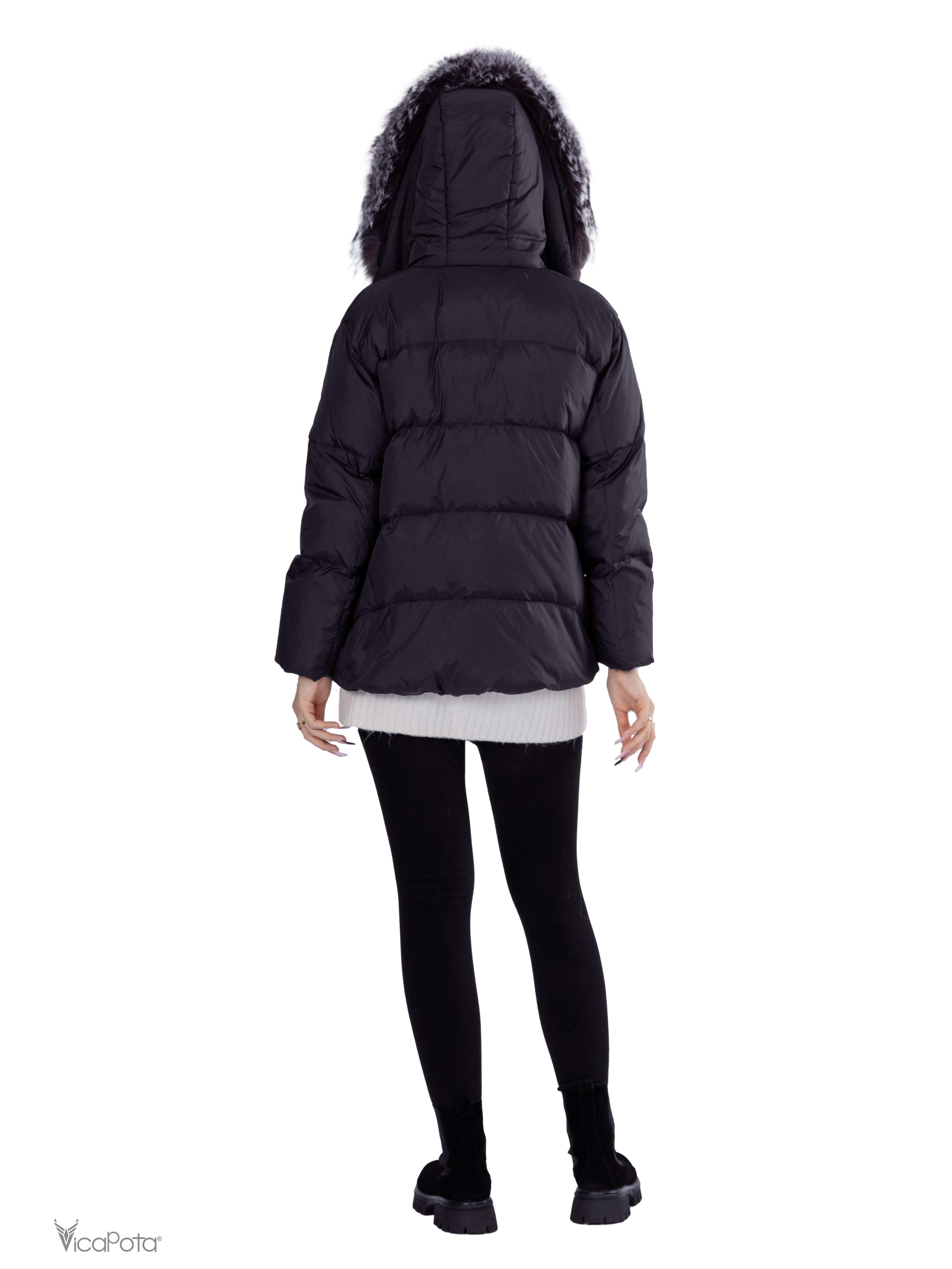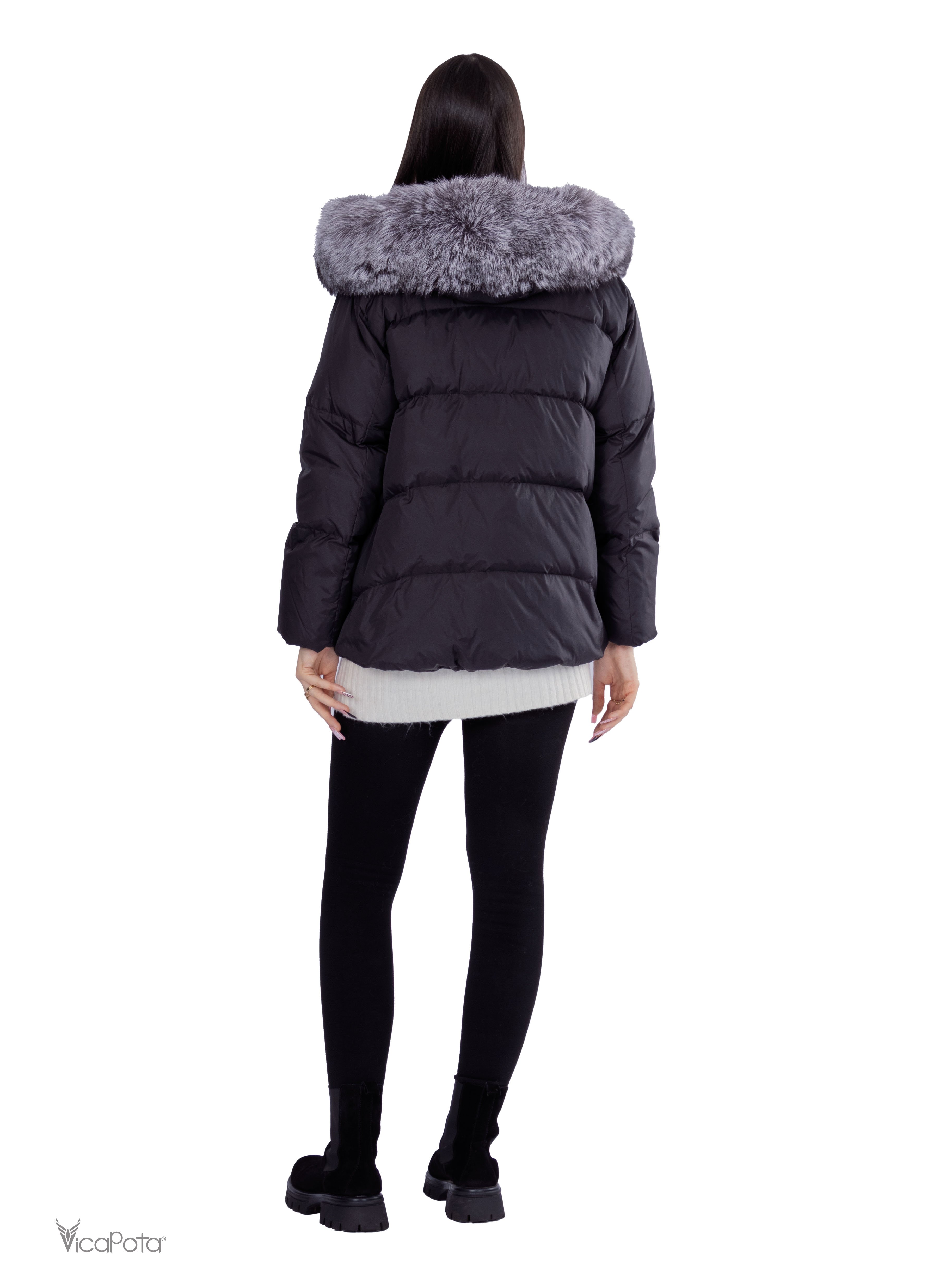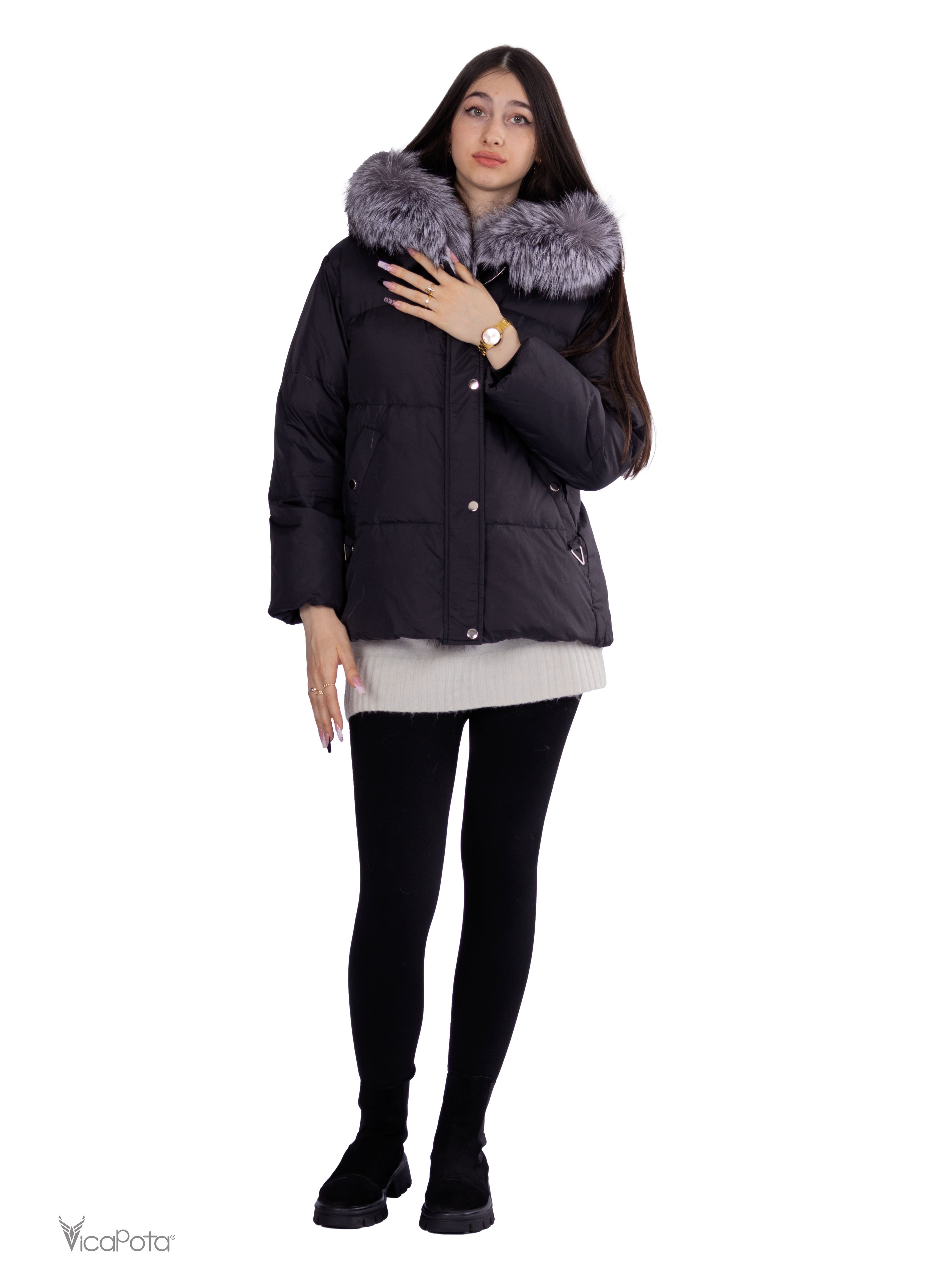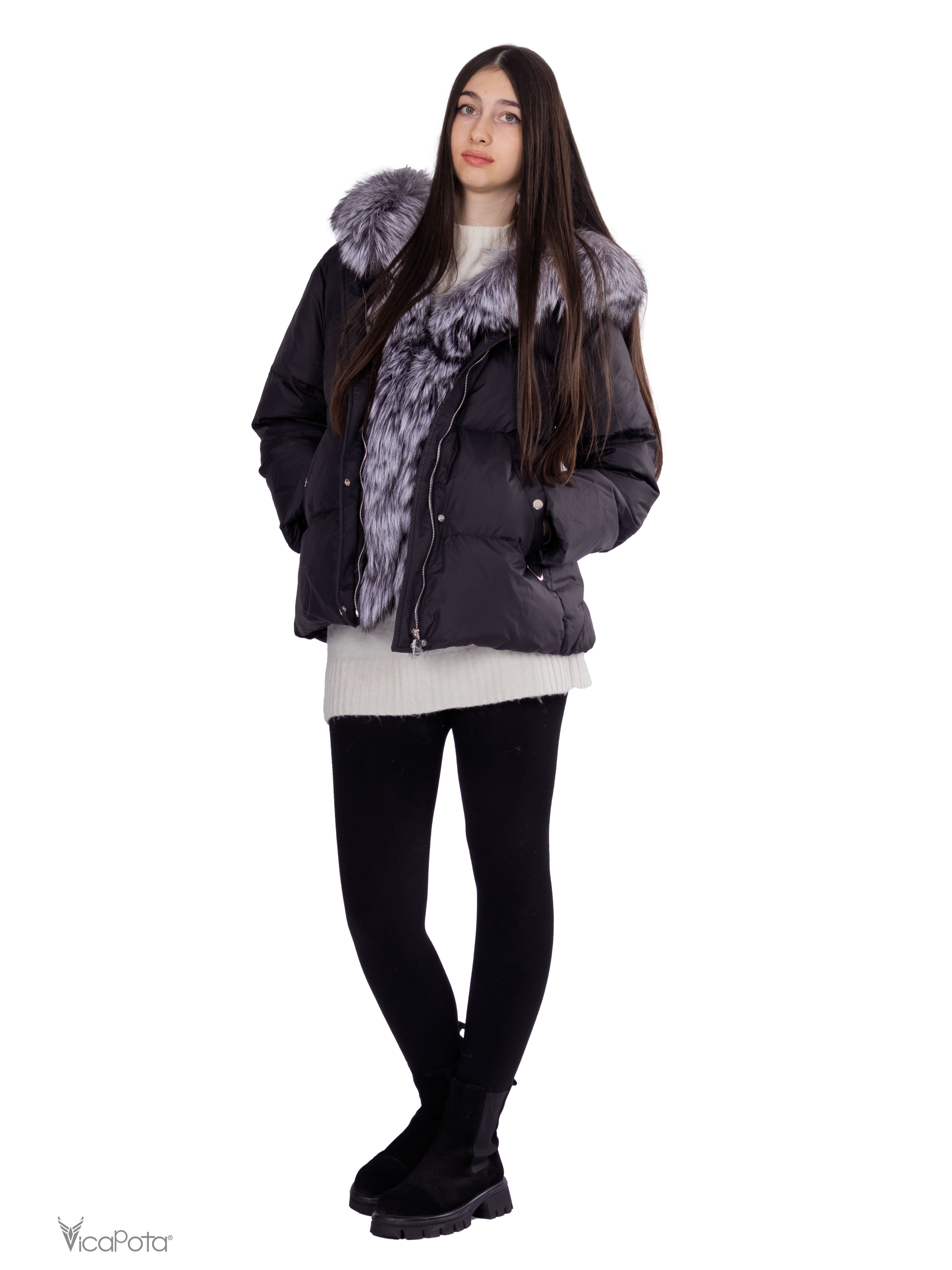 - **Отделка:** натуральный мех песца цвета соболя добавляет пуховику элегантности.