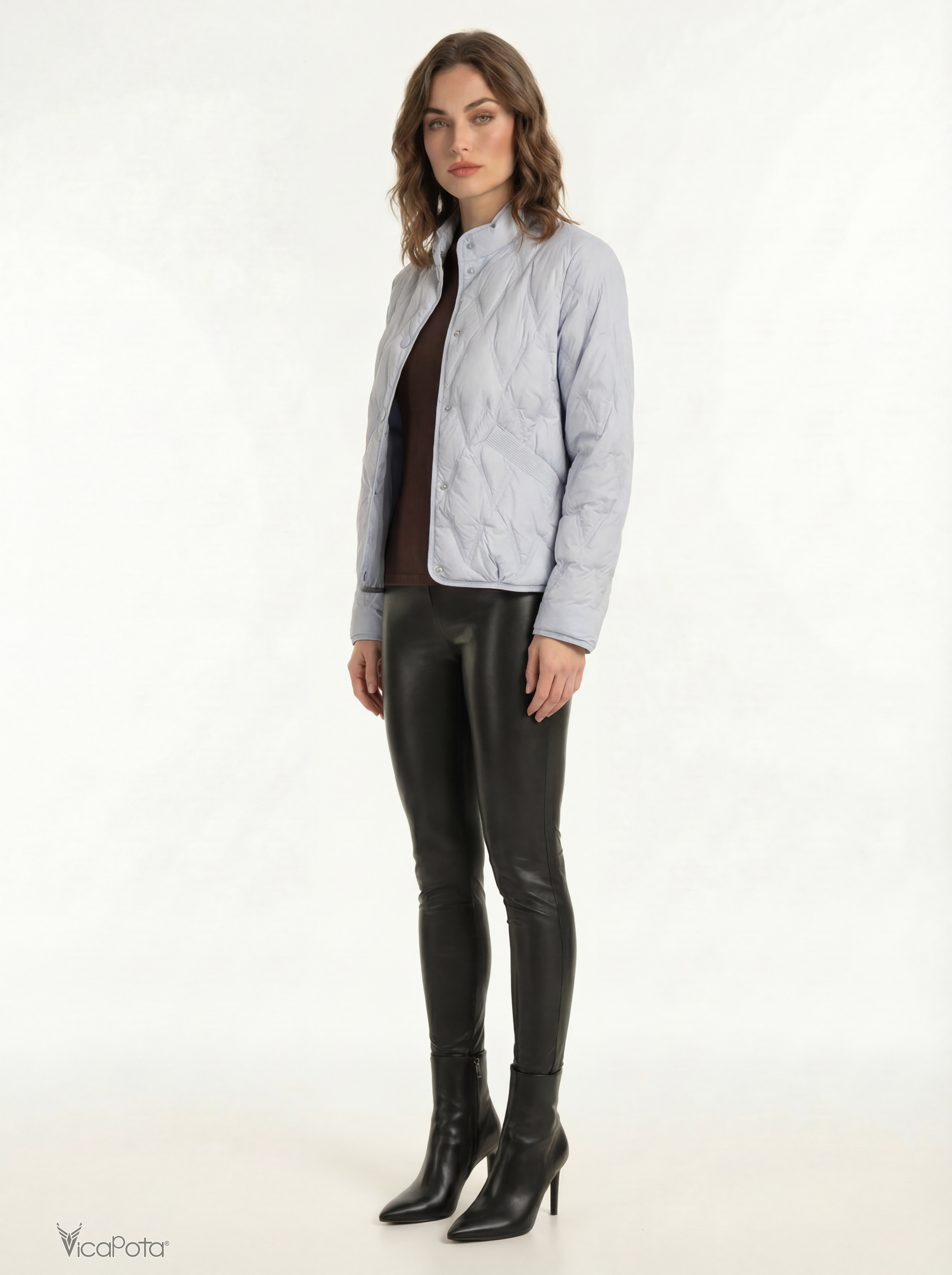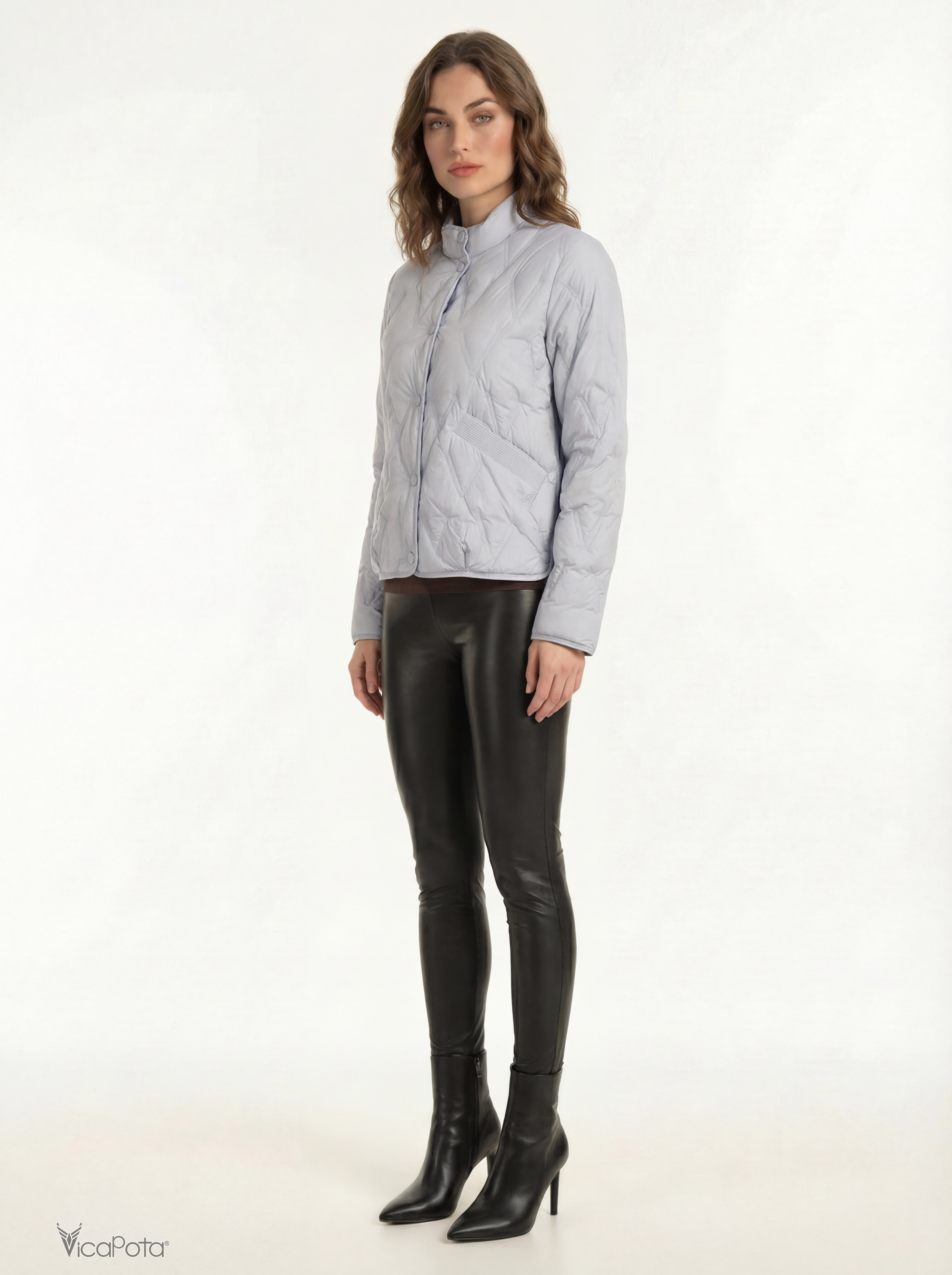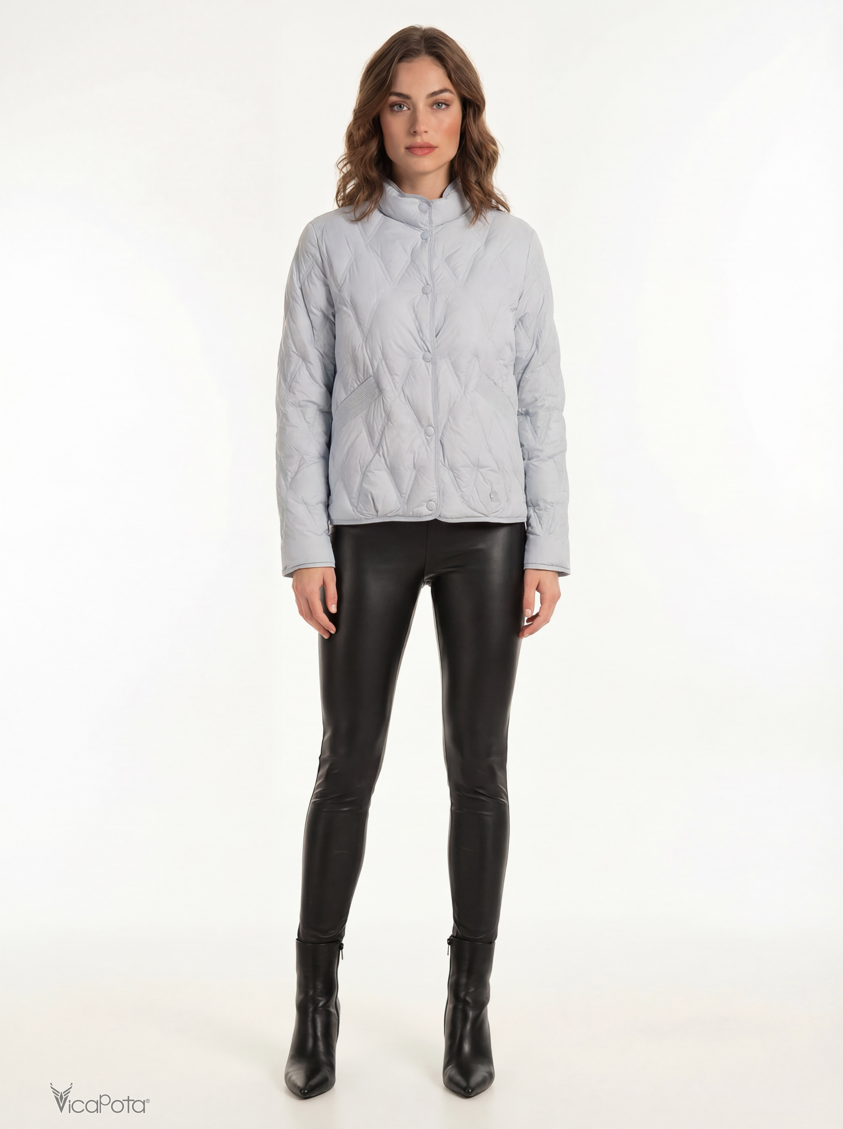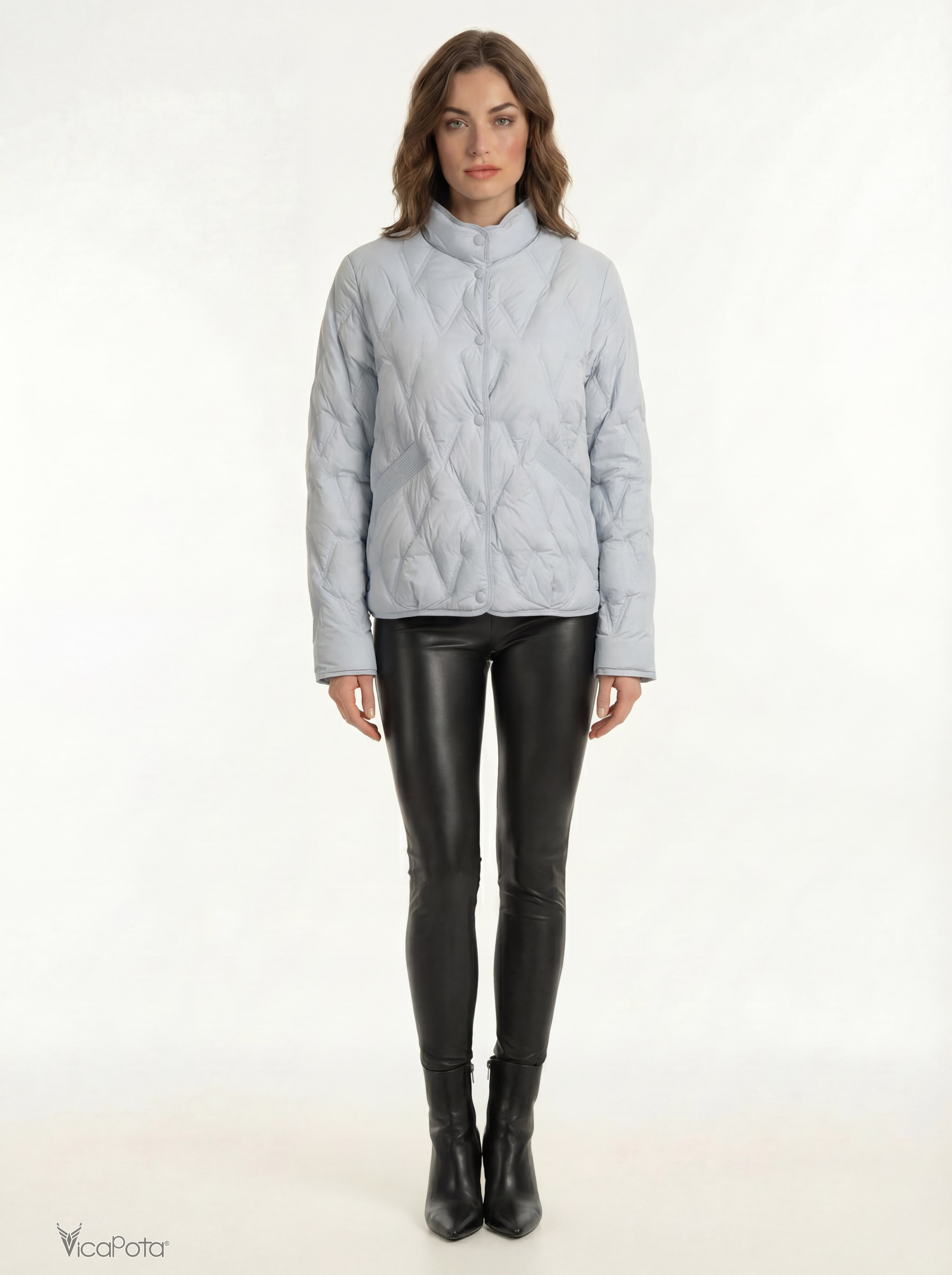 Светлый голубой оттенок освежает образ и легко комбинируется с базовыми цветами гардероба — чёрным, молочным, серым и денимом. Аккуратная ромбовидная стёжка придаёт структуру и визуально стройнит силуэт. Длина 65 см делает модель универсальной для города и поездок.
