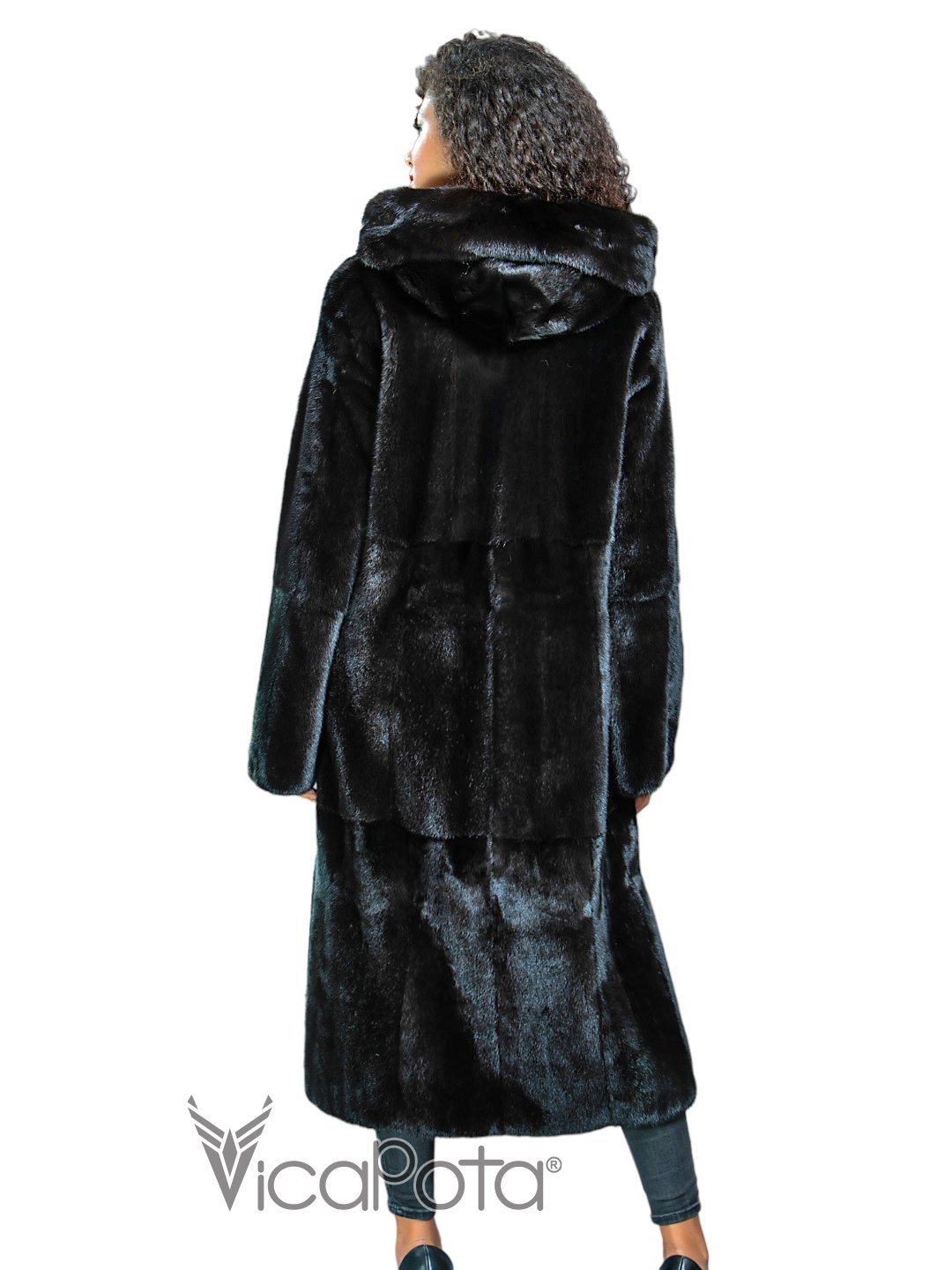 Норковая шуба из высококачественного аукционного меха, цвета Black. Длина 117 см. Размер 46-48. Модель шубы выкроена из цельных шкурок норки в роспуск и выполнена в форме трапеции. Фурнитура шубные крючки темного цвета. Изделие имеет капюшон и два боковых кармана и один внутренний. Длинная шуба прекрасное дополнение к вечернему наряду, подарит тепло и чувство комфорта прекрасной даме.