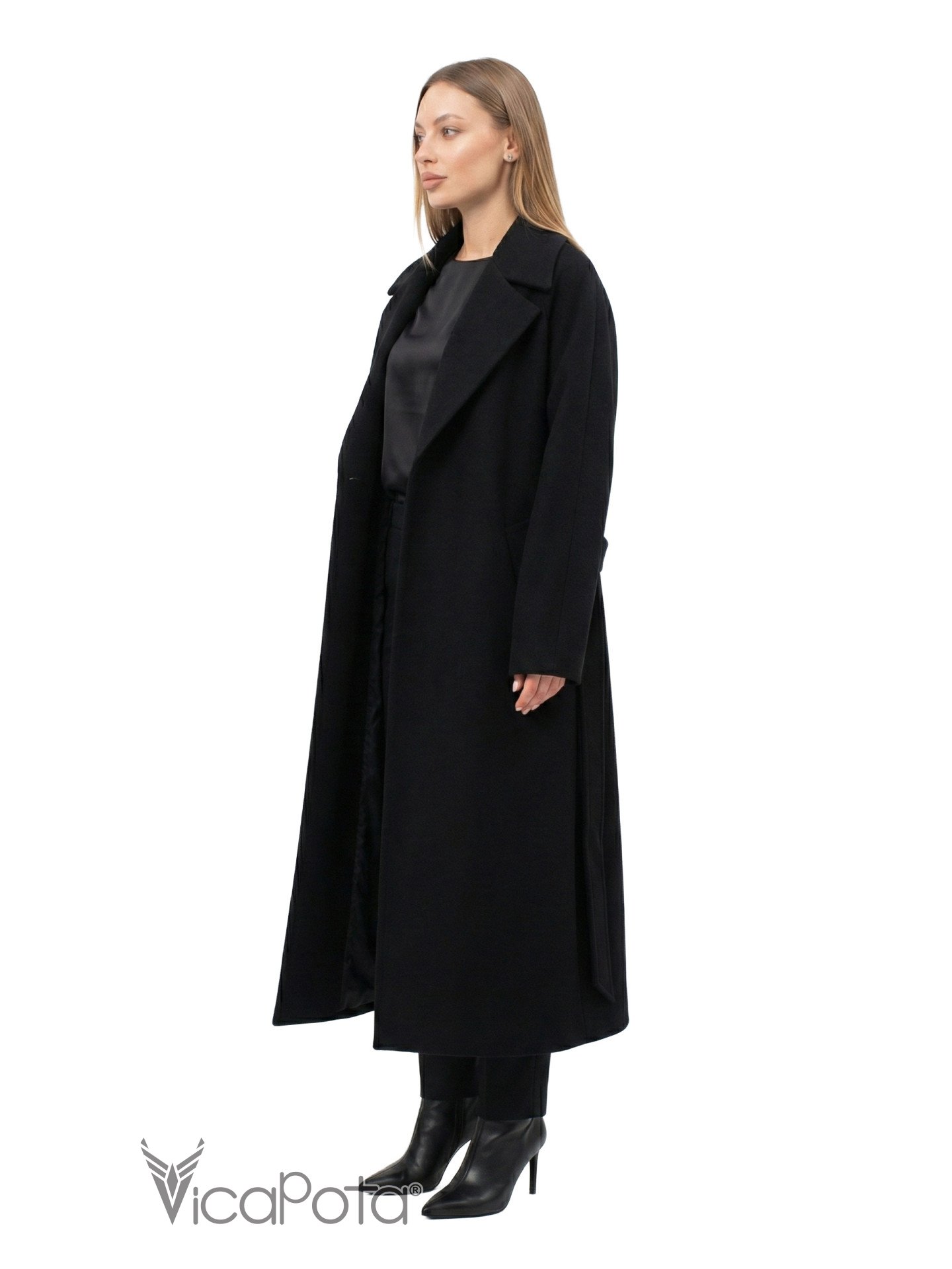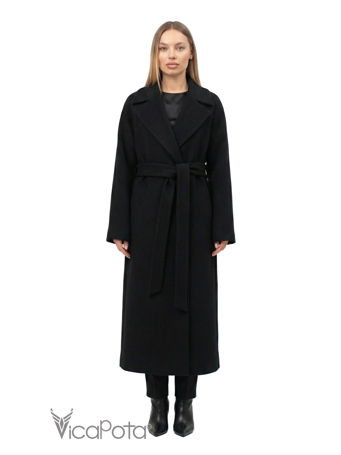 Познакомьтесь с вашей новой любимой вещью этого сезона — классическим черным пальто длины макси. Это воплощение элегантности и комфорта. Модель выполнена в фасоне «на запах», который идеально садится на любой тип фигуры, подчеркивая талию и создавая женственный, утонченный силуэт.