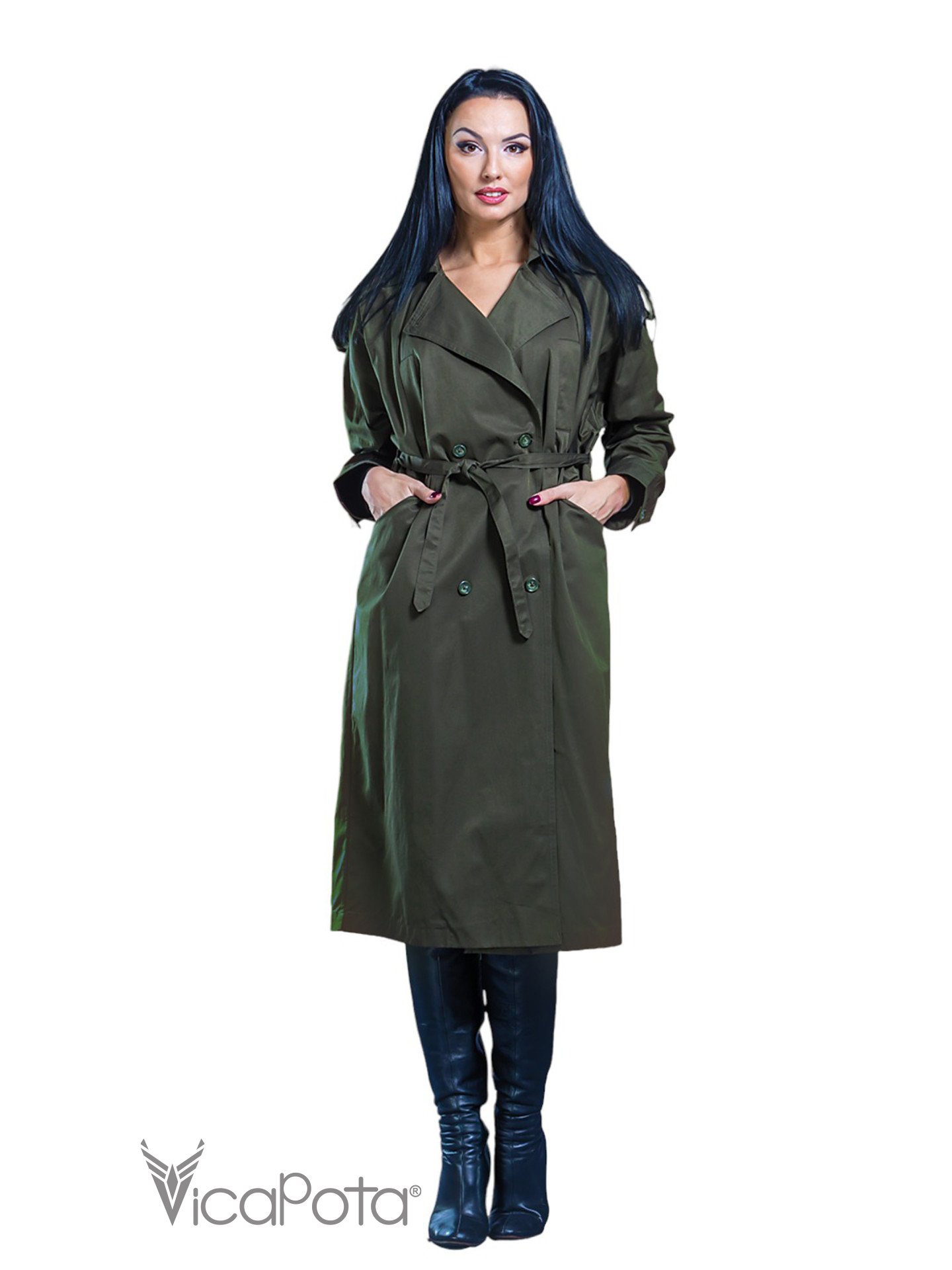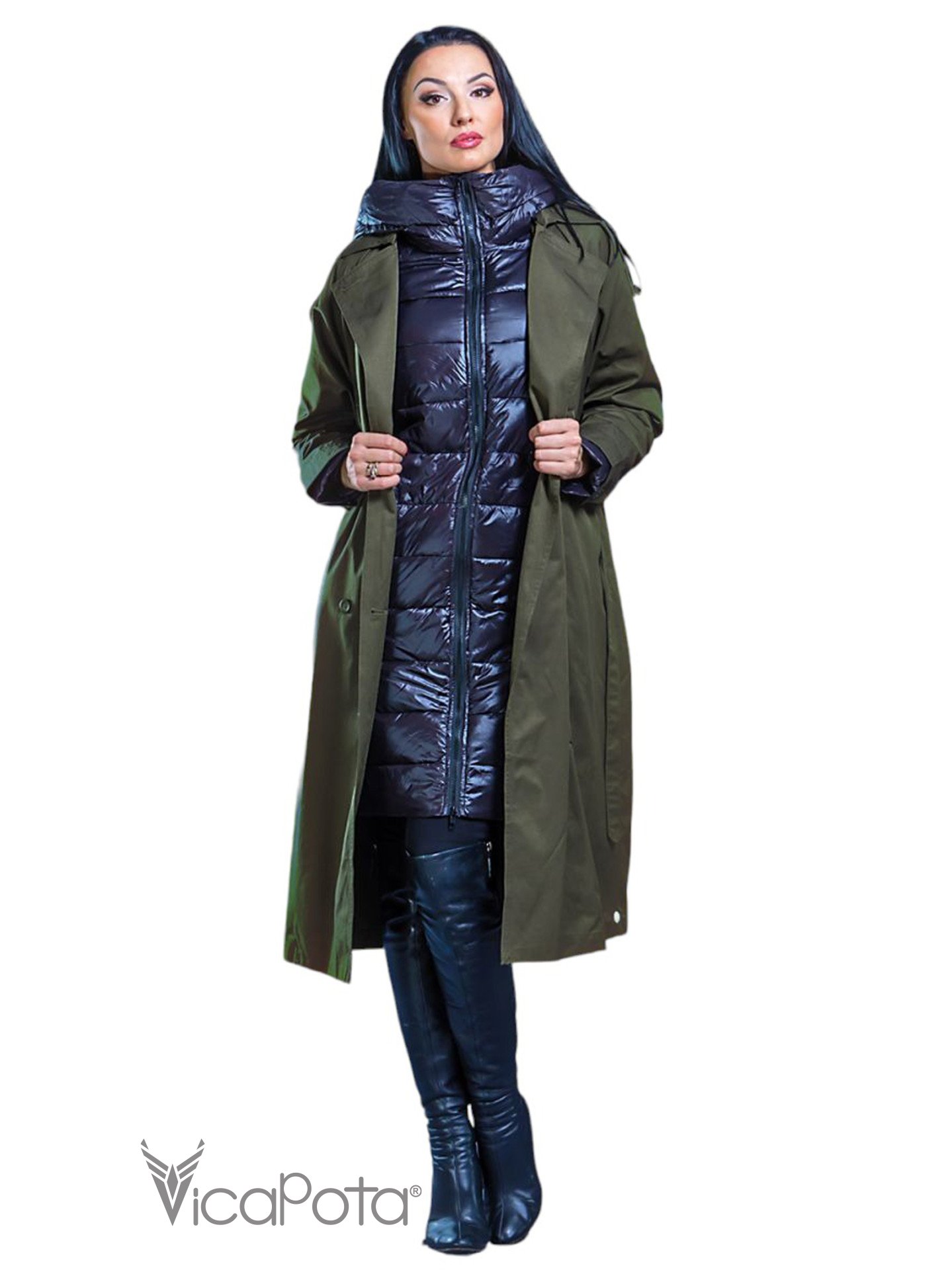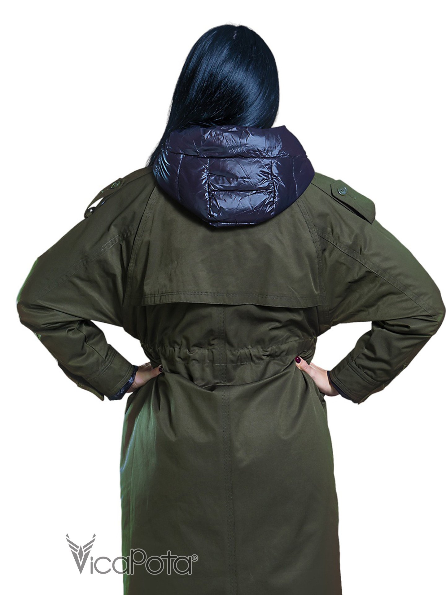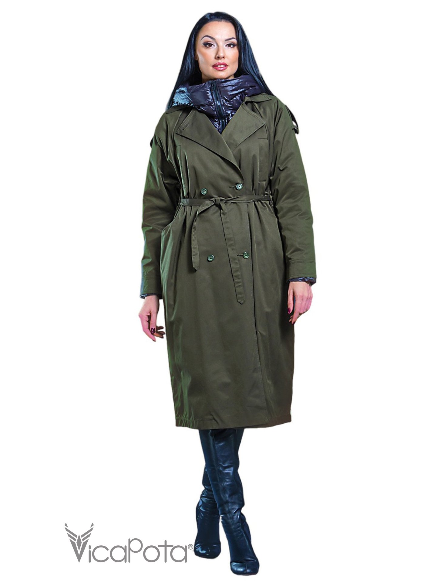 Женский стильный пуховик- плащ в цвете хаки, средней длины. Главная особенность данной модели 2 в 1. Утеплитель- биопух. Био-пух не мигрирует через ткань, сохраняет форму и объем изделия, не истончается, не пробивается сквозь отверстия швов.