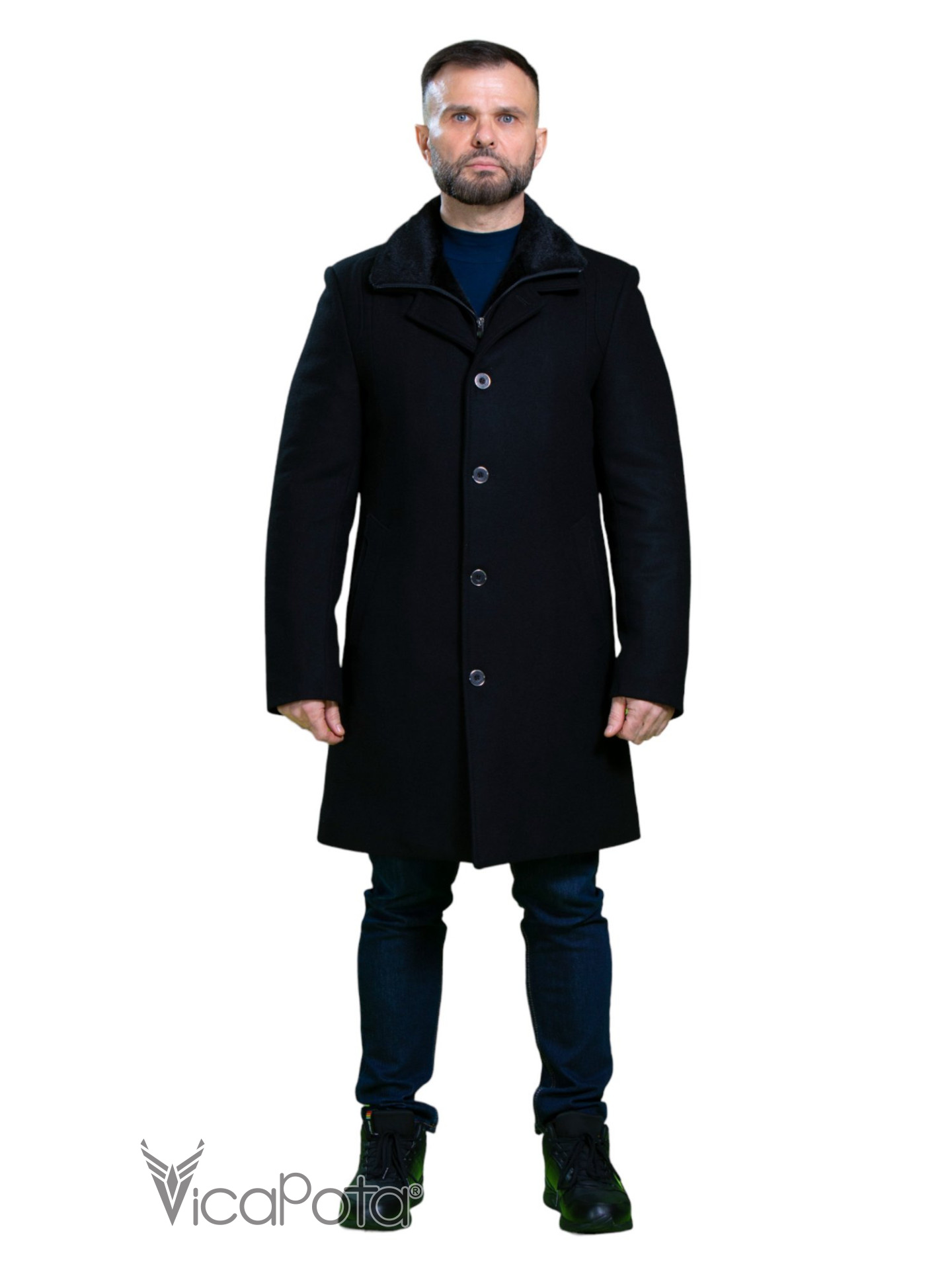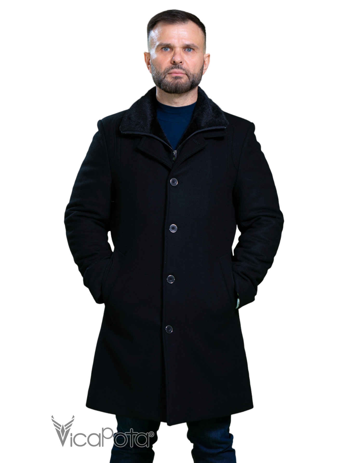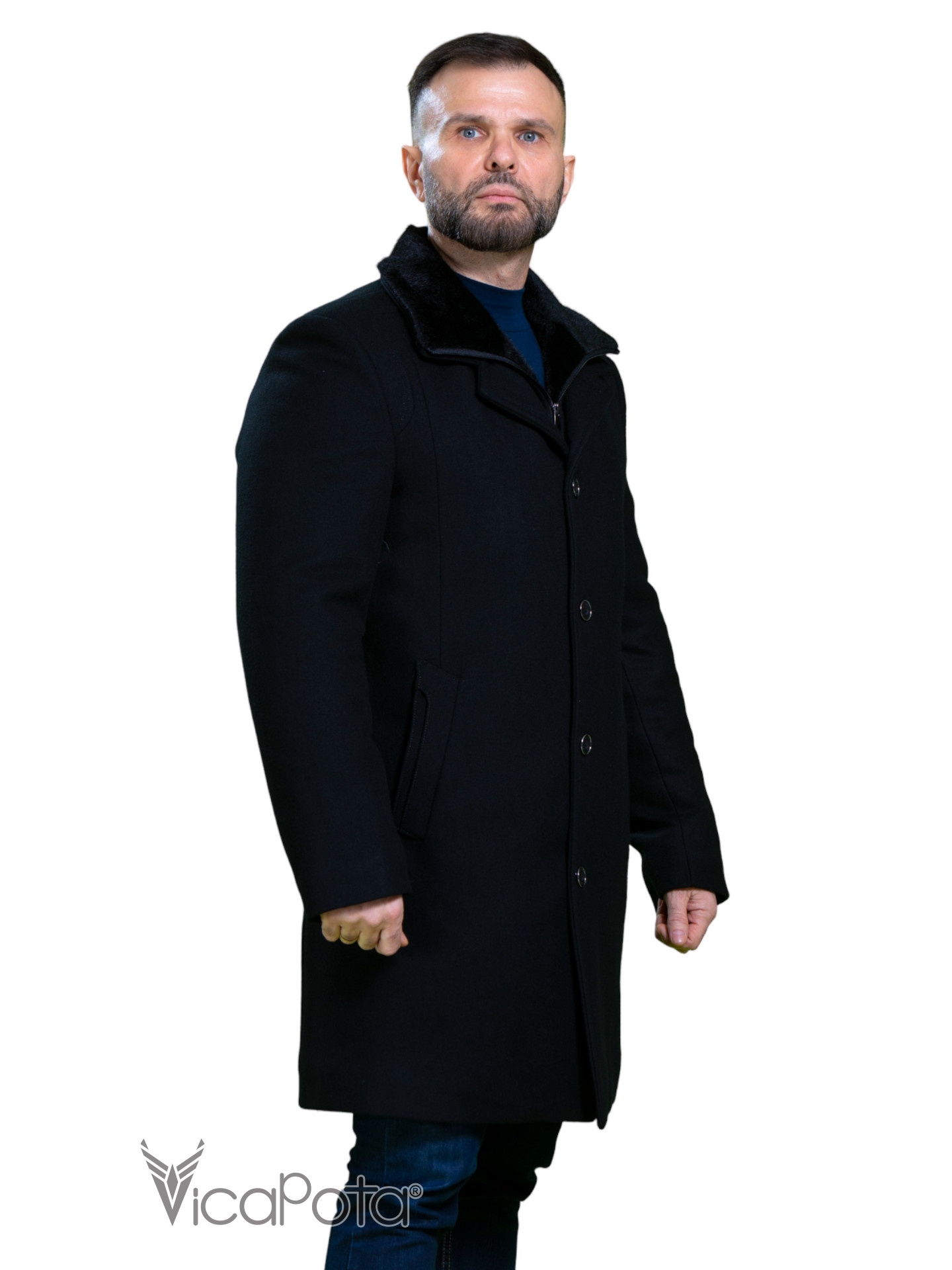 Стильное однобортное мужское пальто чёрного цвета. Приталенный силуэт, съёмная стойка с меховым воротником под нерпу, врезные карманы. Застёжка фирменные пуговицы. Подкладка выстегана с Slimtex 100 и скомбинирована с мехом по спинке.. Пальто с шлицей. Стиль классика, кэжул.