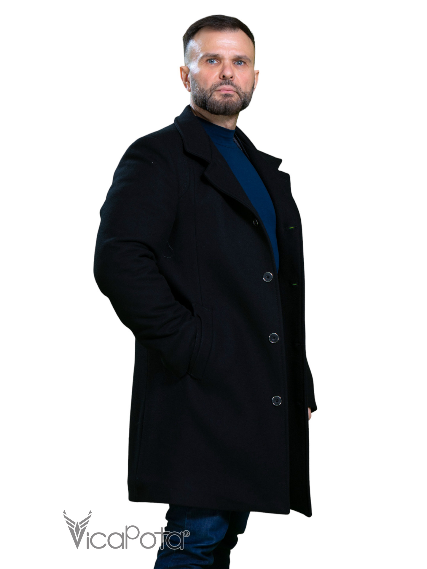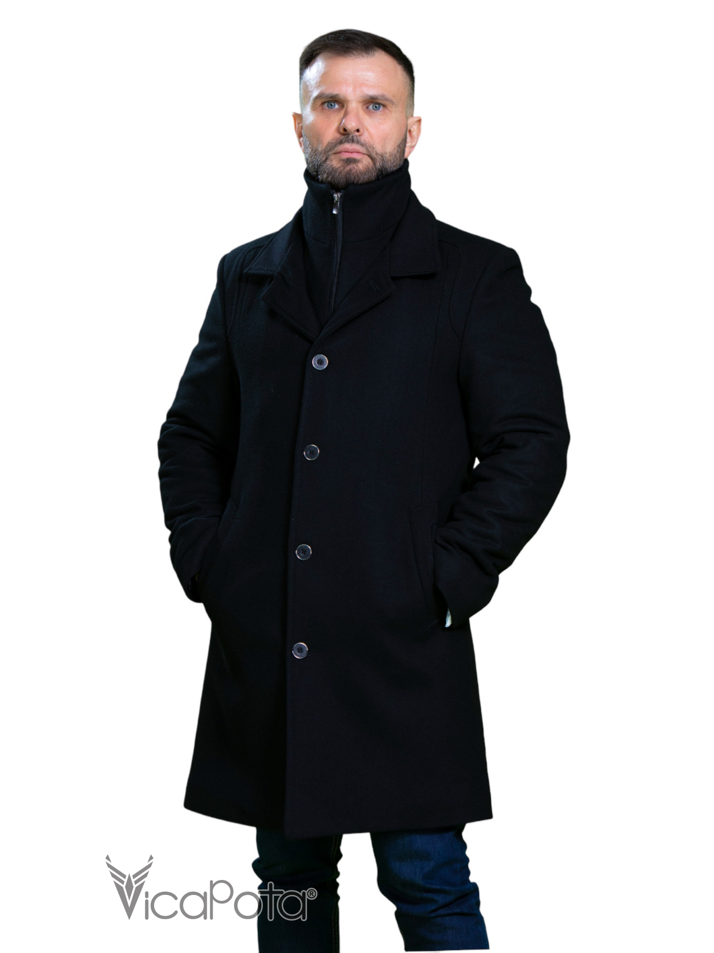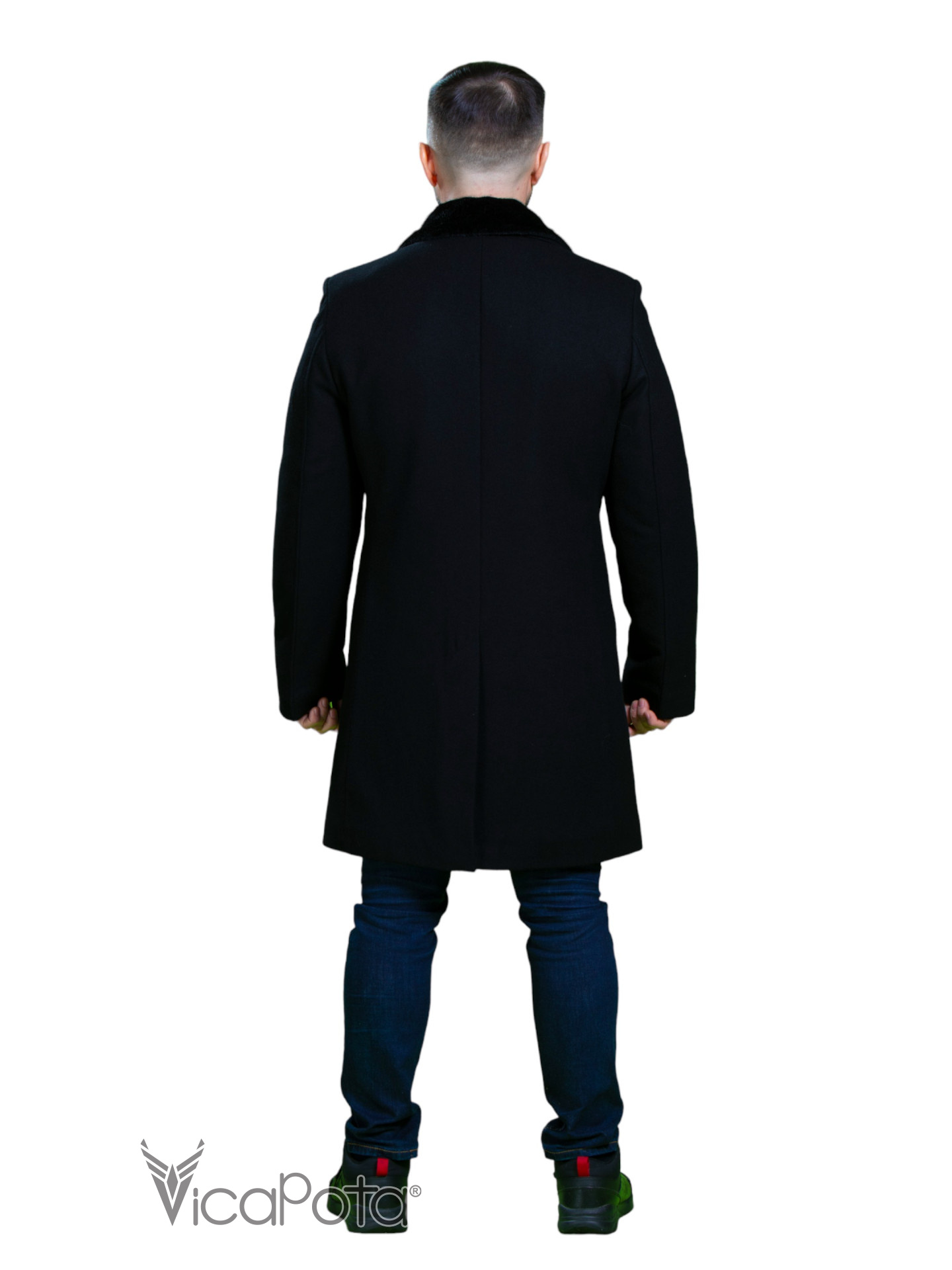 Стильное однобортное мужское пальто чёрного цвета. Приталенный силуэт, съёмная стойка с меховым воротником под нерпу, врезные карманы. Застёжка фирменные пуговицы. Подкладка выстегана с Slimtex 100 и скомбинирована с мехом по спинке.. Пальто с шлицей. Стиль классика, кэжул.