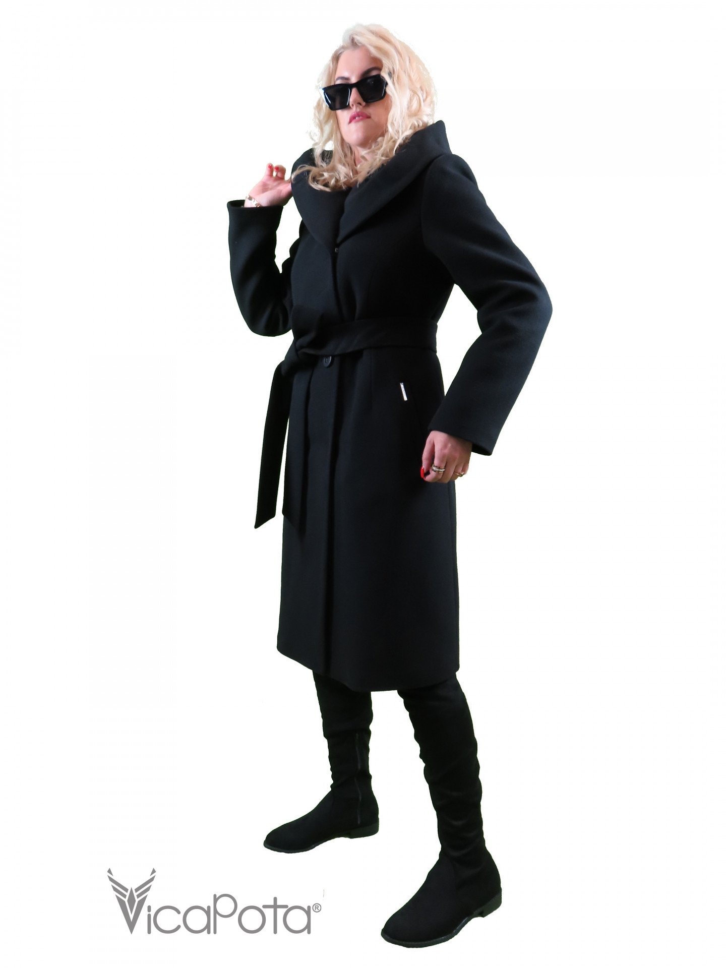 Утеплённое пальто чёрного цвета, приталенного фасона с капюшоном, длина 100 см. Застёжка на скрытых металлических кнопках и пуговицах, карманы прорезные с листочкой. Пояс идет в комплекте. Утеплённие SLIMTEX (СЛИМТЕКС) - современный тонкий утеплитель, созданный с применением сверхтонкого волокна. Состав: кашемир турция (70%-шерсть, 20%-полиэстер, 10%-вискоза), подкладка сатин - жаккард. Растяжимость: (0%)