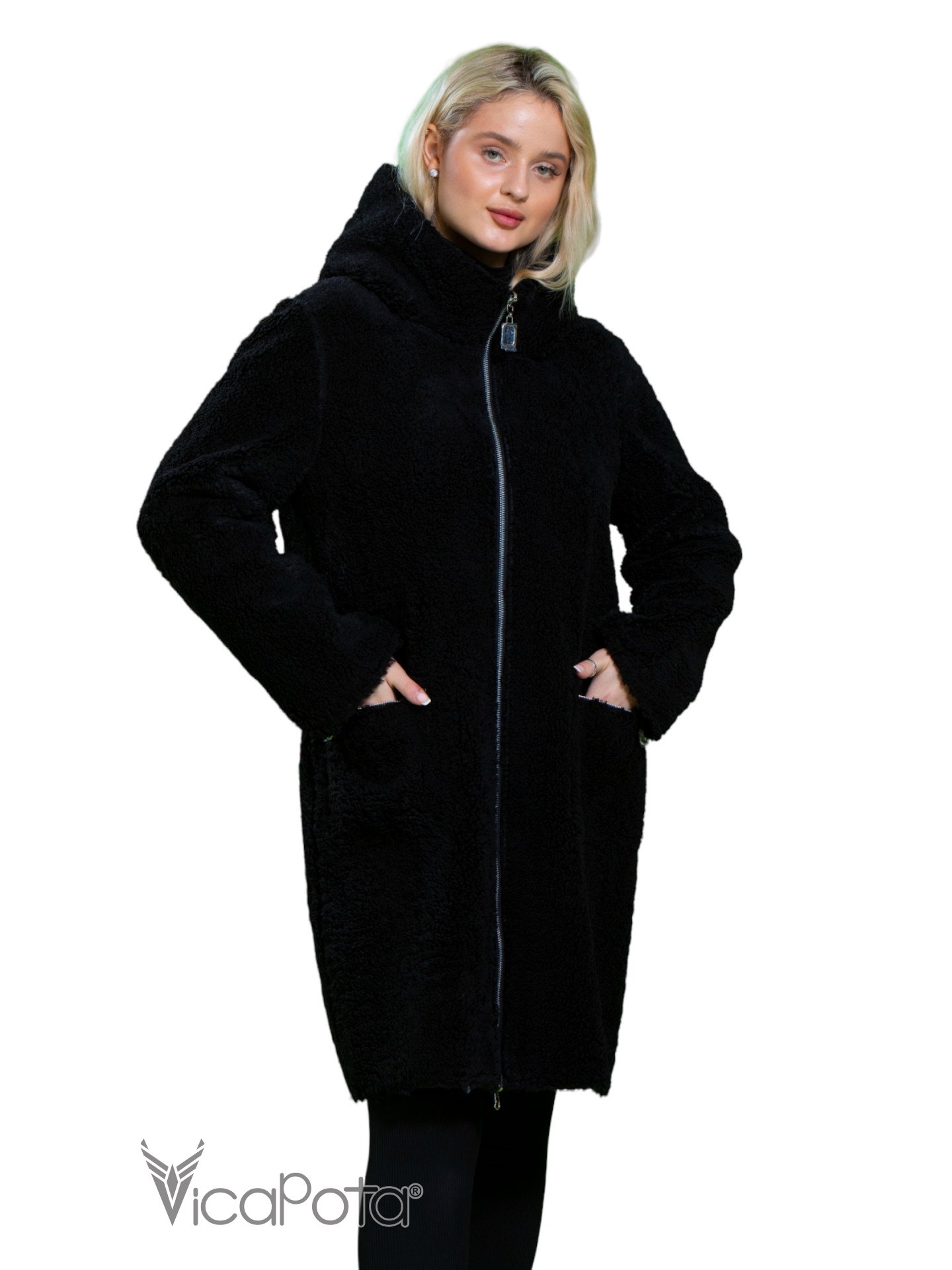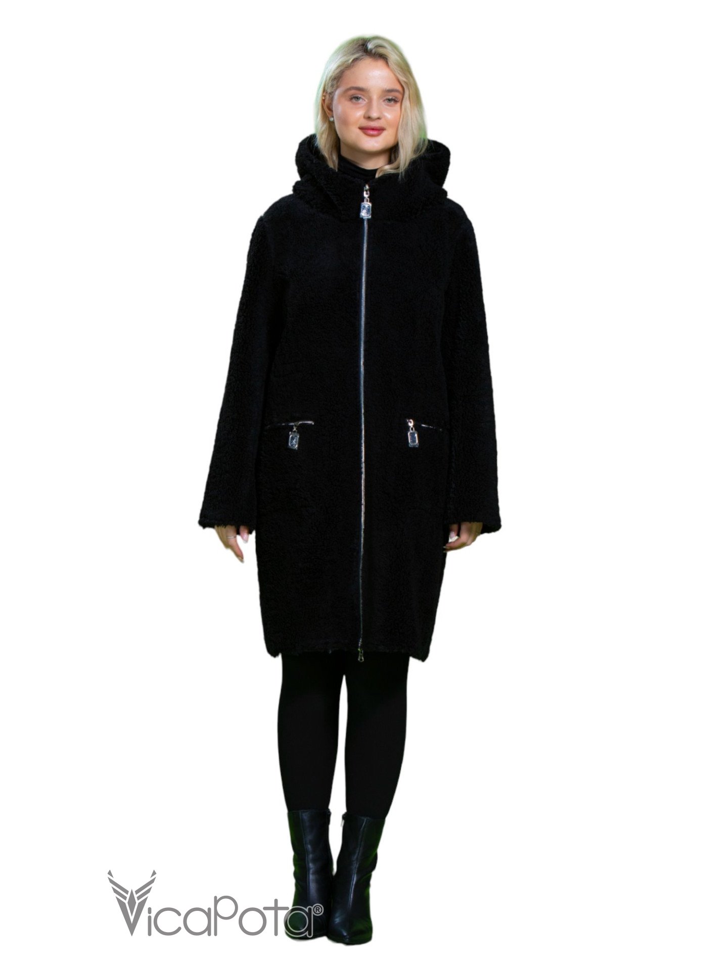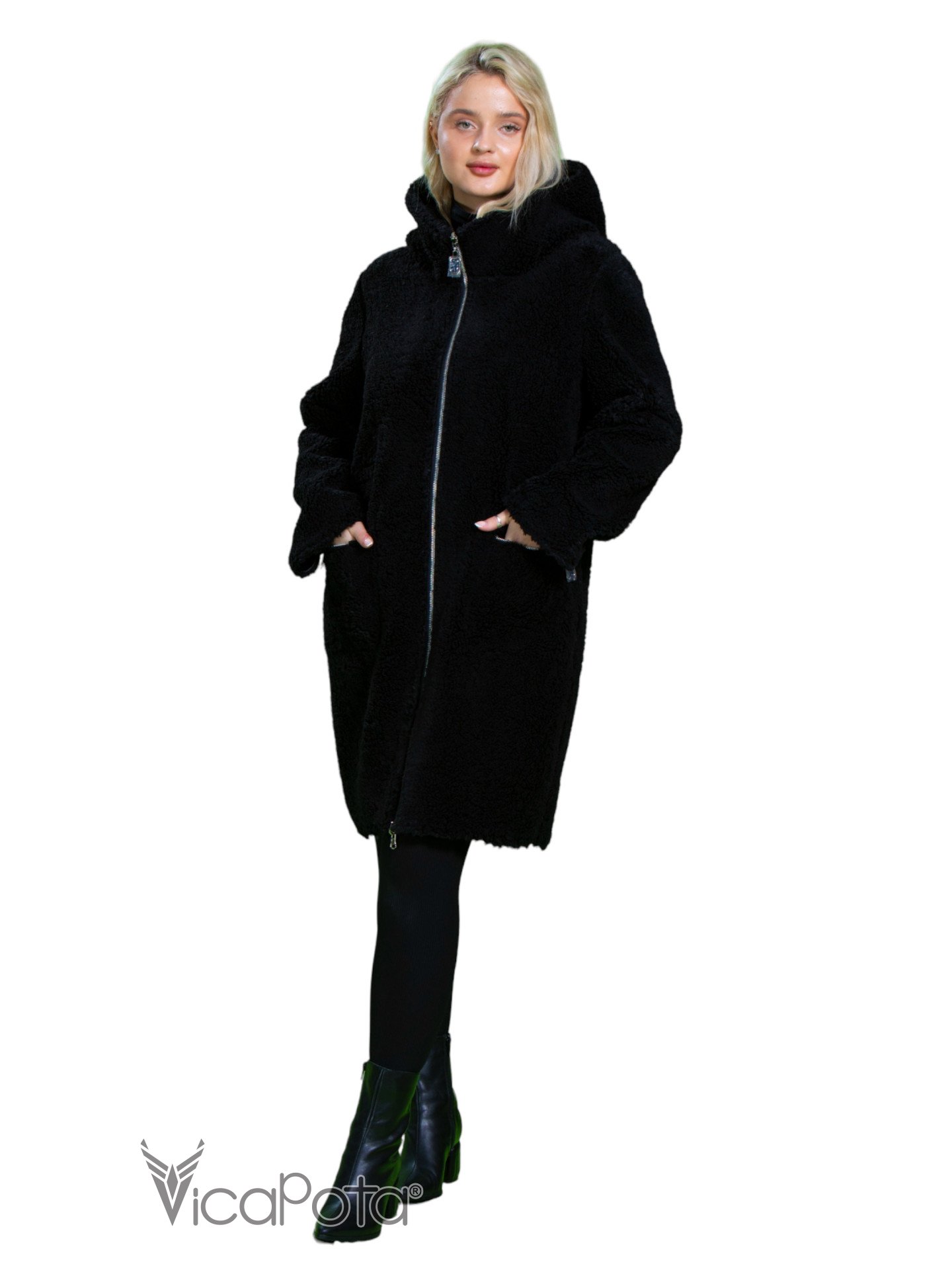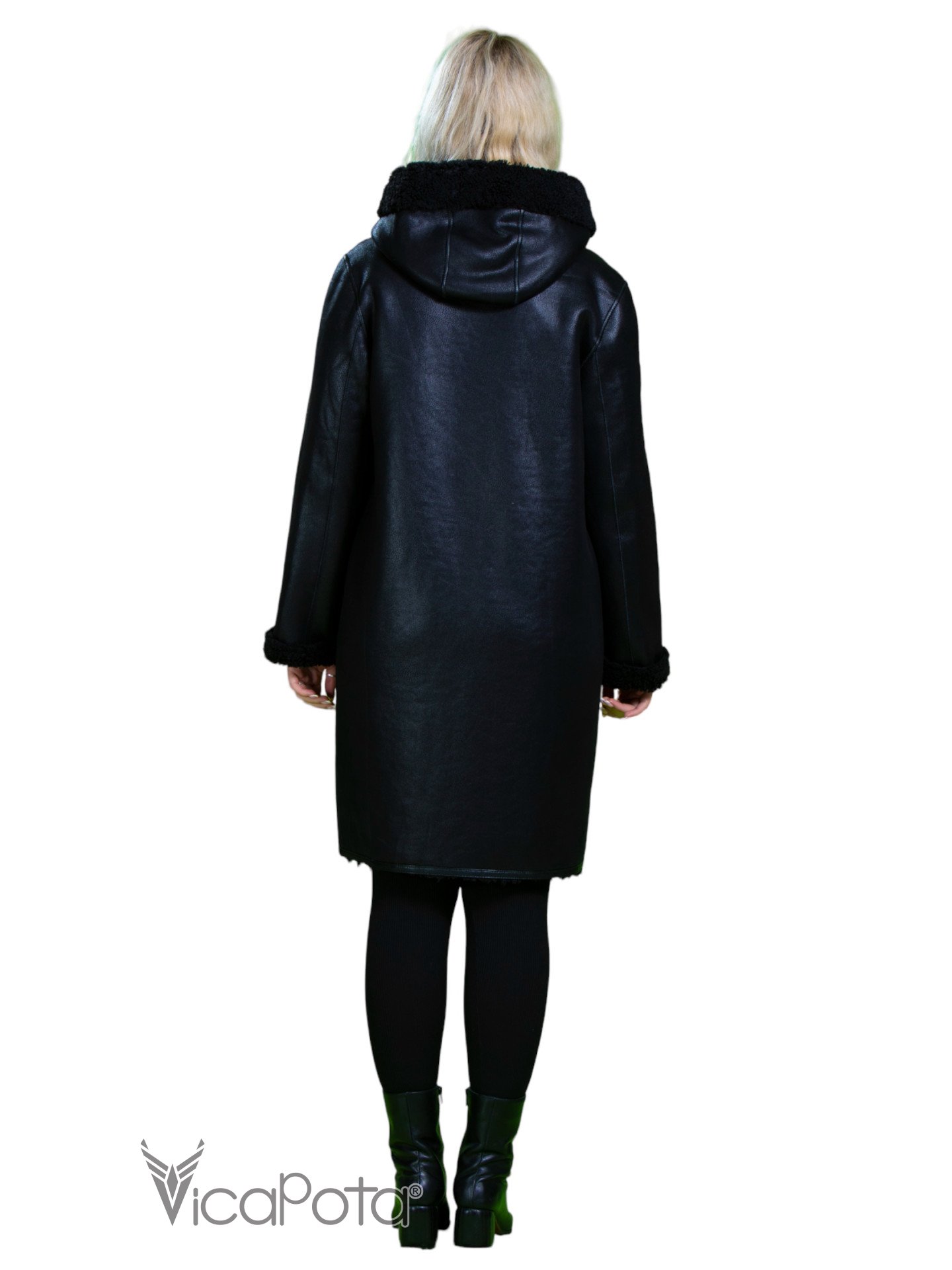 Новинка сезону сучасна й стильна двостороння еко дублянка-куртка чорного кольору. Одна сторона гладка сільця, інша сторона шубка(шерпа). Модель прямого покрою на центральній змійці, втачне плече. Кишені накладні на гладкій стороні, на звороті - урізні на змійках. Комір стійка перехідний у каптур, каптур на кулісці. Довжина 95 см , рукав з підворотом. Дублянка легка, м'яка, комфортна в носку. Дану модель можна носити холодної навесні, восени й теплою зимою. Склад: polyester/sherpa