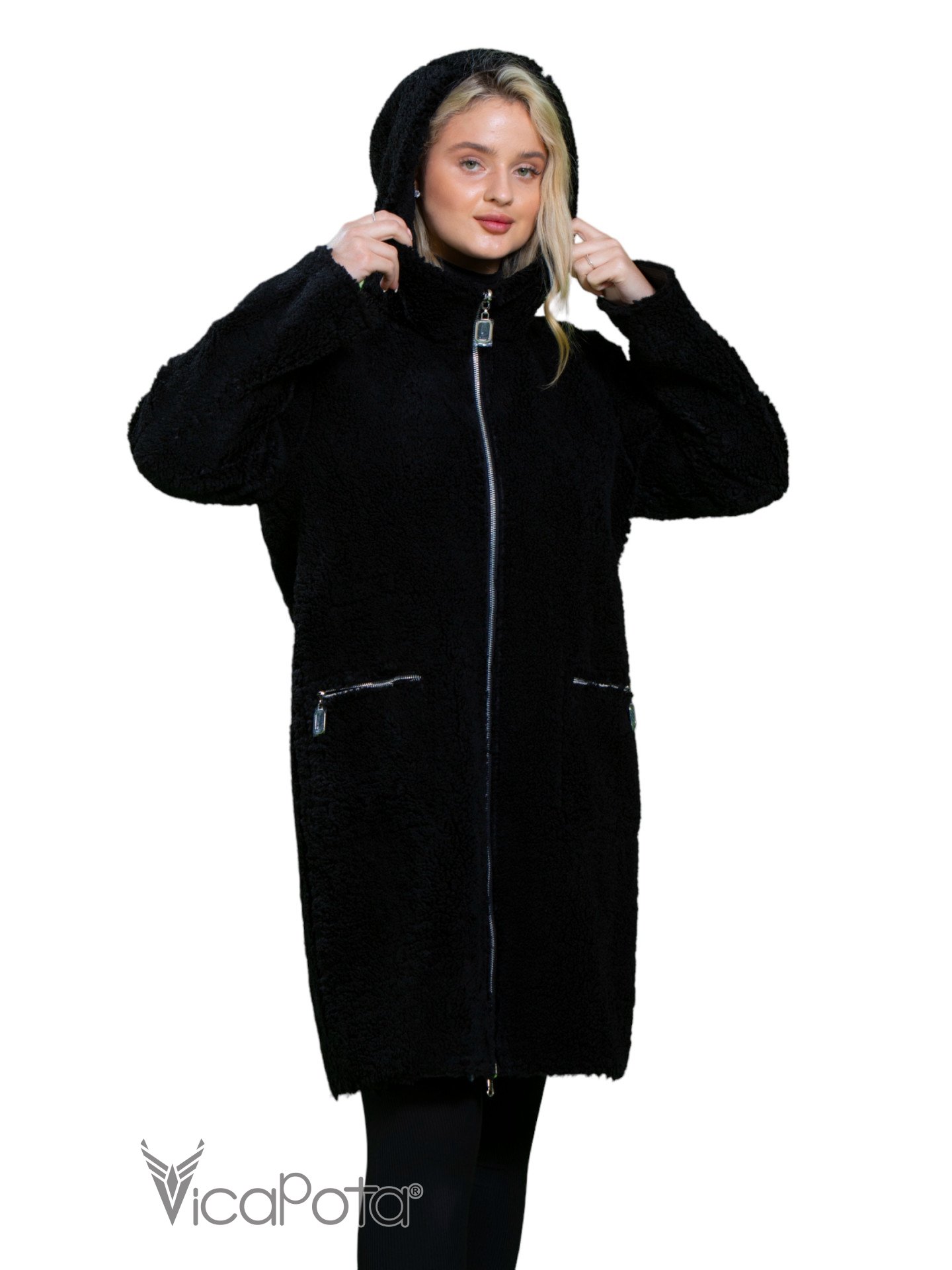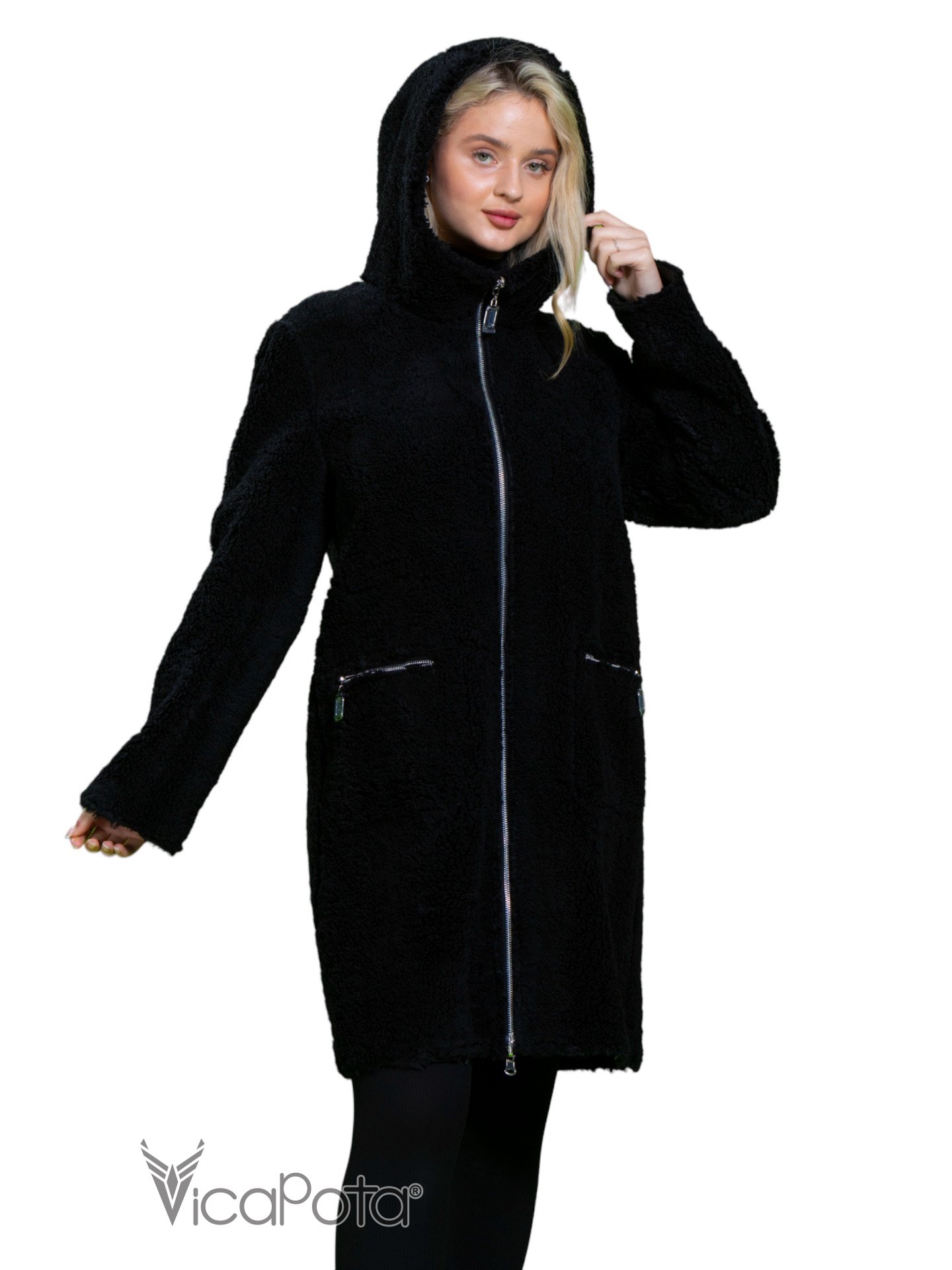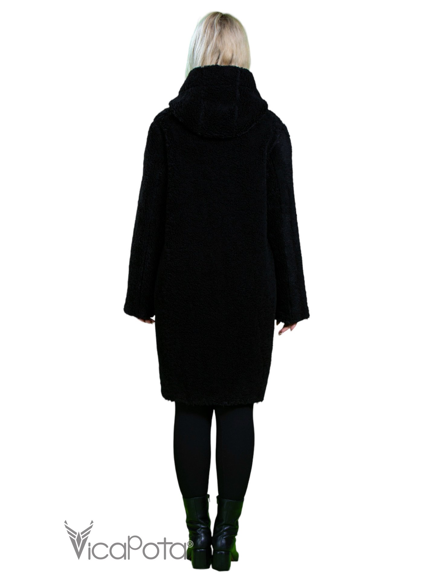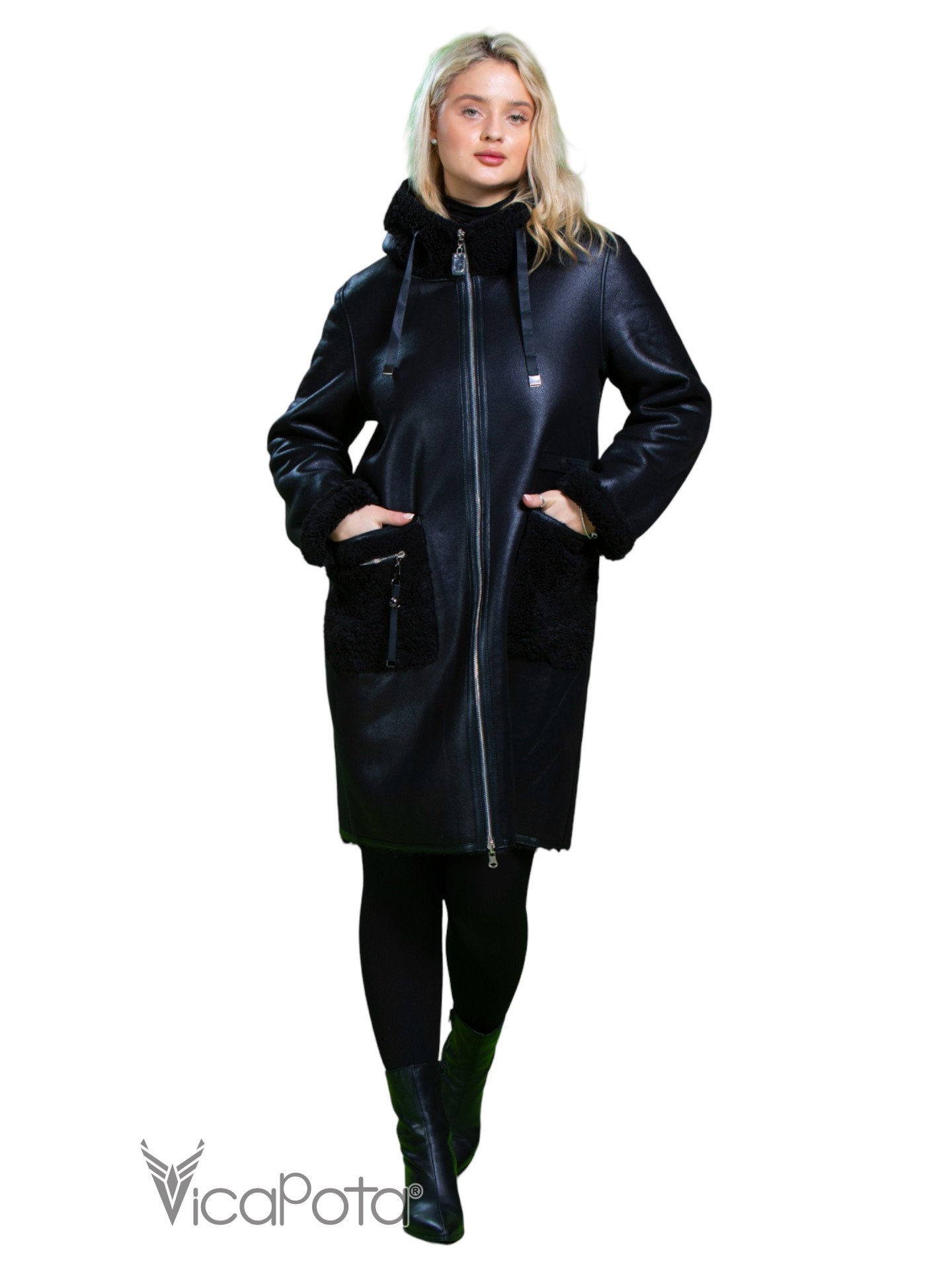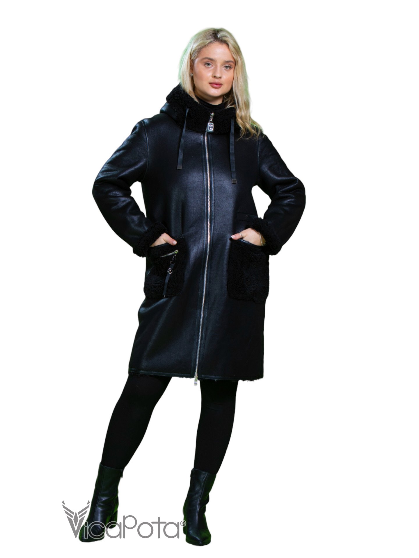 Новинка сезону сучасна й стильна двостороння еко дублянка-куртка чорного кольору. Одна сторона гладка сільця, інша сторона шубка(шерпа). Модель прямого покрою на центральній змійці, втачне плече. Кишені накладні на гладкій стороні, на звороті - урізні на змійках. Комір стійка перехідний у каптур, каптур на кулісці. Довжина 95 см , рукав з підворотом. Дублянка легка, м'яка, комфортна в носку. Дану модель можна носити холодної навесні, восени й теплою зимою. Склад: polyester/sherpa