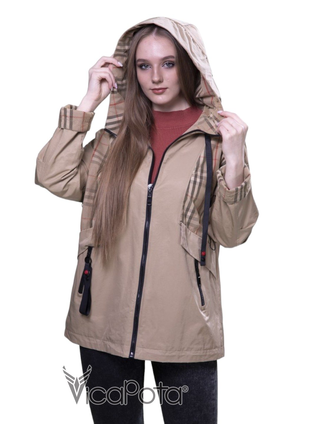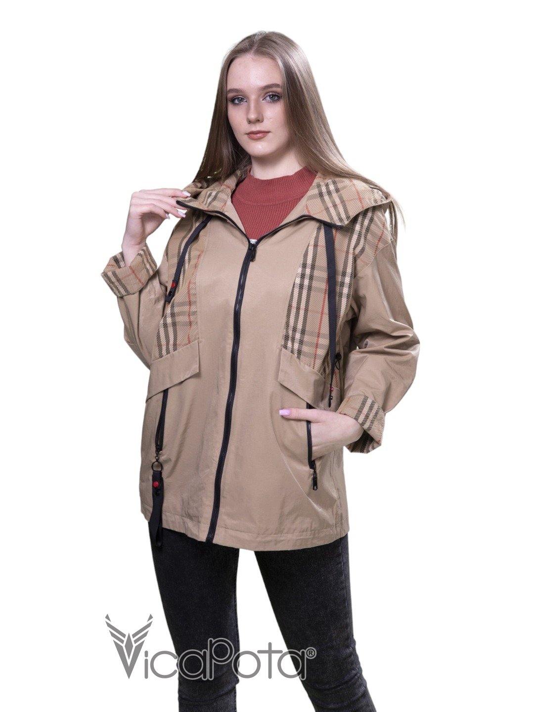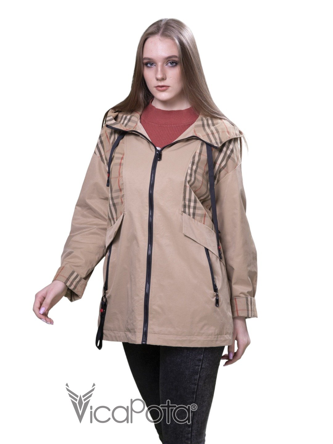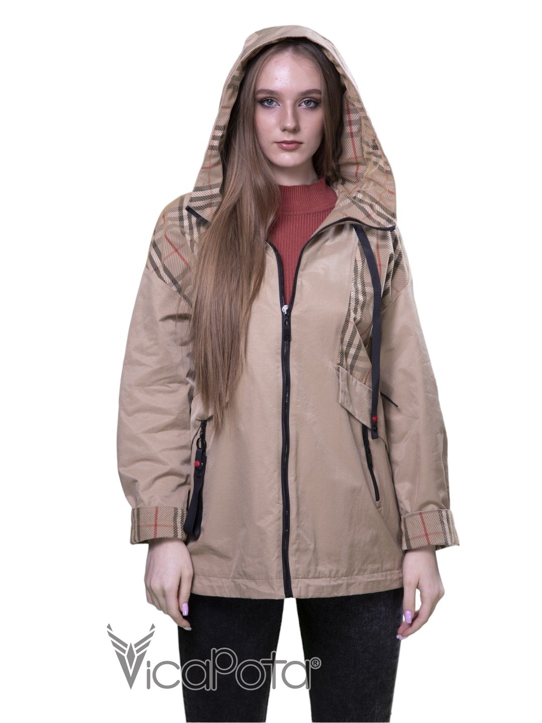 ✅ рукави та планка з клітчастою підкладкою.